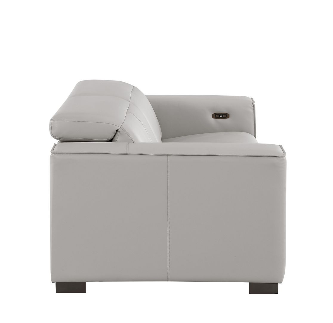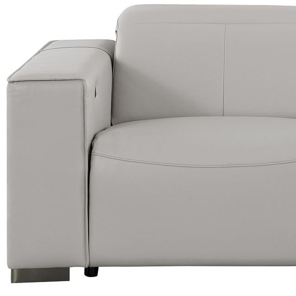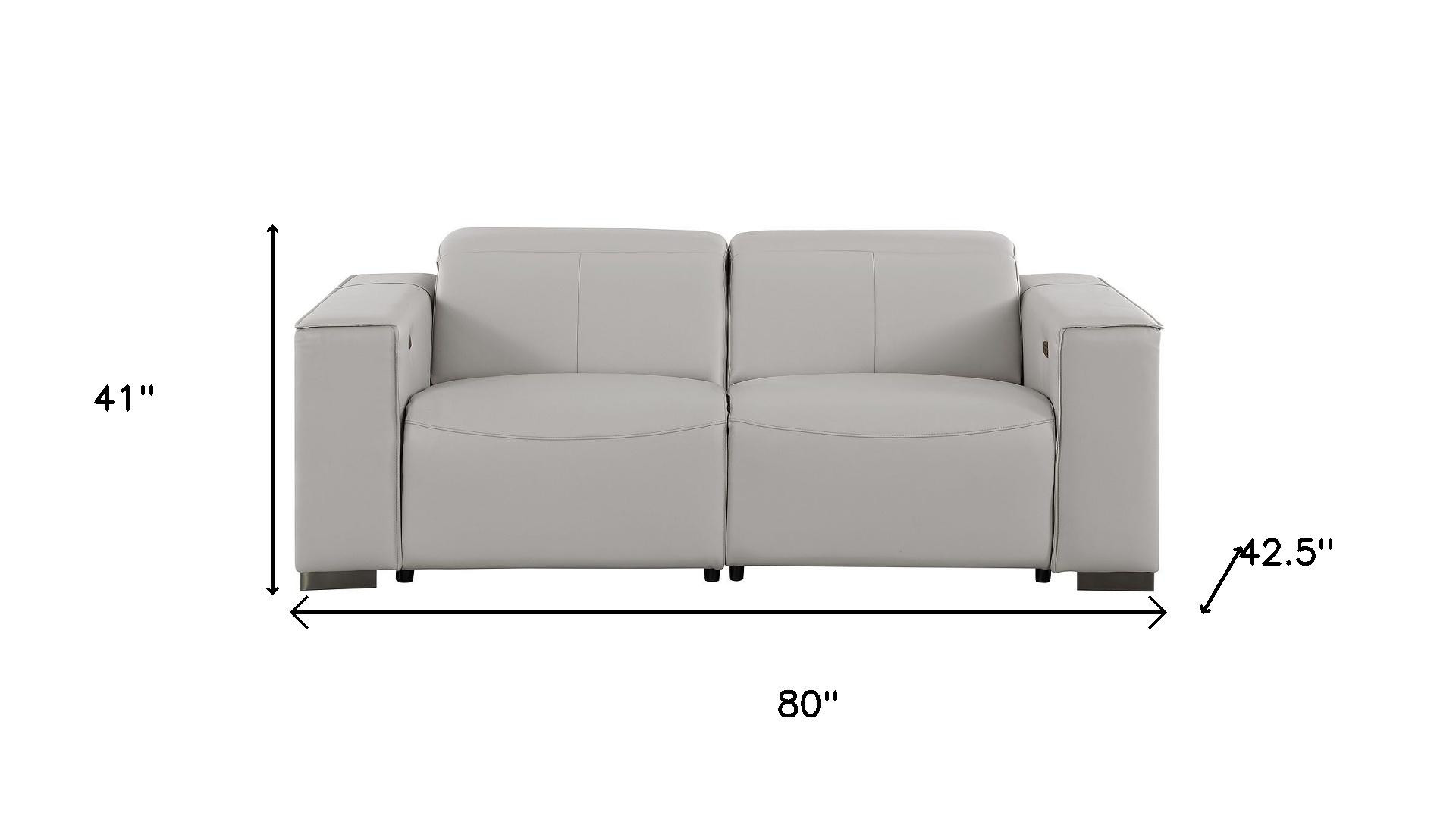 An interior designer's dream, this buttery soft high grade leather 80-inch light gray and brown leather power reclining loveseat will bring just the right touch to your space. The high grade premium leather used makes your lounging luxuriously comfortable and adds an elegant appeal to your space. More than just a loveseat, this piece reclines to bring you the ultimate in rest and relaxation. Square arms offer a comfy place to rest and give this piece some interest and shape. Brown solid wood legs effortlessly elevate the room and add a touch of contemporary design. A great showpiece for your room, this sofa is a must have. 41.00-inch h x 80.00-inch w x 42.50-inch d.