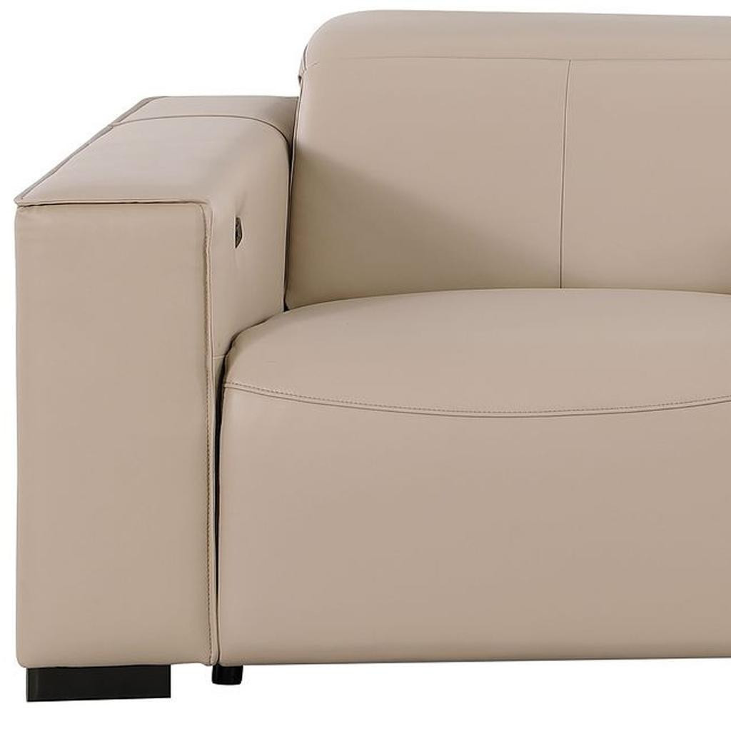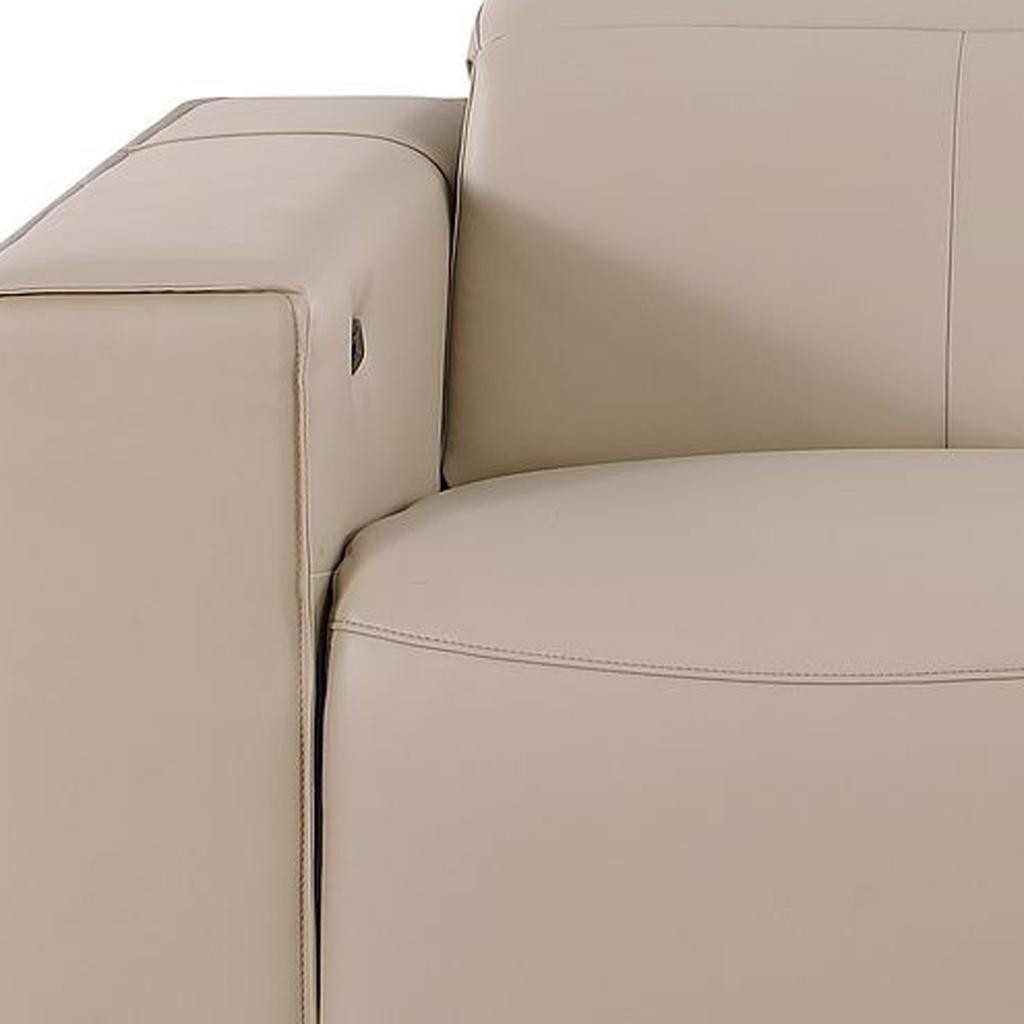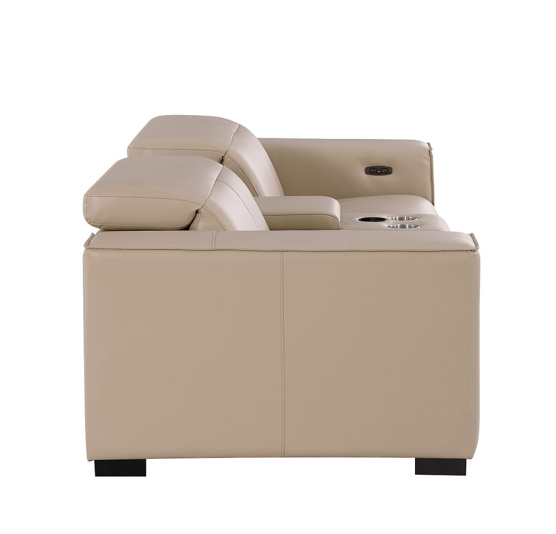 An interior designer's dream, this buttery soft high grade leather 93-inch cream and brown leather power reclining loveseat with storage will bring just the right touch to your space. The high grade premium leather used makes your lounging luxuriously comfortable and adds an elegant appeal to your space. Square arms offer a comfy place to rest and give this piece some interest and shape. Brown solid wood legs effortlessly elevate the room and add a touch of contemporary design. A great showpiece for your room, this sofa is a must have. 41.00-inch h x 93.00-inch w x 42.50-inch d.