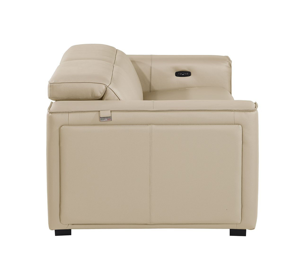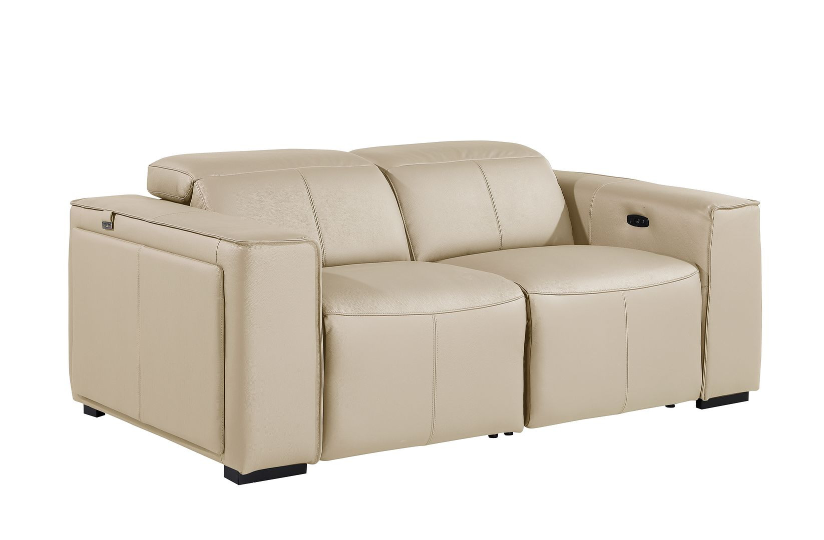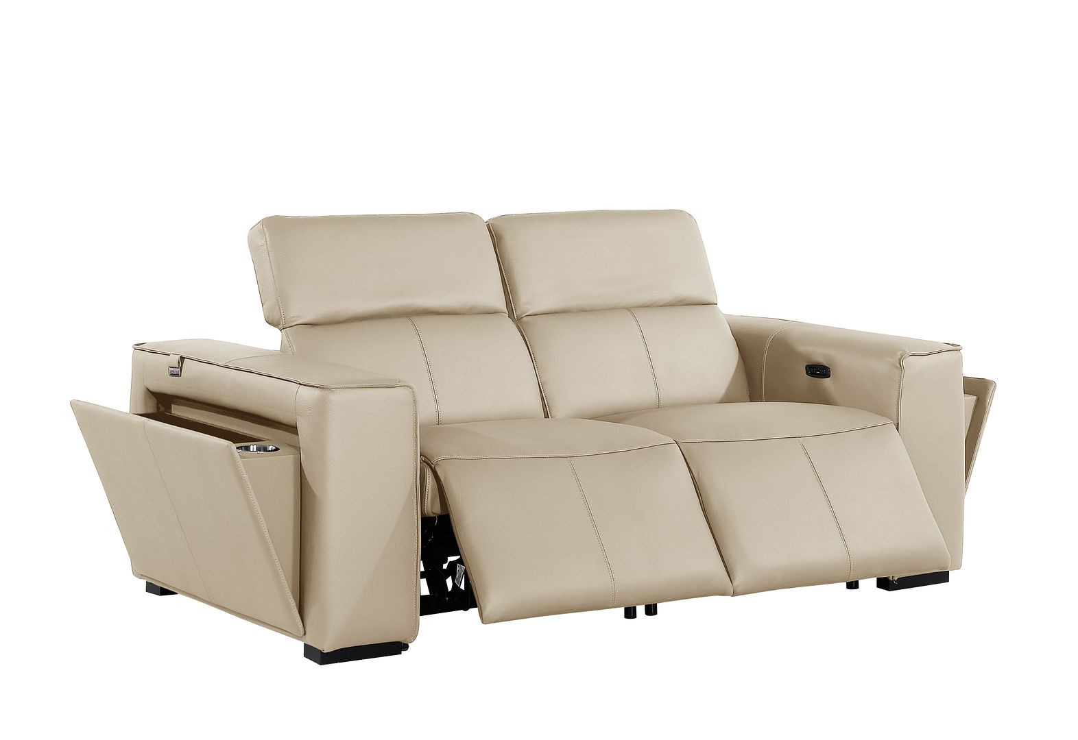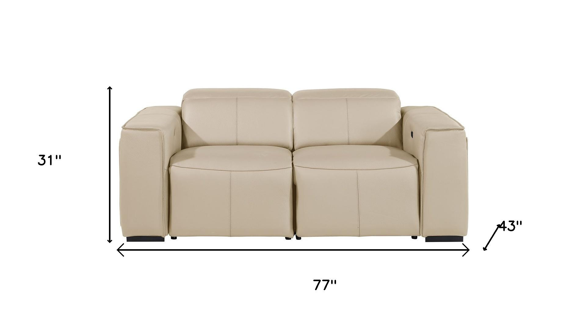 Made of top quality, supple leather, this 77-inch cream and brown italian leather power reclining loveseat with storage will be the star of your space. The high grade premium leather used makes your lounging luxuriously comfortable and adds an elegant appeal to your space. Square arms offer a comfy place to rest and give this piece some interest and shape. Brown solid wood legs effortlessly elevate the room and add a touch of contemporary design. A great showpiece for your room, this sofa is a must have. 31.00-inch h x 77.00-inch w x 43.00-inch d.