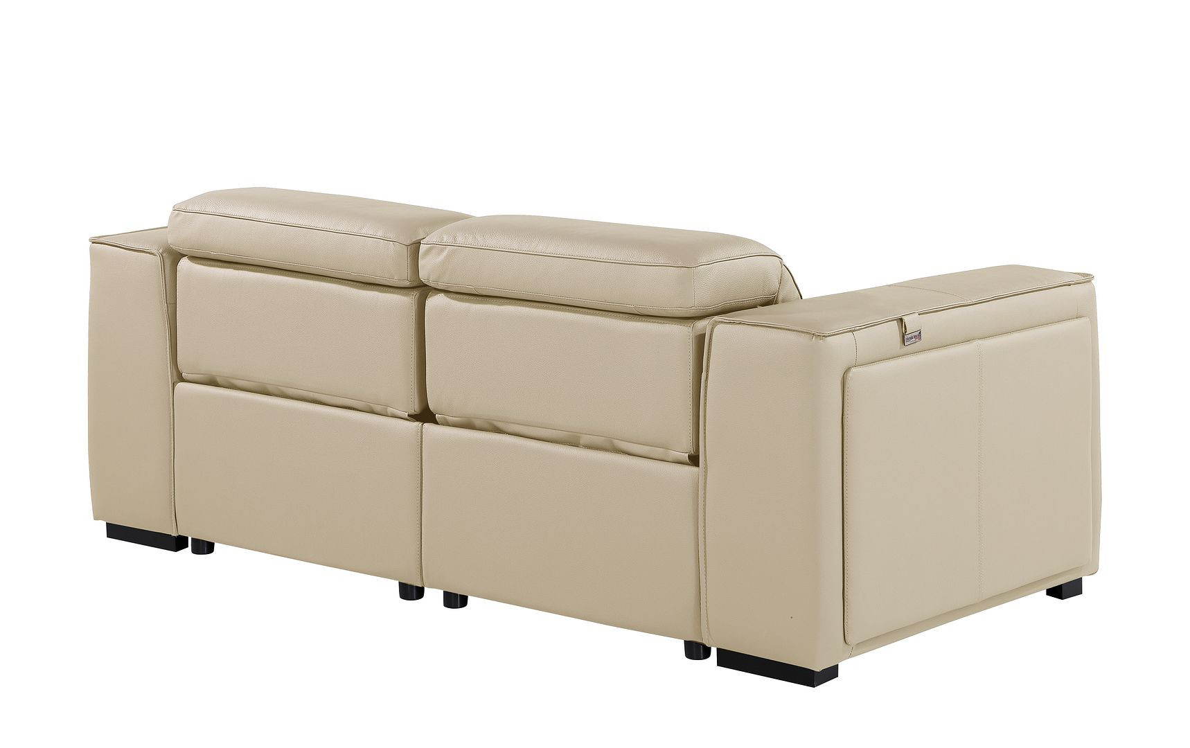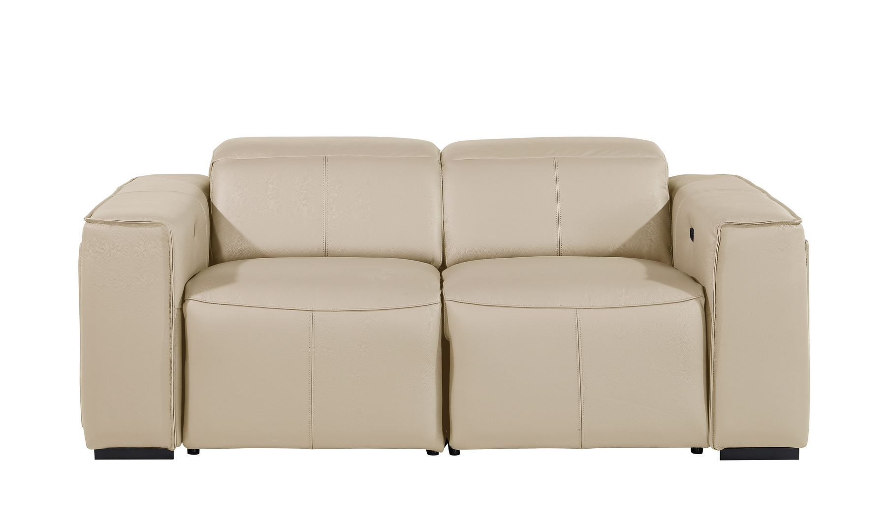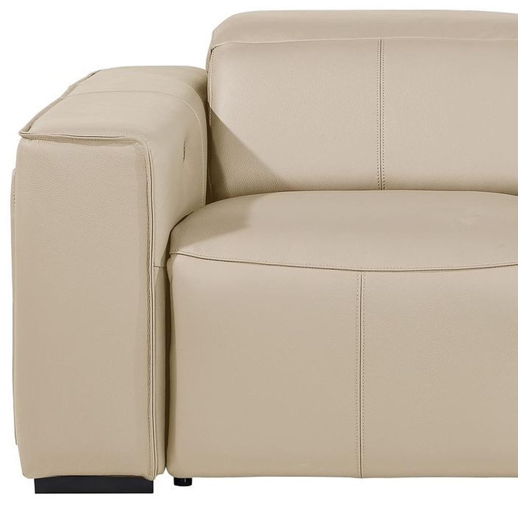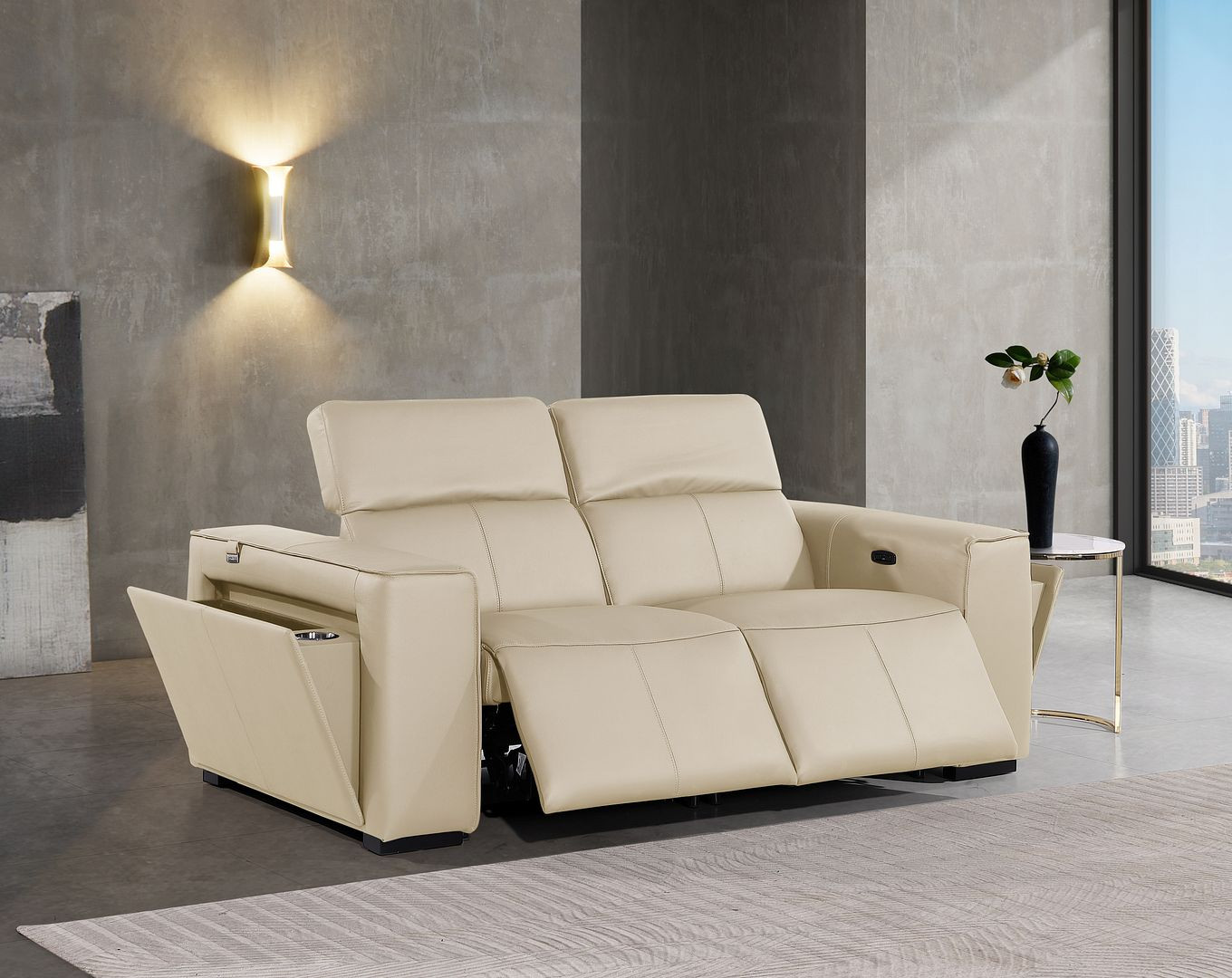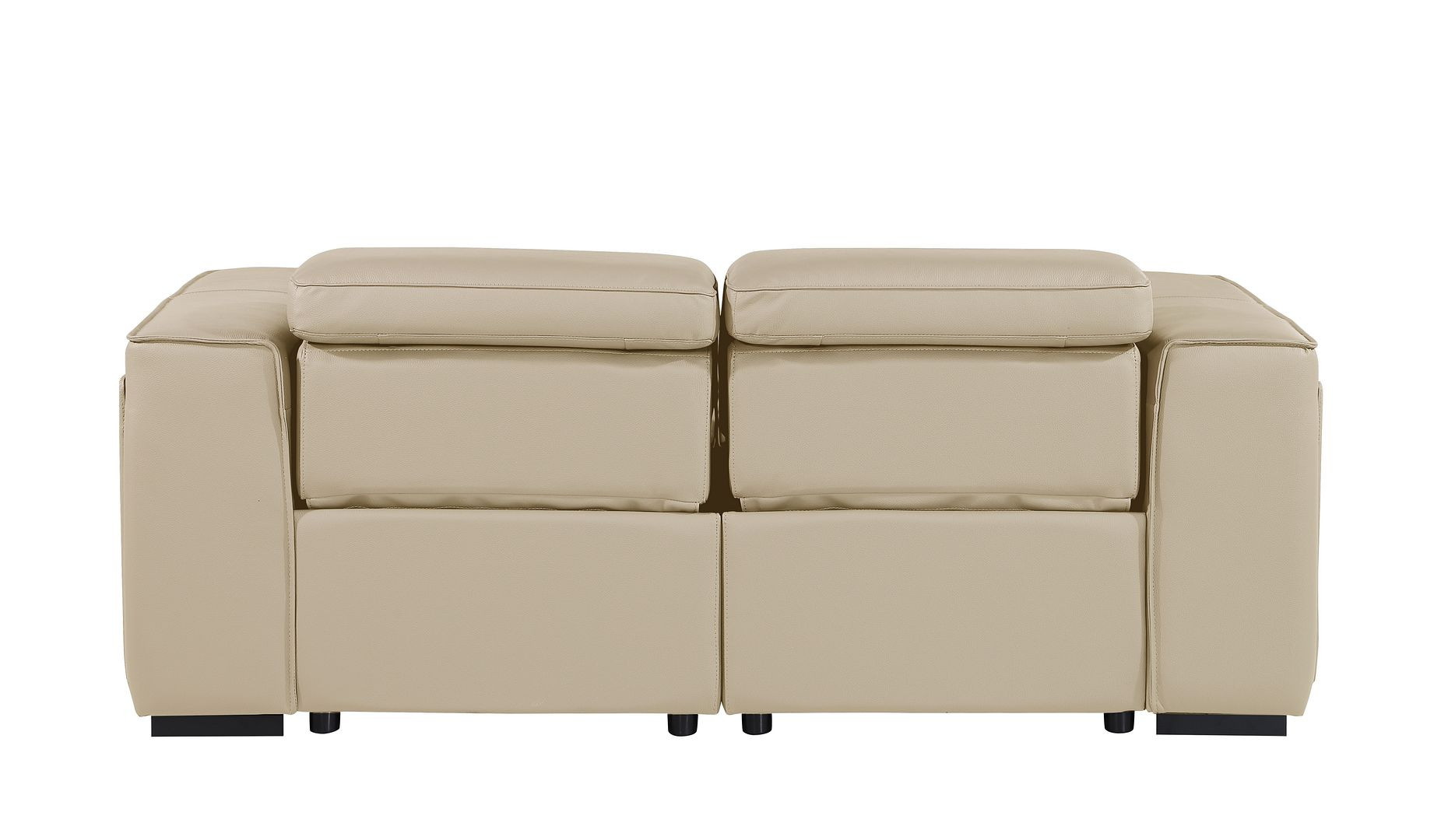 Made of top quality, supple leather, this 77-inch cream and brown italian leather power reclining loveseat with storage will be the star of your space. The high grade premium leather used makes your lounging luxuriously comfortable and adds an elegant appeal to your space. Square arms offer a comfy place to rest and give this piece some interest and shape. Brown solid wood legs effortlessly elevate the room and add a touch of contemporary design. A great showpiece for your room, this sofa is a must have. 31.00-inch h x 77.00-inch w x 43.00-inch d.