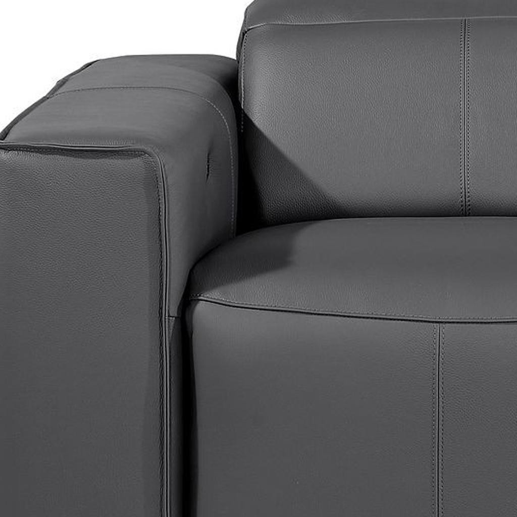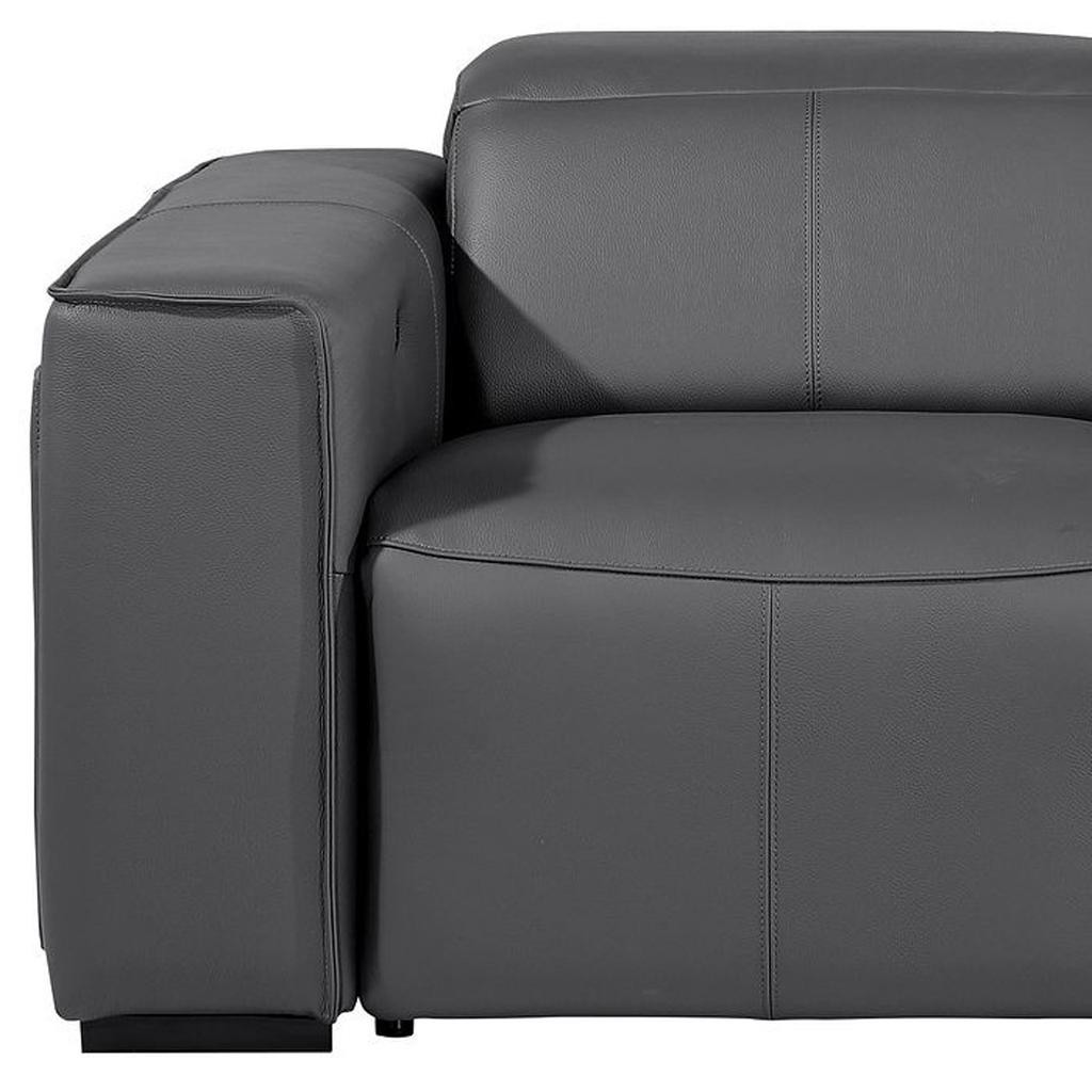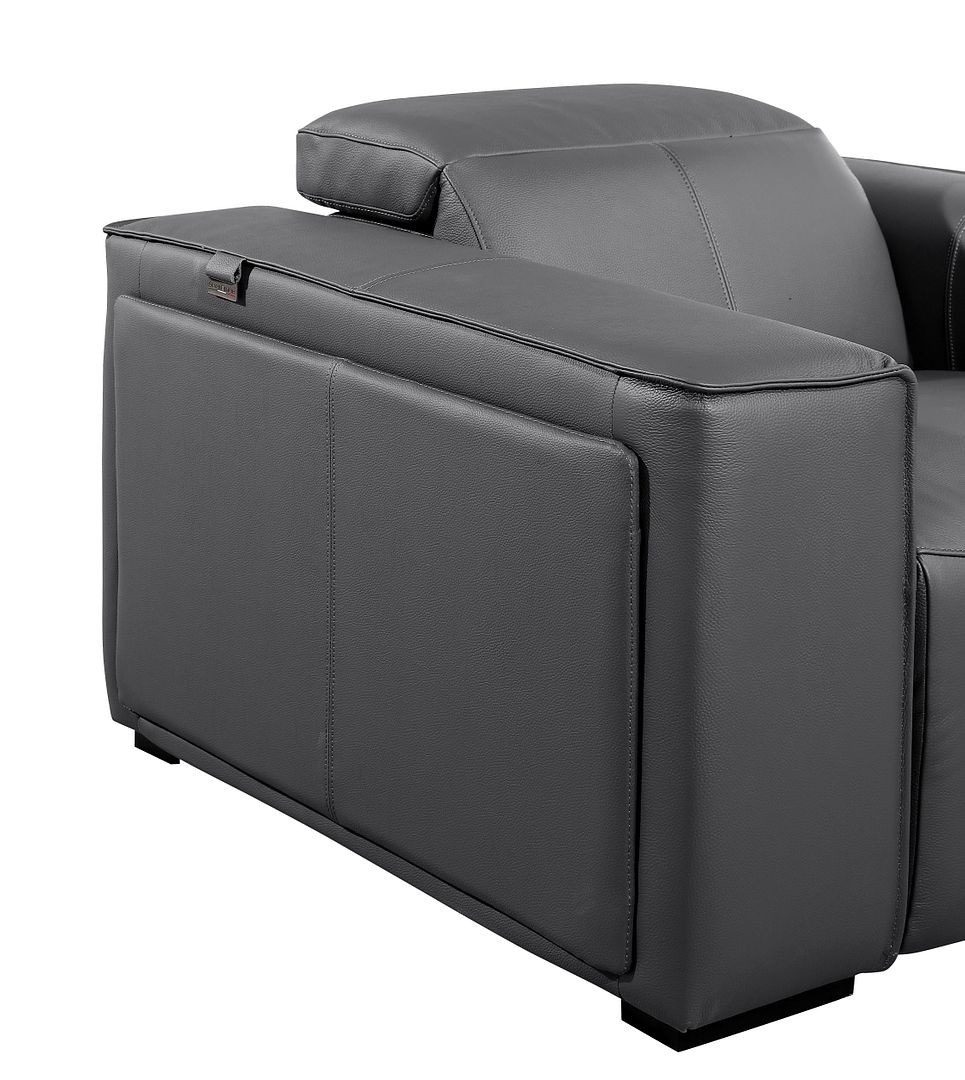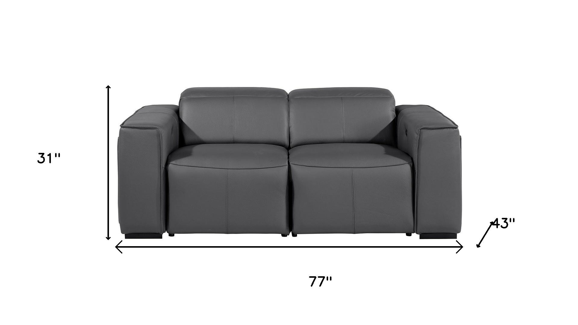 Superior construction from fabulously soft and high grade leather gives this 77-inch dark gray and brown italian leather power reclining loveseat with storage a leg up on the competition. The high grade premium leather used makes your lounging luxuriously comfortable and adds an elegant appeal to your space. Square arms offer a comfy place to rest and give this piece some interest and shape. Brown solid wood legs effortlessly elevate the room and add a touch of contemporary design. A great showpiece for your room, this sofa is a must have. 31.00-inch h x 77.00-inch w x 43.00-inch d.