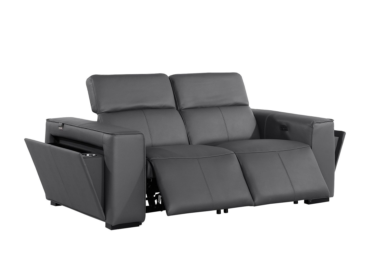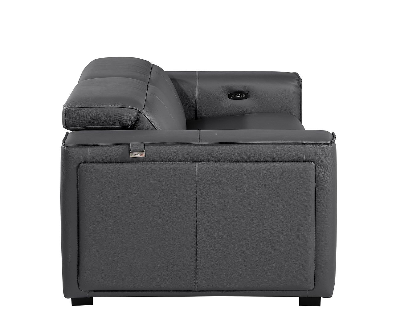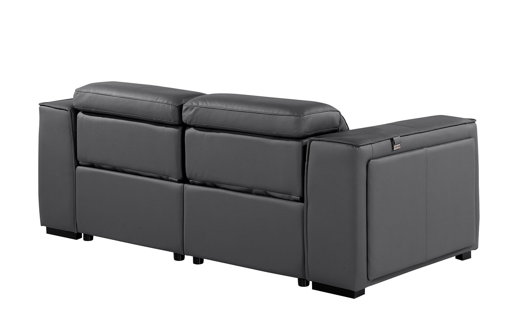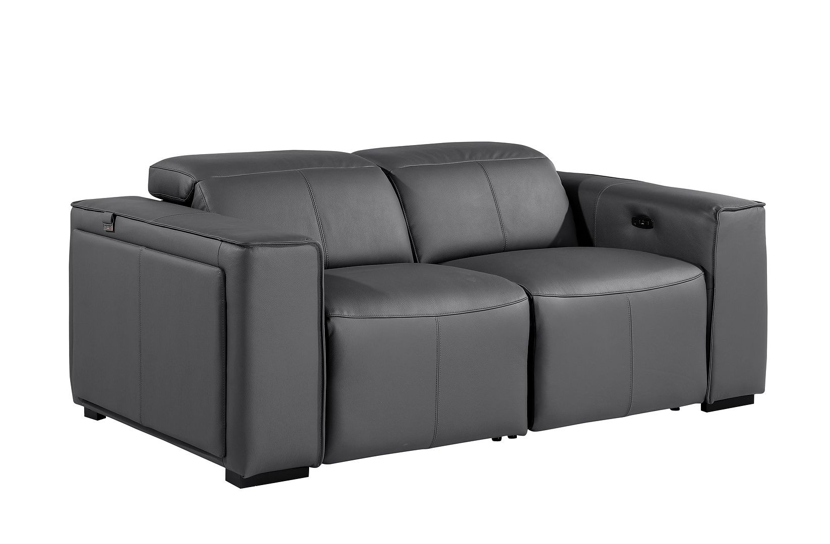 Superior construction from fabulously soft and high grade leather gives this 77-inch dark gray and brown italian leather power reclining loveseat with storage a leg up on the competition. The high grade premium leather used makes your lounging luxuriously comfortable and adds an elegant appeal to your space. Square arms offer a comfy place to rest and give this piece some interest and shape. Brown solid wood legs effortlessly elevate the room and add a touch of contemporary design. A great showpiece for your room, this sofa is a must have. 31.00-inch h x 77.00-inch w x 43.00-inch d.