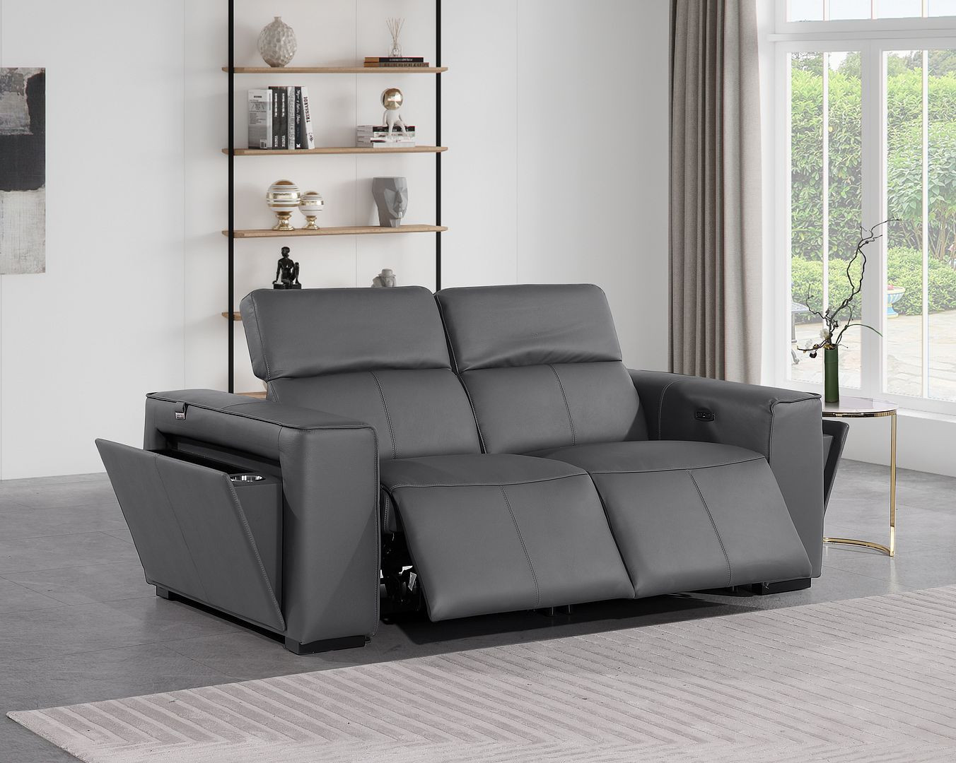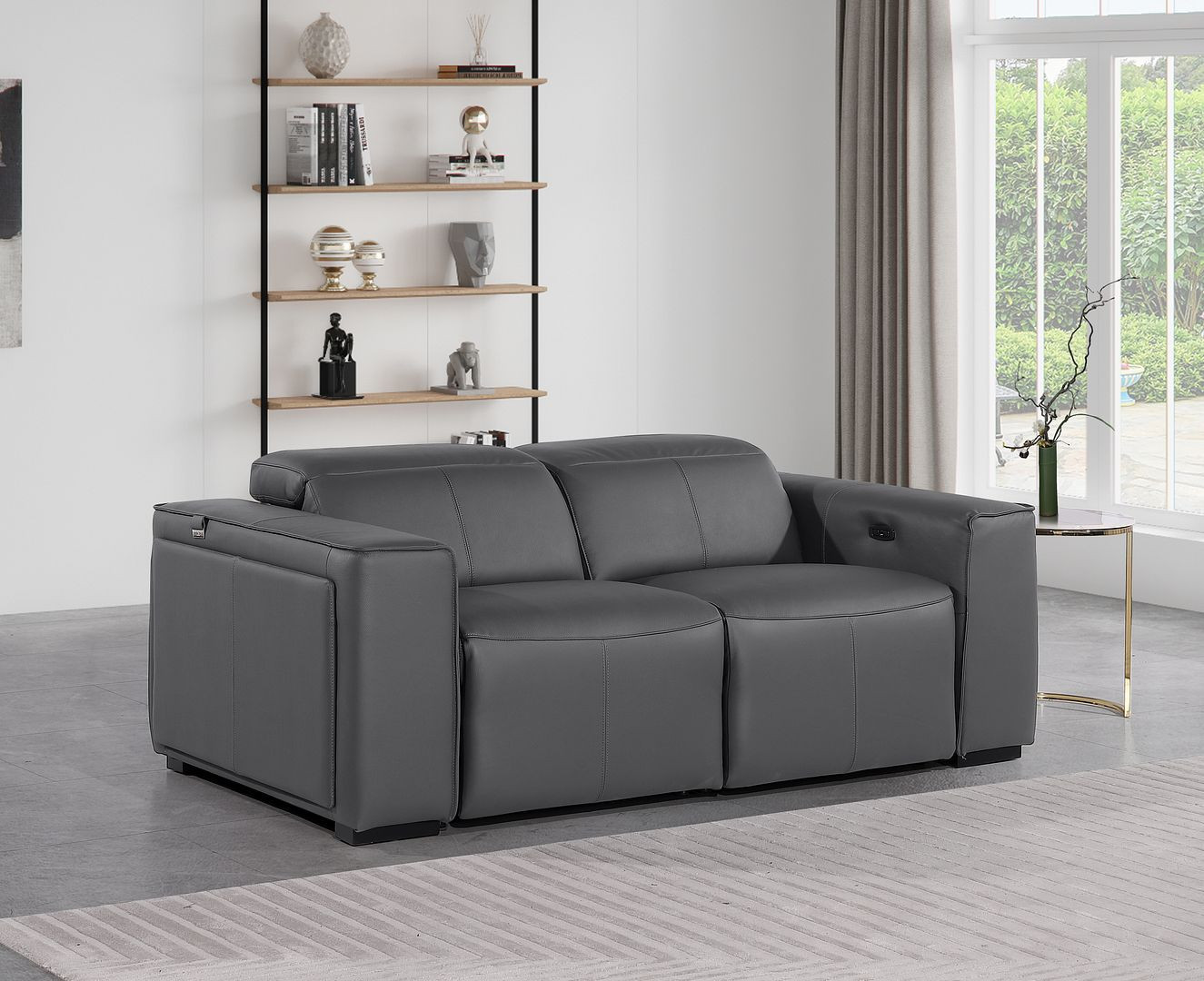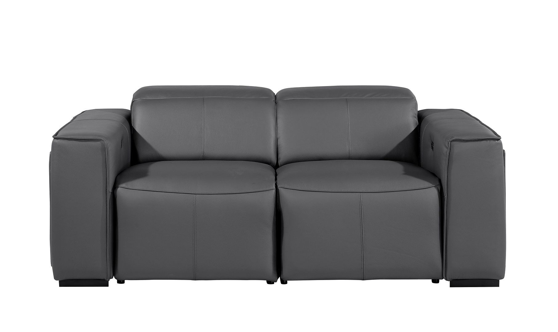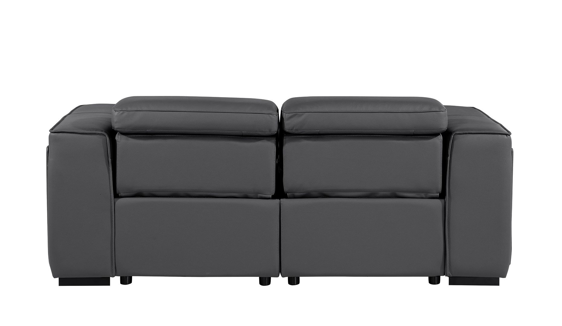 Superior construction from fabulously soft and high grade leather gives this 77-inch dark gray and brown italian leather power reclining loveseat with storage a leg up on the competition. The high grade premium leather used makes your lounging luxuriously comfortable and adds an elegant appeal to your space. Square arms offer a comfy place to rest and give this piece some interest and shape. Brown solid wood legs effortlessly elevate the room and add a touch of contemporary design. A great showpiece for your room, this sofa is a must have. 31.00-inch h x 77.00-inch w x 43.00-inch d.