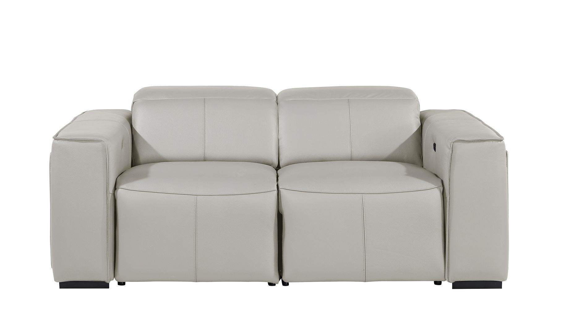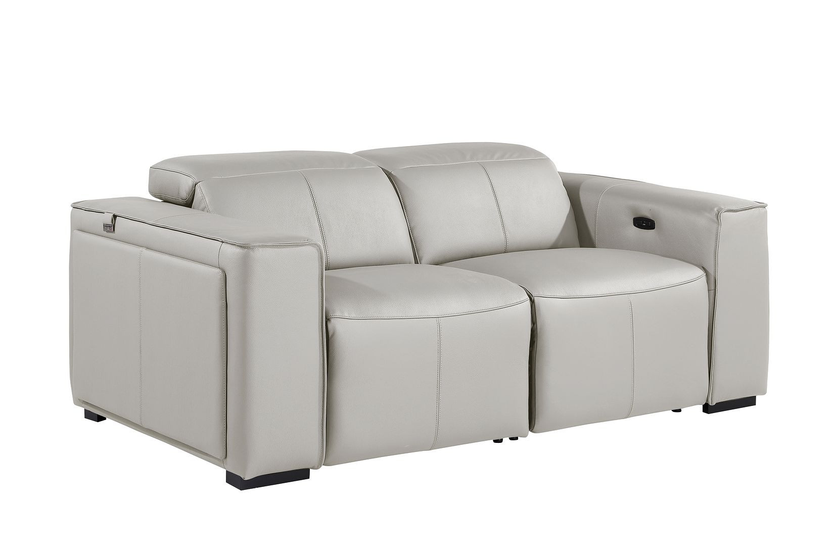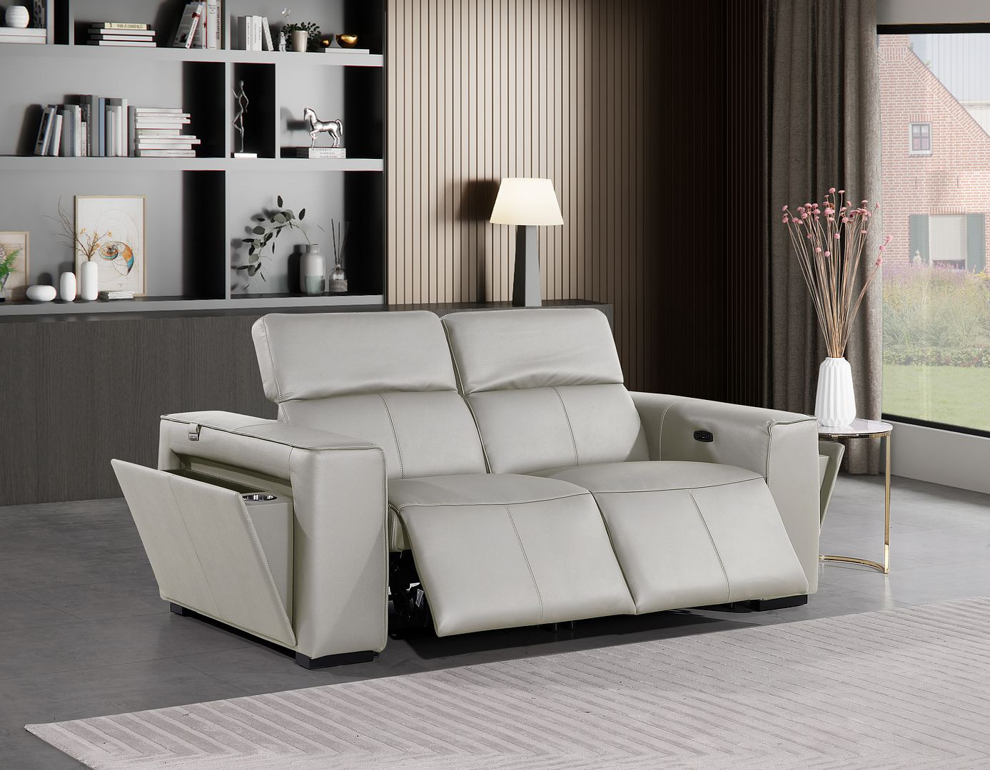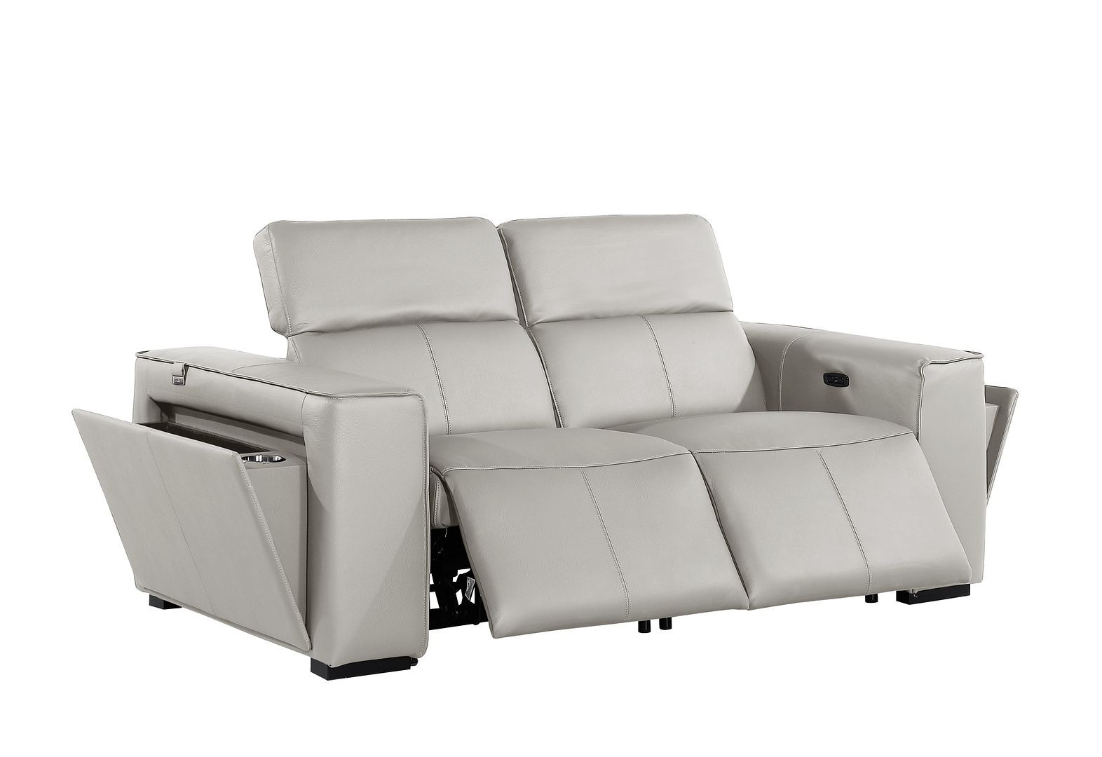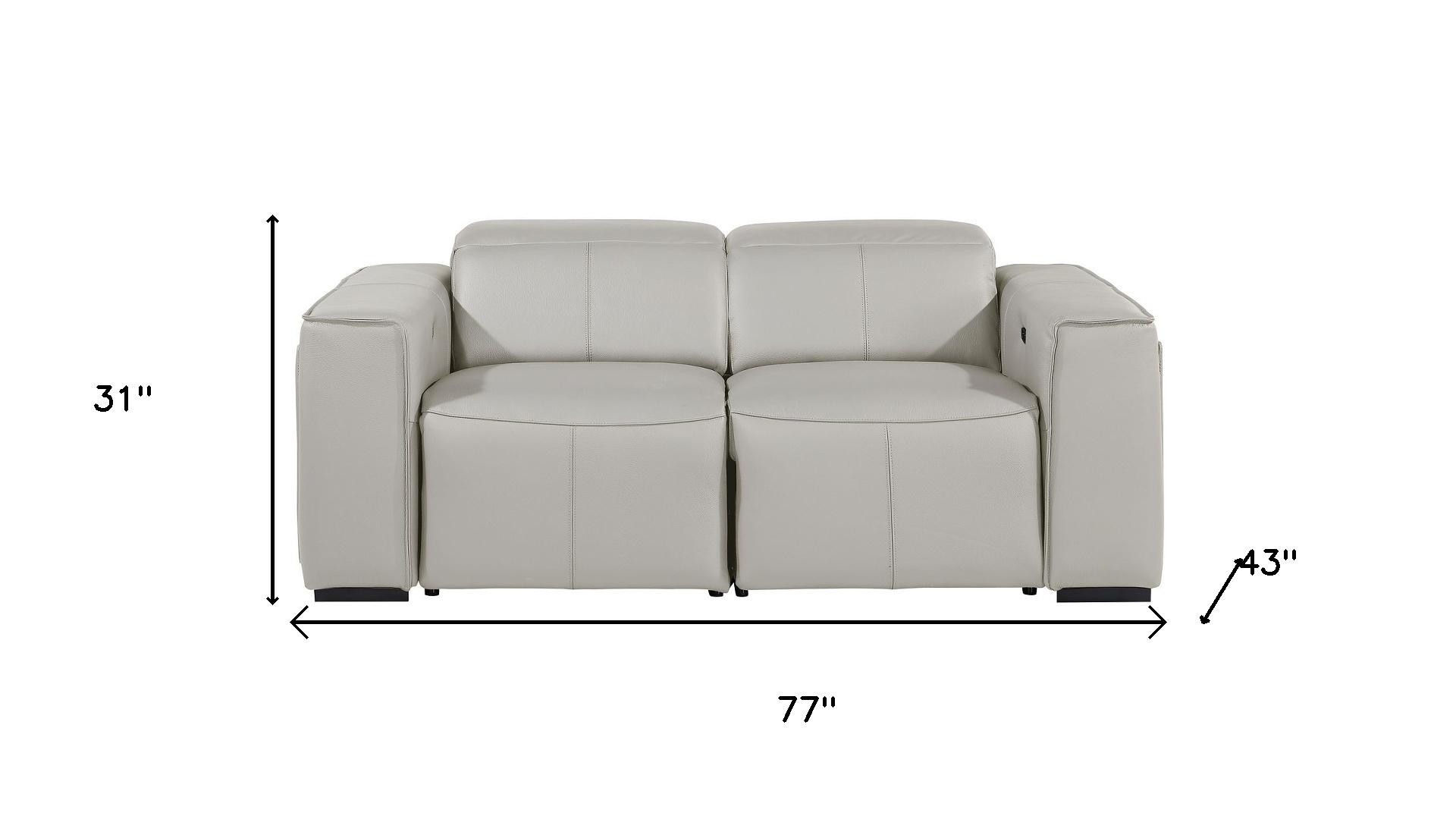 An interior designer's dream, this buttery soft high grade leather 77-inch light gray and brown italian leather power reclining loveseat with storage will bring just the right touch to your space. The high grade premium leather used makes your lounging luxuriously comfortable and adds an elegant appeal to your space. Square arms offer a comfy place to rest and give this piece some interest and shape. Brown solid wood legs effortlessly elevate the room and add a touch of contemporary design. A great showpiece for your room, this sofa is a must have. 31.00-inch h x 77.00-inch w x 43.00-inch d.