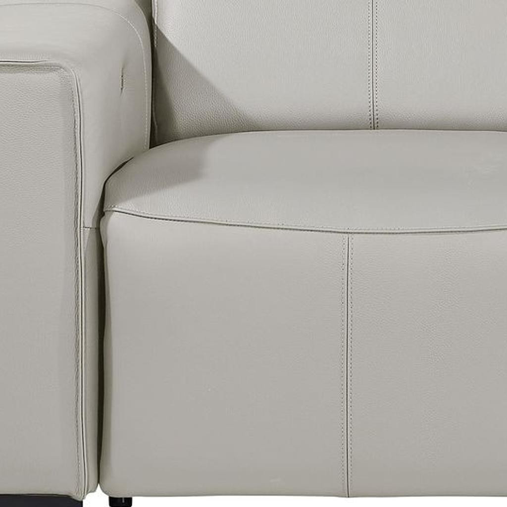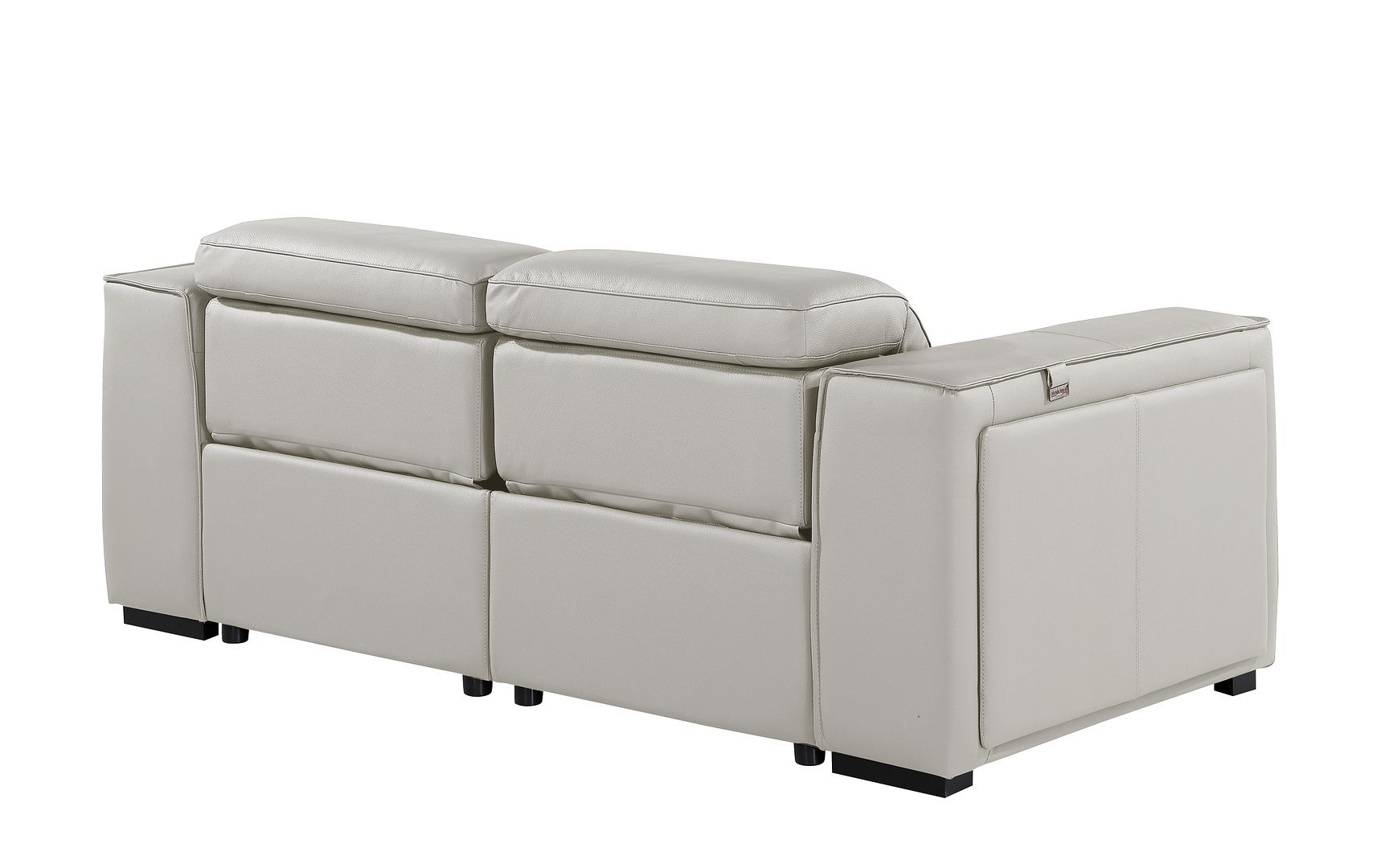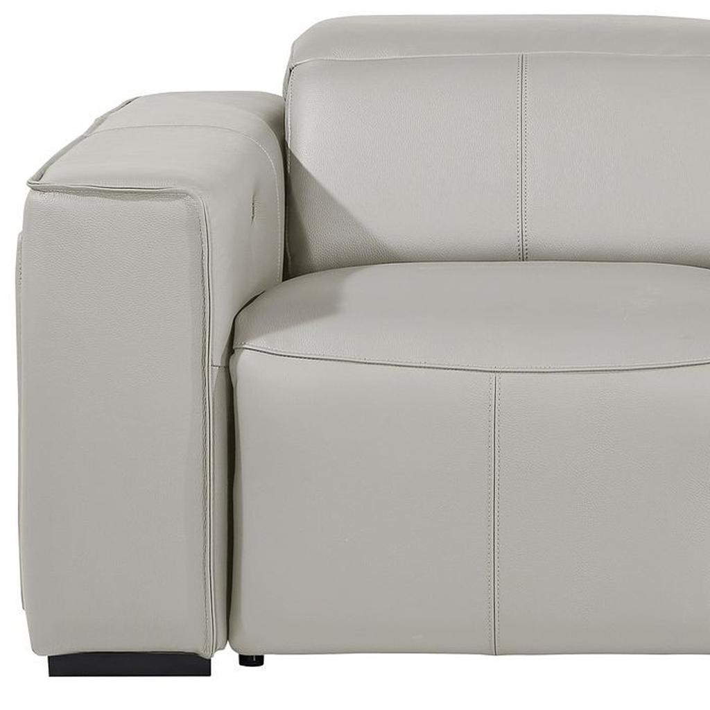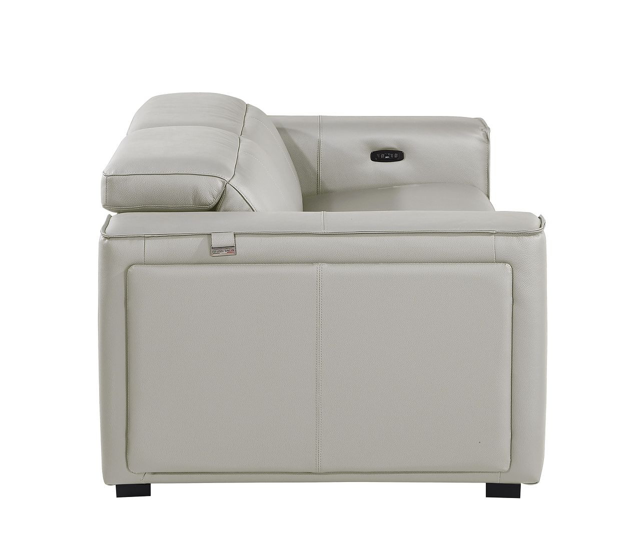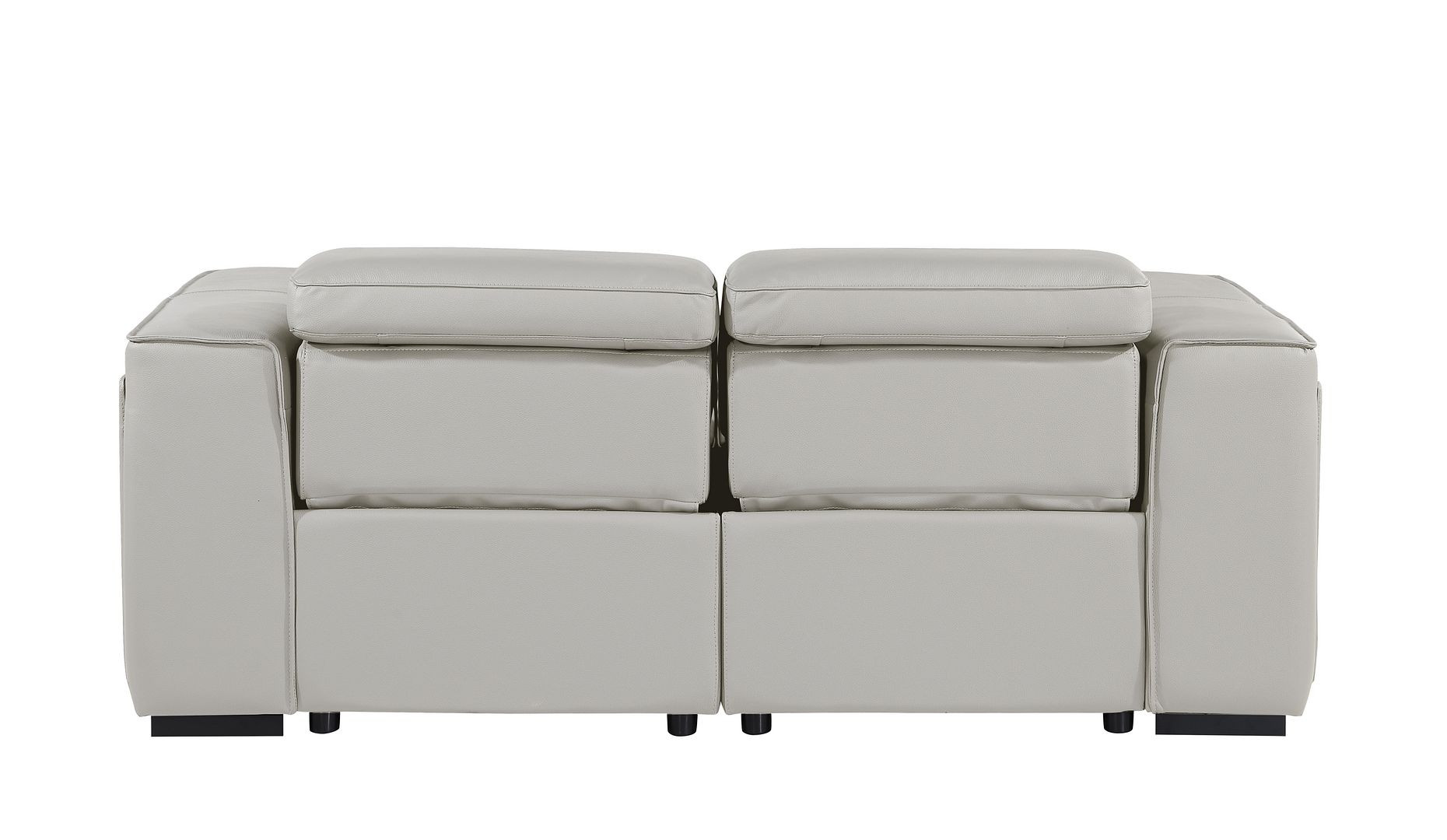 An interior designer's dream, this buttery soft high grade leather 77-inch light gray and brown italian leather power reclining loveseat with storage will bring just the right touch to your space. The high grade premium leather used makes your lounging luxuriously comfortable and adds an elegant appeal to your space. Square arms offer a comfy place to rest and give this piece some interest and shape. Brown solid wood legs effortlessly elevate the room and add a touch of contemporary design. A great showpiece for your room, this sofa is a must have. 31.00-inch h x 77.00-inch w x 43.00-inch d.