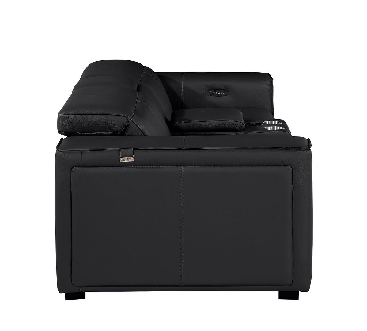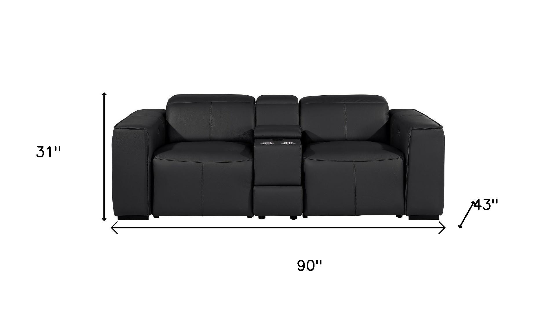 An interior designer's dream, this buttery soft high grade leather 90-inch black and brown italian leather power reclining loveseat with storage will bring just the right touch to your space. The high grade premium leather used makes your lounging luxuriously comfortable and adds an elegant appeal to your space. Square arms offer a comfy place to rest and give this piece some interest and shape. Brown solid wood legs effortlessly elevate the room and add a touch of contemporary design. A great showpiece for your room, this sofa is a must have. 31.00-inch h x 90.00-inch w x 43.00-inch d.