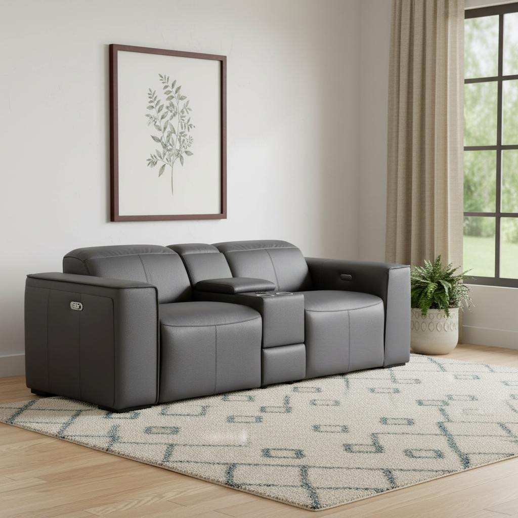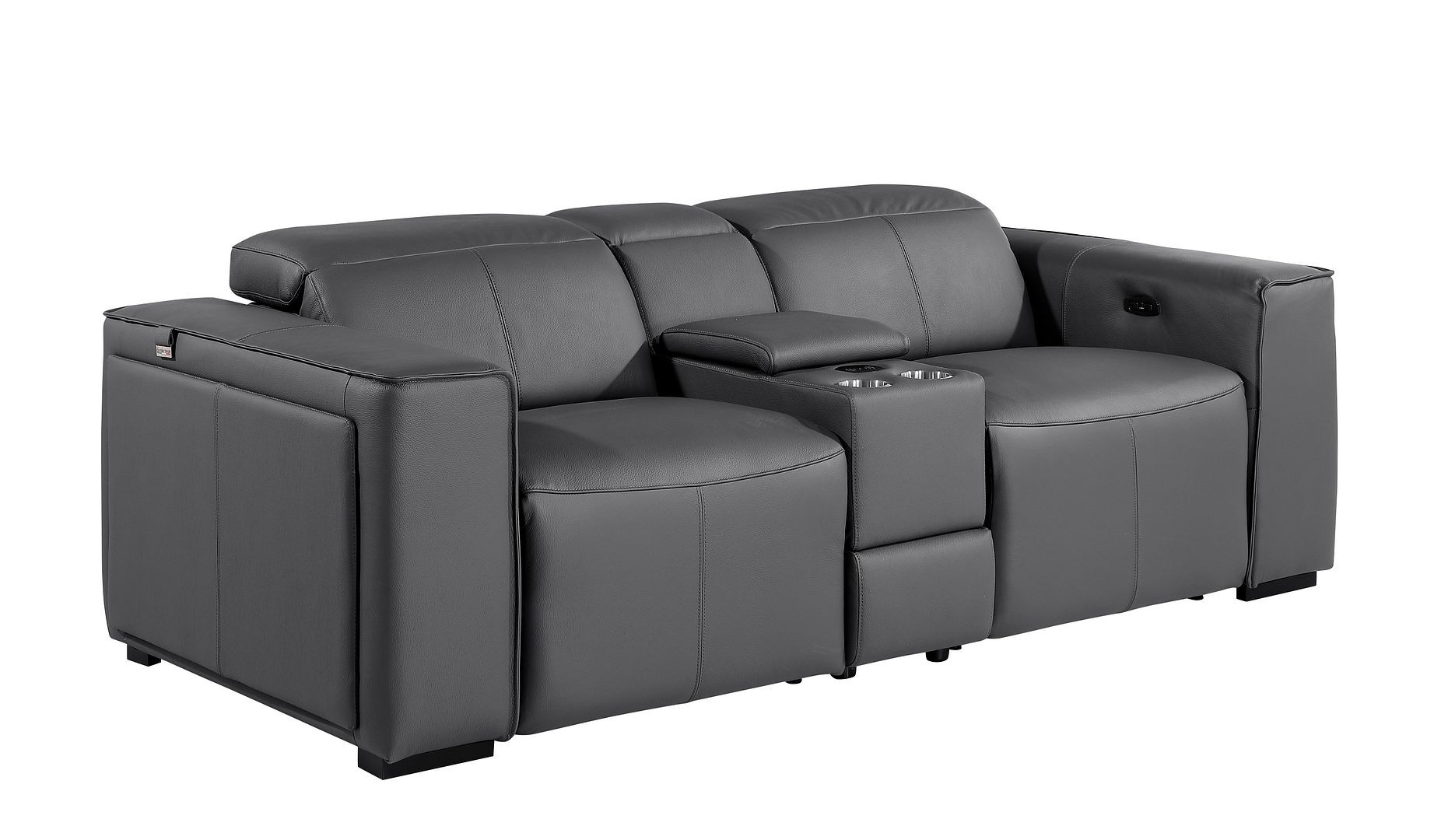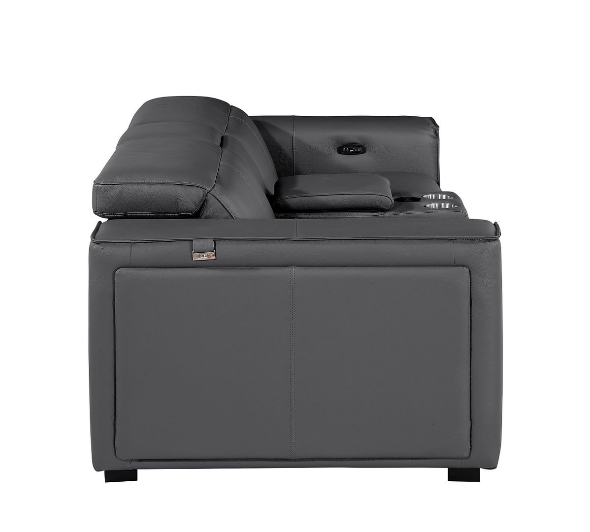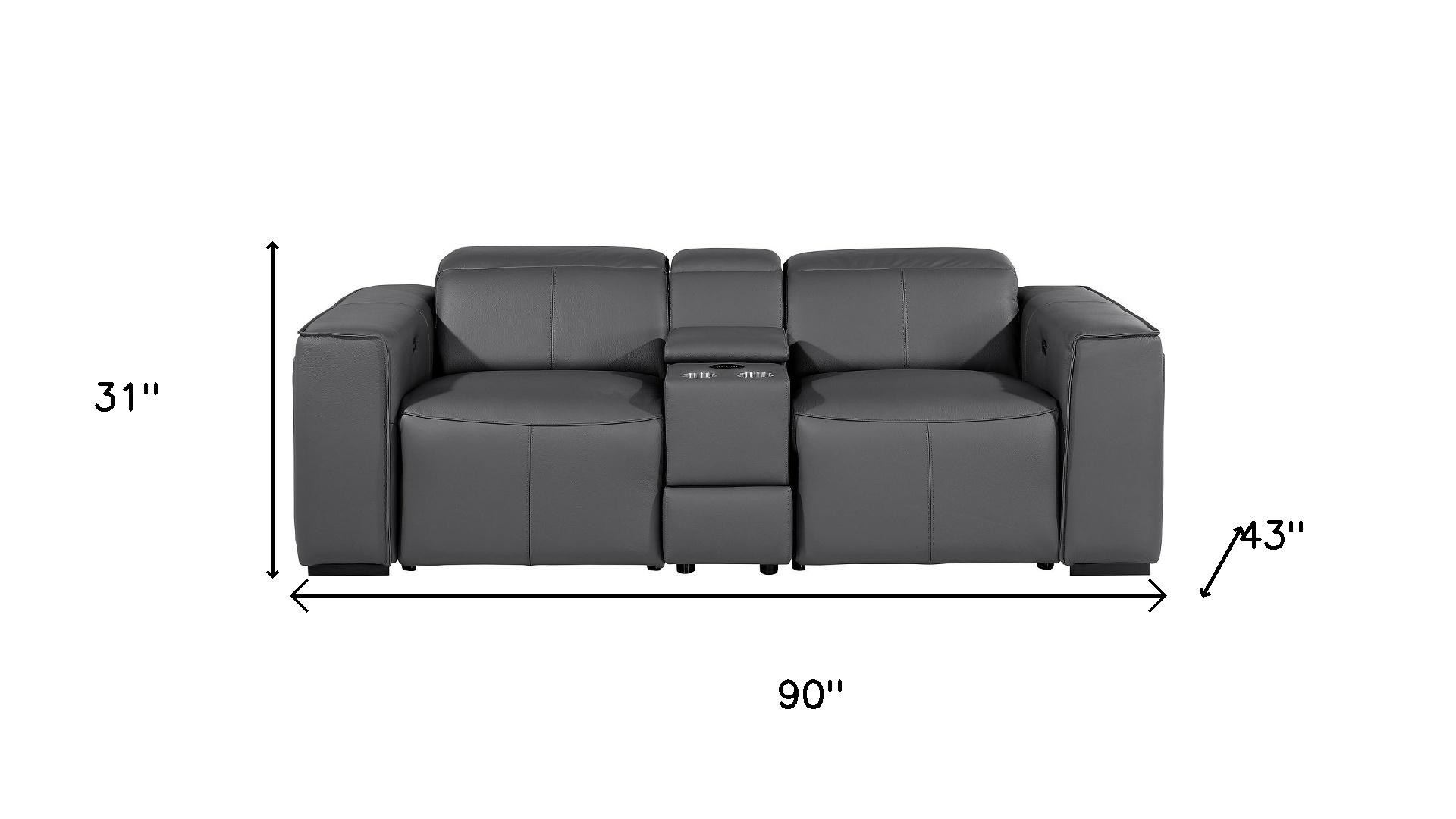 Made of top quality, supple leather, this 90-inch dark gray and brown italian leather power reclining loveseat with storage will be the star of your space. The high grade premium leather used makes your lounging luxuriously comfortable and adds an elegant appeal to your space. Square arms offer a comfy place to rest and give this piece some interest and shape. Brown solid wood legs effortlessly elevate the room and add a touch of contemporary design. A great showpiece for your room, this sofa is a must have. 31.00-inch h x 90.00-inch w x 43.00-inch d.
