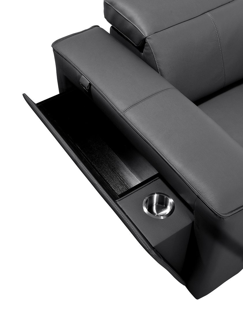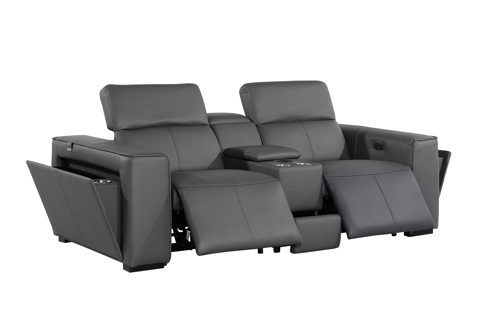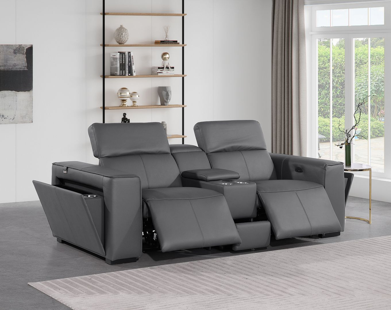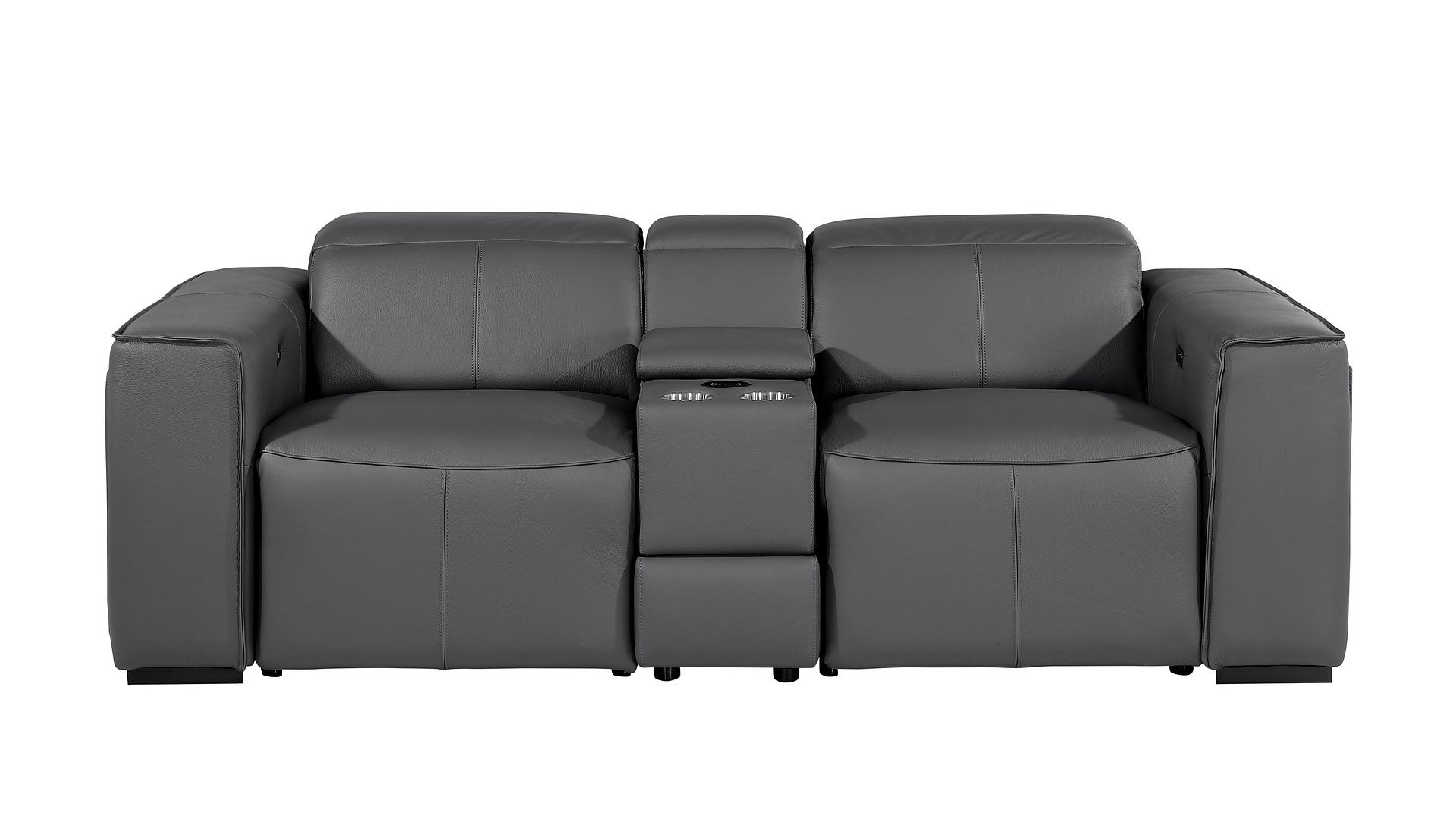 Made of top quality, supple leather, this 90-inch dark gray and brown italian leather power reclining loveseat with storage will be the star of your space. The high grade premium leather used makes your lounging luxuriously comfortable and adds an elegant appeal to your space. Square arms offer a comfy place to rest and give this piece some interest and shape. Brown solid wood legs effortlessly elevate the room and add a touch of contemporary design. A great showpiece for your room, this sofa is a must have. 31.00-inch h x 90.00-inch w x 43.00-inch d.