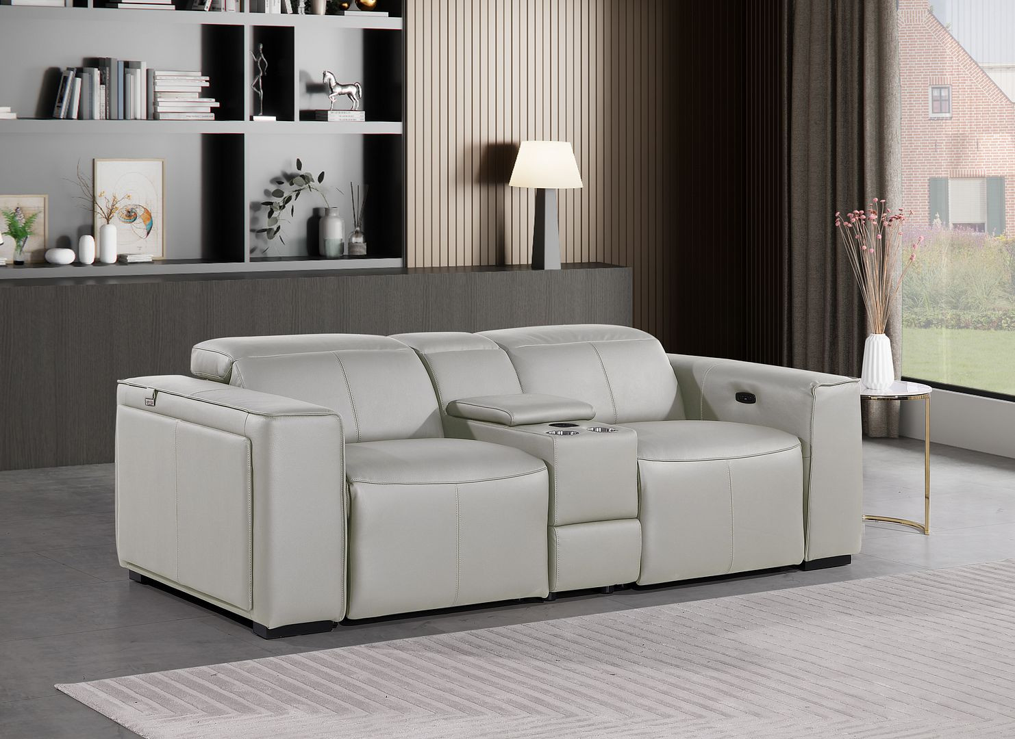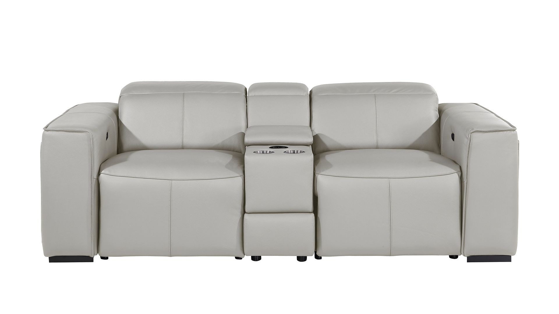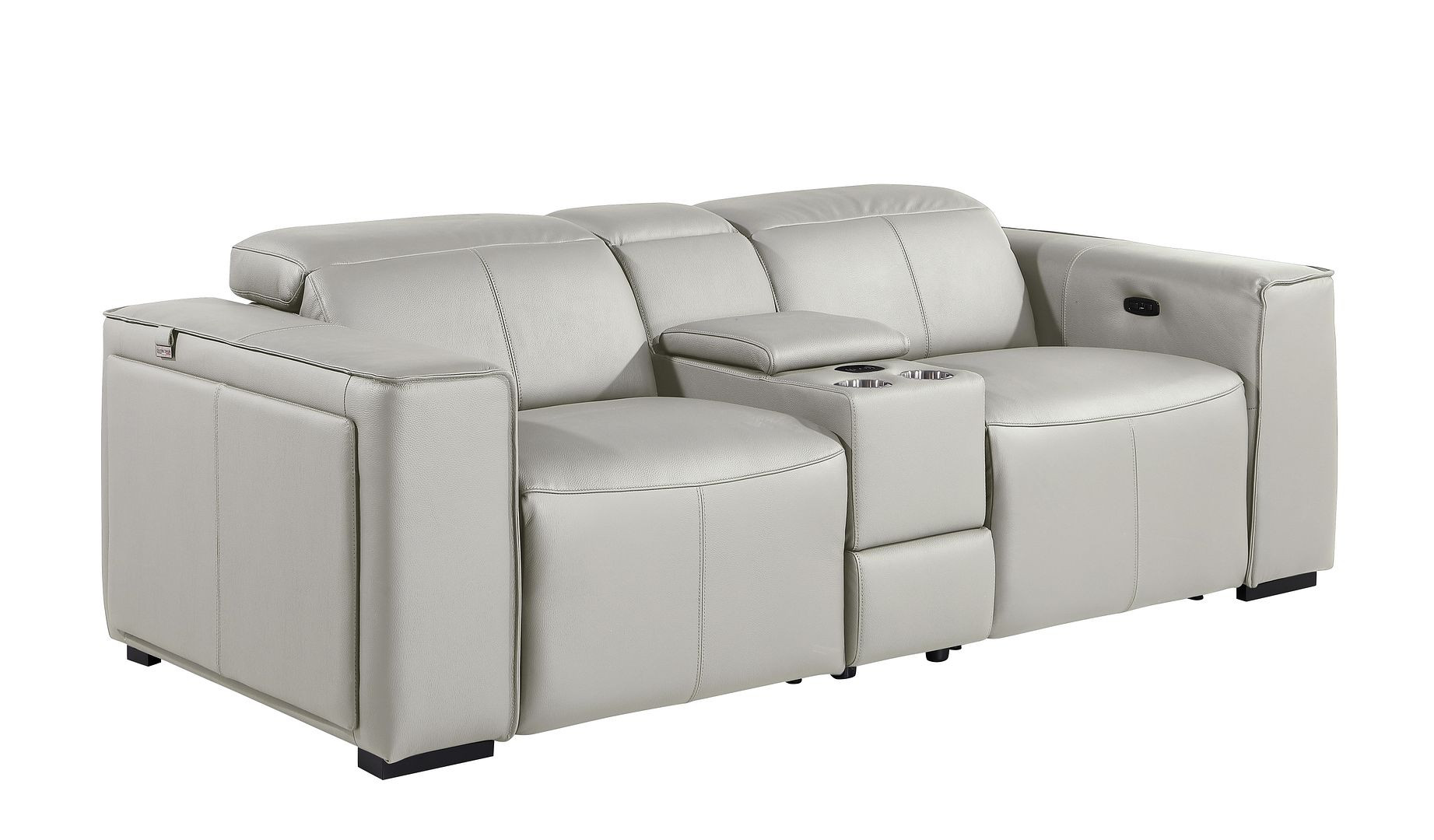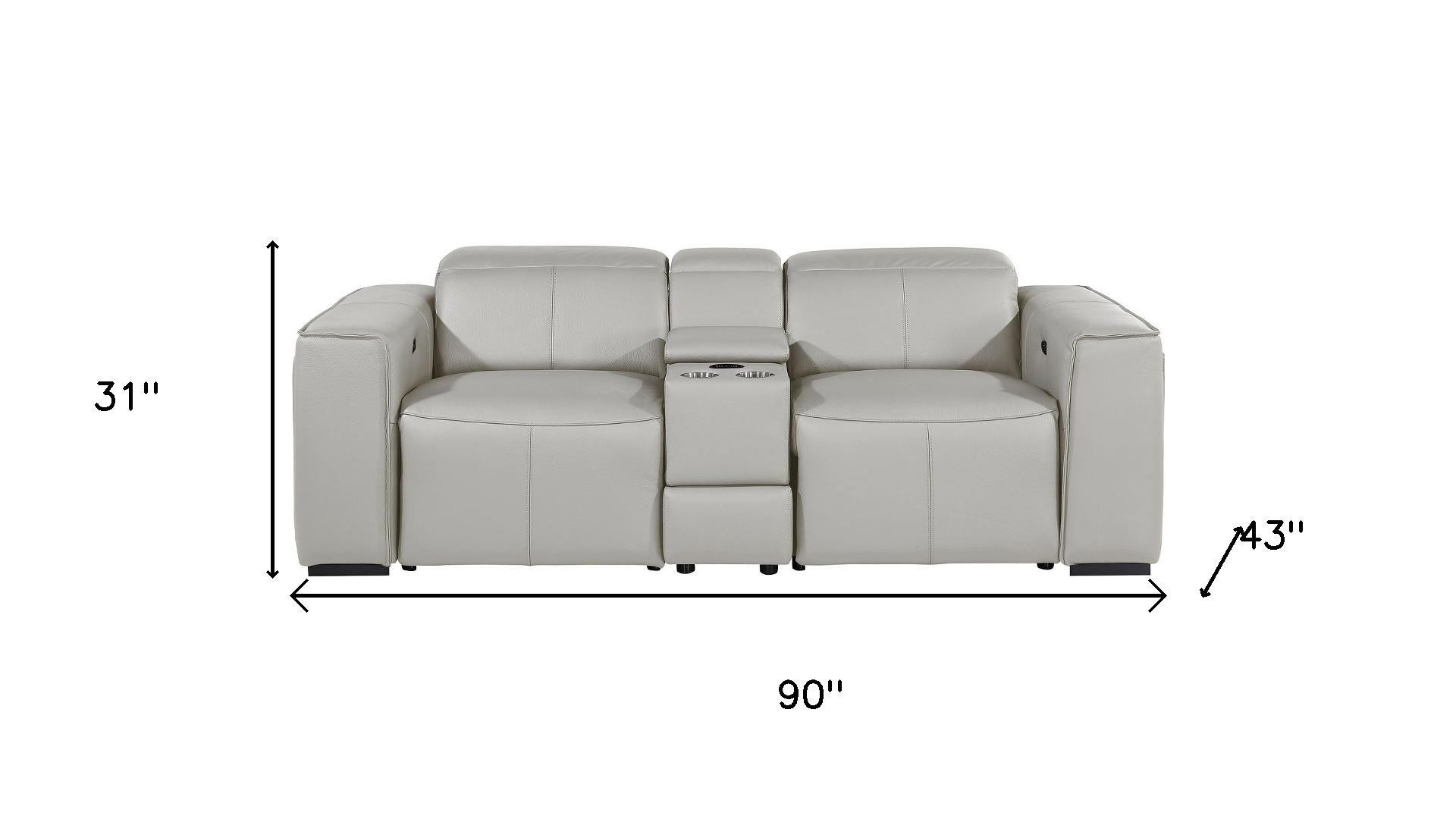 Made of top quality, supple leather, this 90-inch light gray and brown italian leather power reclining loveseat with storage will be the star of your space. The high grade premium leather used makes your lounging luxuriously comfortable and adds an elegant appeal to your space. Square arms offer a comfy place to rest and give this piece some interest and shape. Brown solid wood legs effortlessly elevate the room and add a touch of contemporary design. A great showpiece for your room, this sofa is a must have. 31.00-inch h x 90.00-inch w x 43.00-inch d.