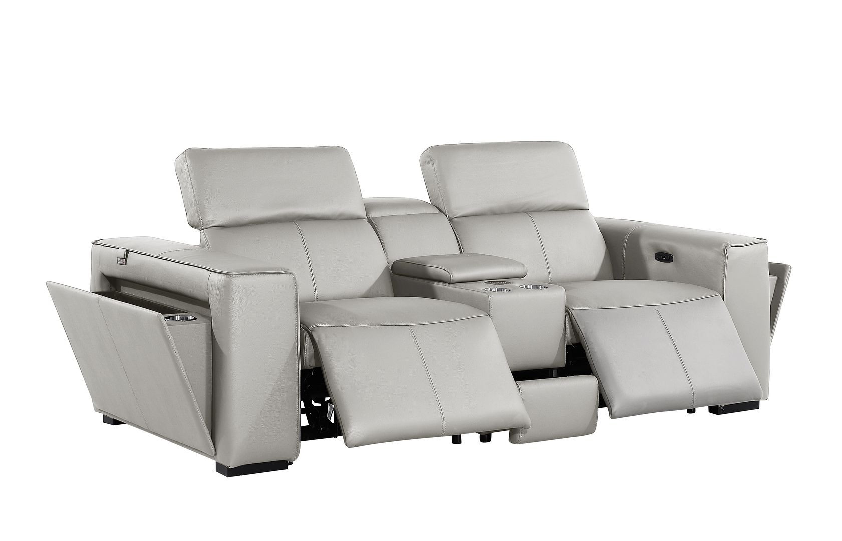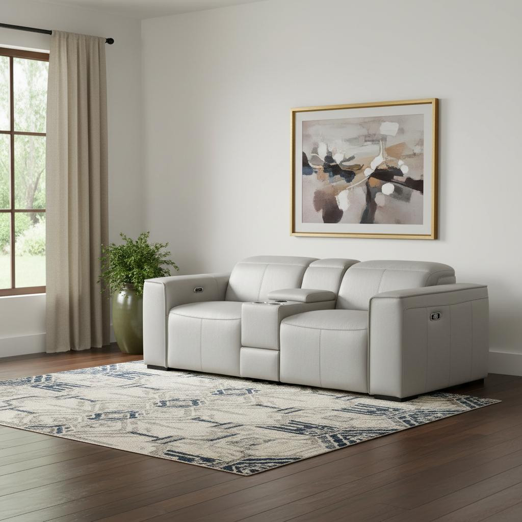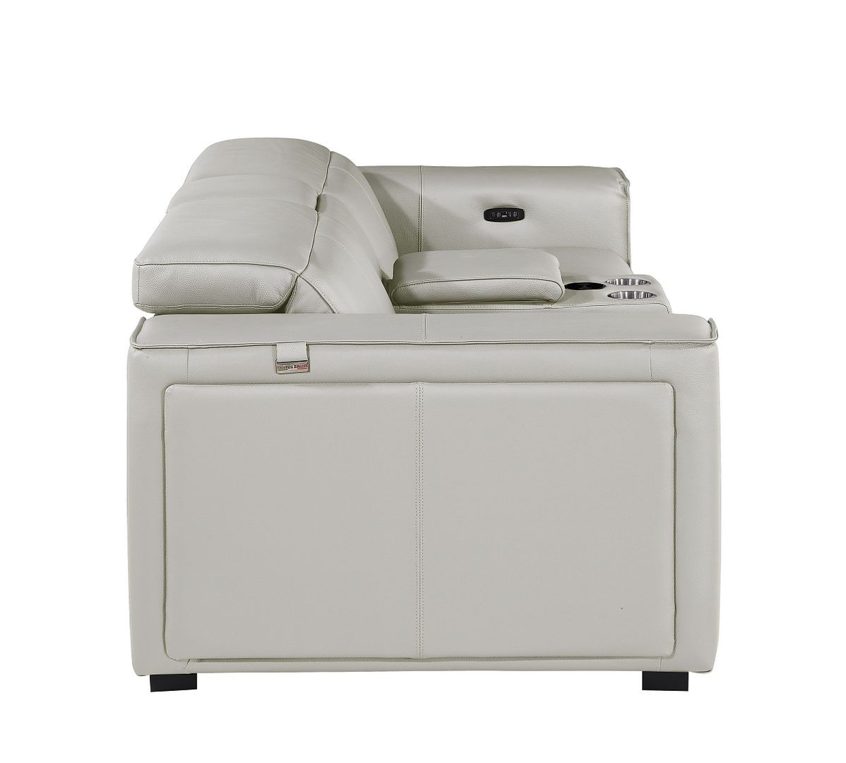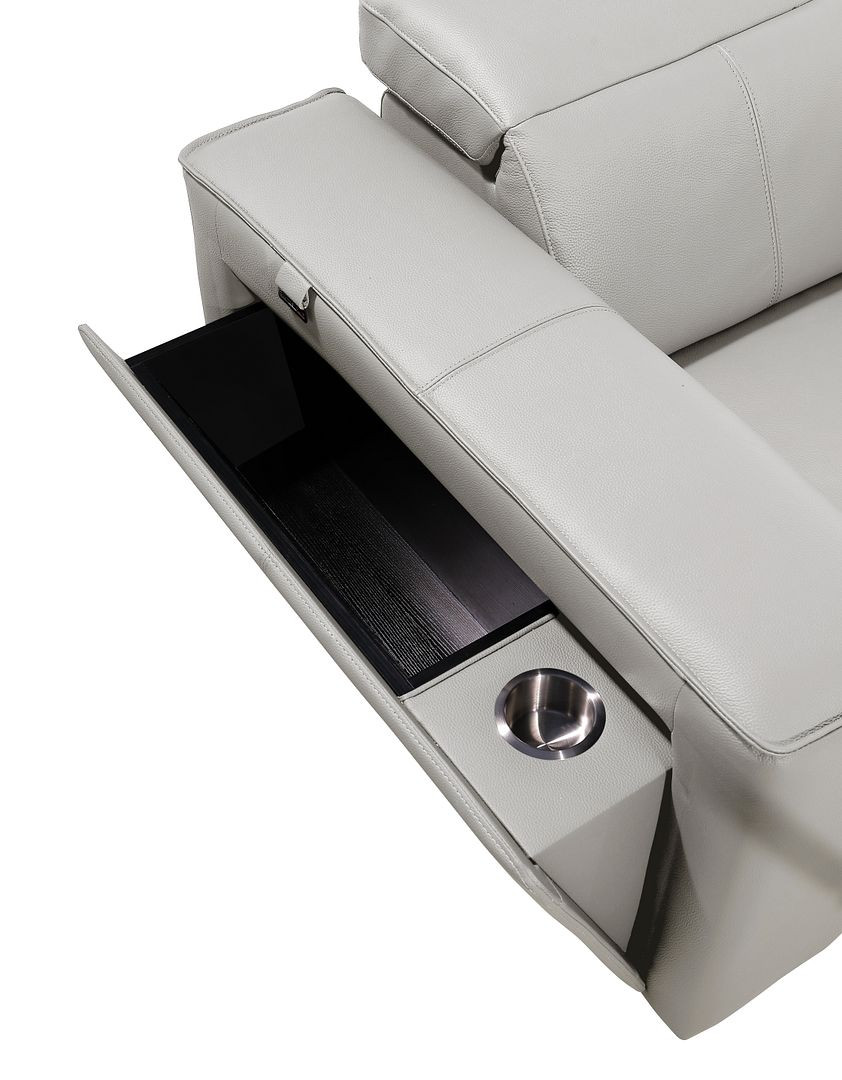 Made of top quality, supple leather, this 90-inch light gray and brown italian leather power reclining loveseat with storage will be the star of your space. The high grade premium leather used makes your lounging luxuriously comfortable and adds an elegant appeal to your space. Square arms offer a comfy place to rest and give this piece some interest and shape. Brown solid wood legs effortlessly elevate the room and add a touch of contemporary design. A great showpiece for your room, this sofa is a must have. 31.00-inch h x 90.00-inch w x 43.00-inch d.