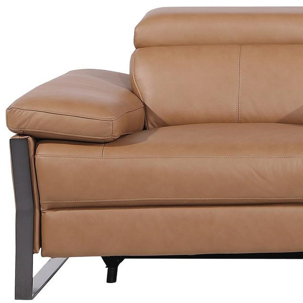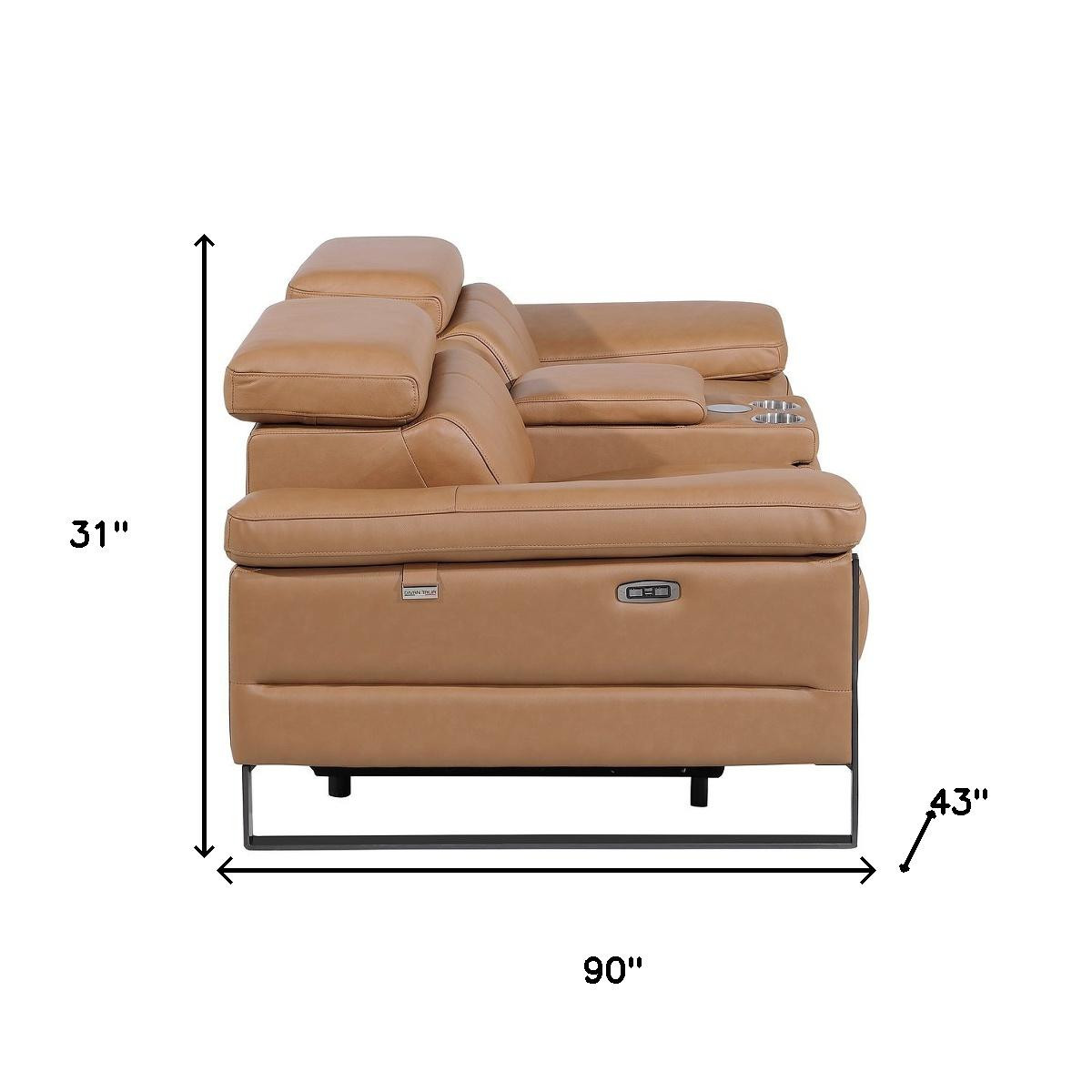 Made of top quality, supple leather, this 90-inch chestnut and black italian leather power reclining loveseat with storage will be the star of your space. The high grade premium leather used makes your lounging luxuriously comfortable and adds an elegant appeal to your space. Rolled arms offer a comfy place to rest and give this piece some interest and shape. Black metal legs effortlessly elevate the room and add a touch of contemporary design. A great showpiece for your room, this sofa is a must have. 31.00-inch h x 90.00-inch w x 43.00-inch d.