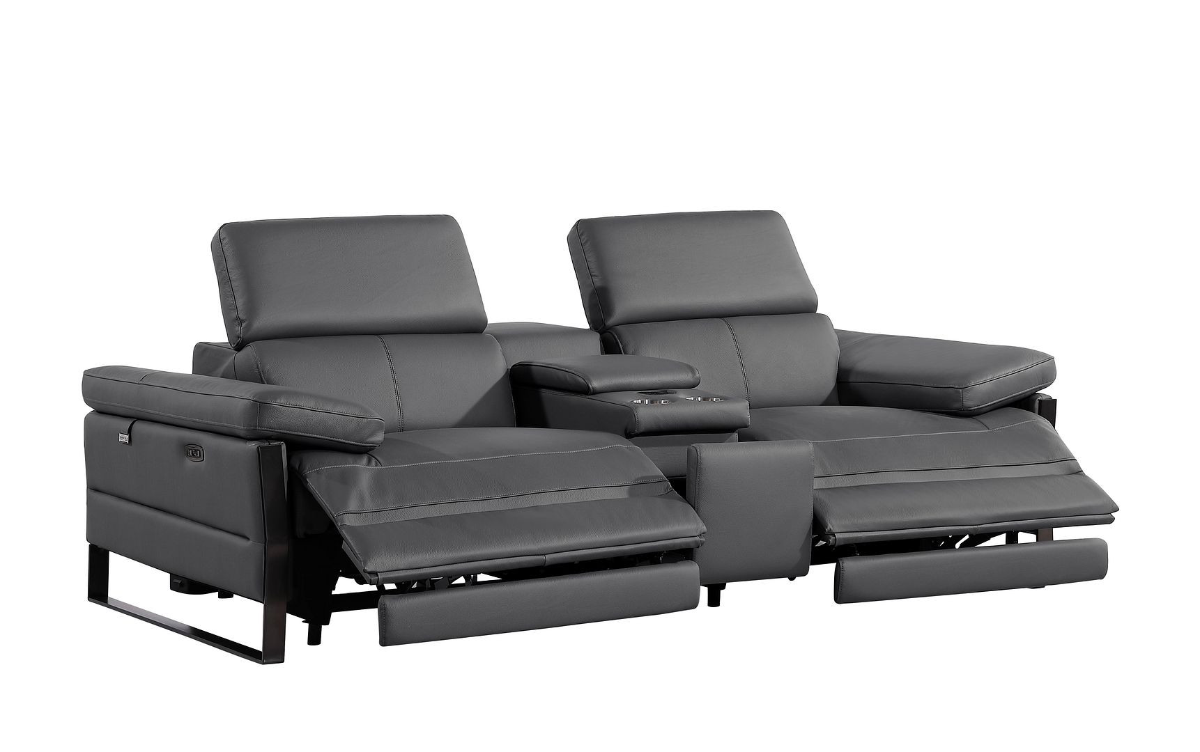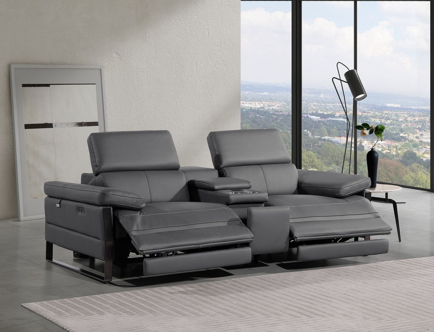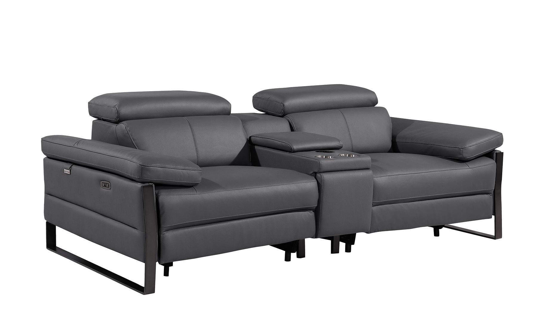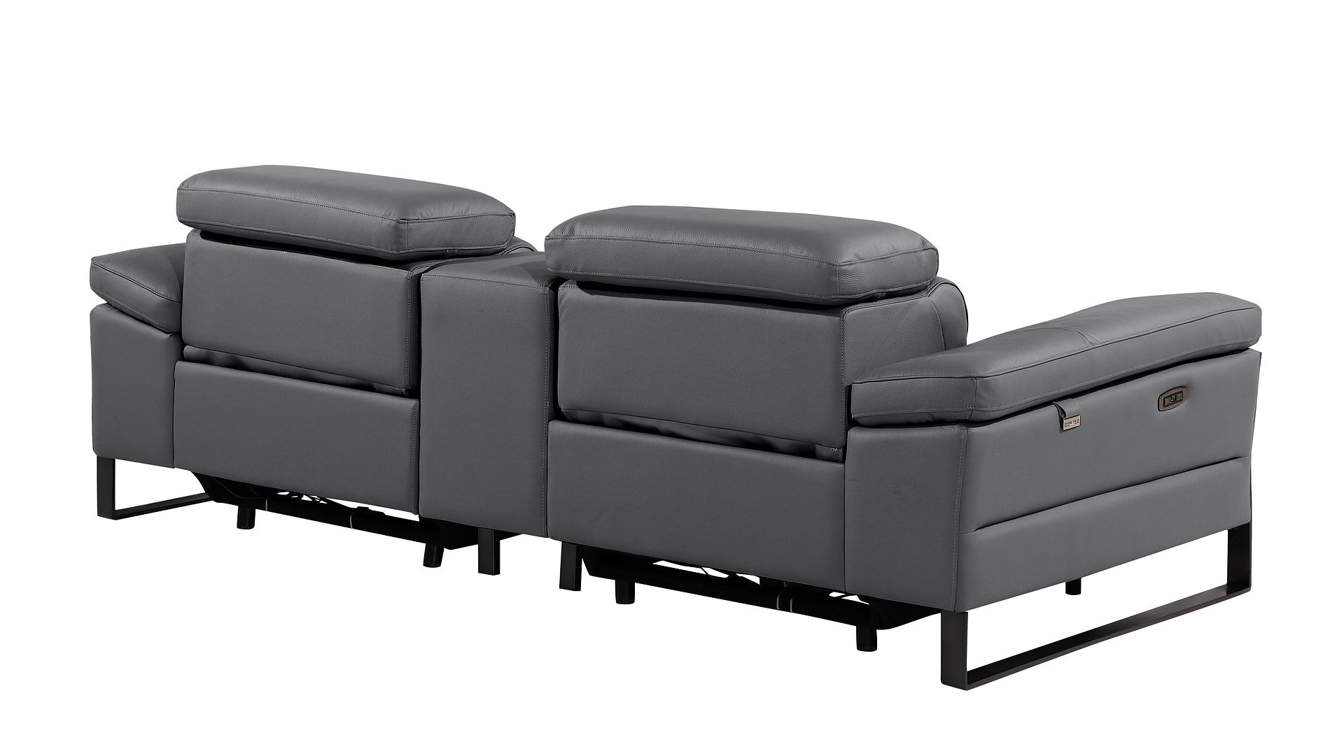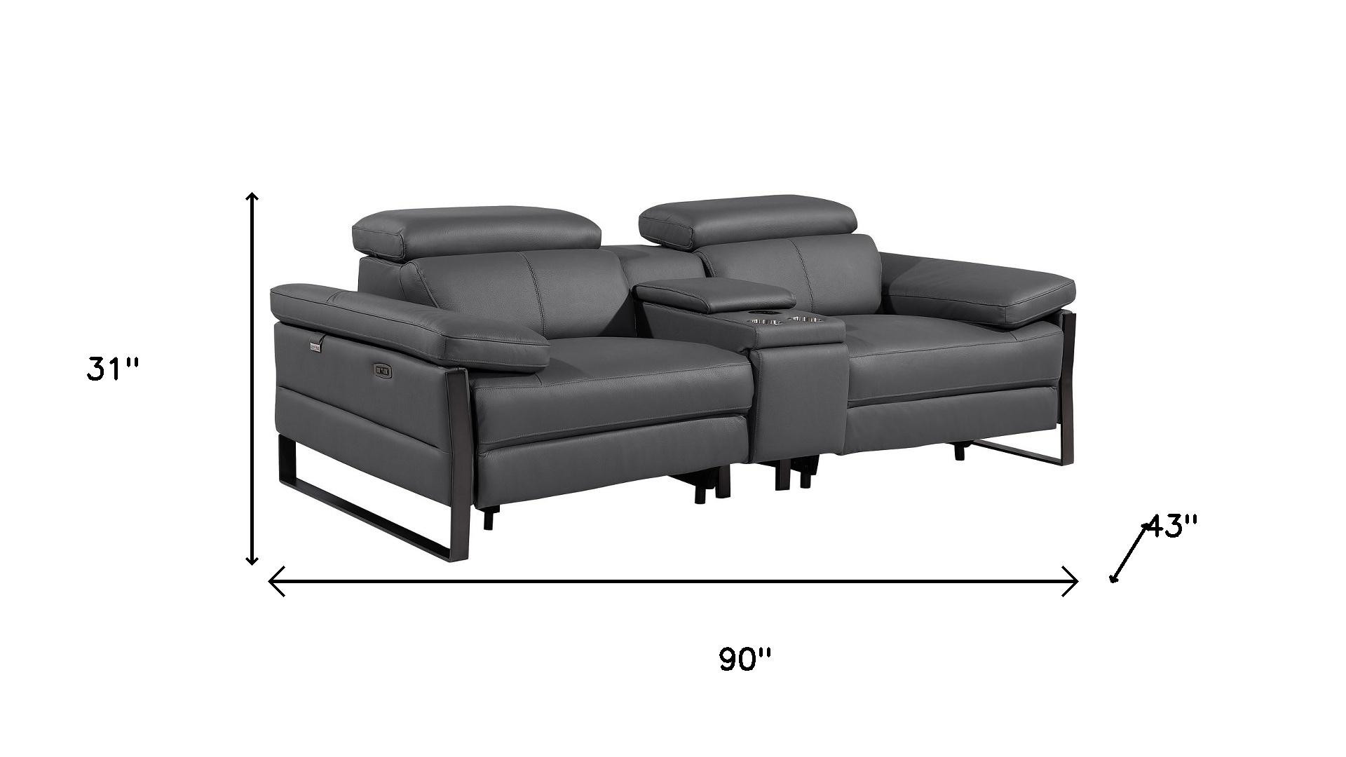 An interior designer's dream, this buttery soft high grade leather 90-inch dark gray and black italian leather power reclining loveseat with storage will bring just the right touch to your space. The high grade premium leather used makes your lounging luxuriously comfortable and adds an elegant appeal to your space. Rolled arms offer a comfy place to rest and give this piece some interest and shape. Black metal legs effortlessly elevate the room and add a touch of contemporary design. A great showpiece for your room, this sofa is a must have. 31.00-inch h x 90.00-inch w x 43.00-inch d.