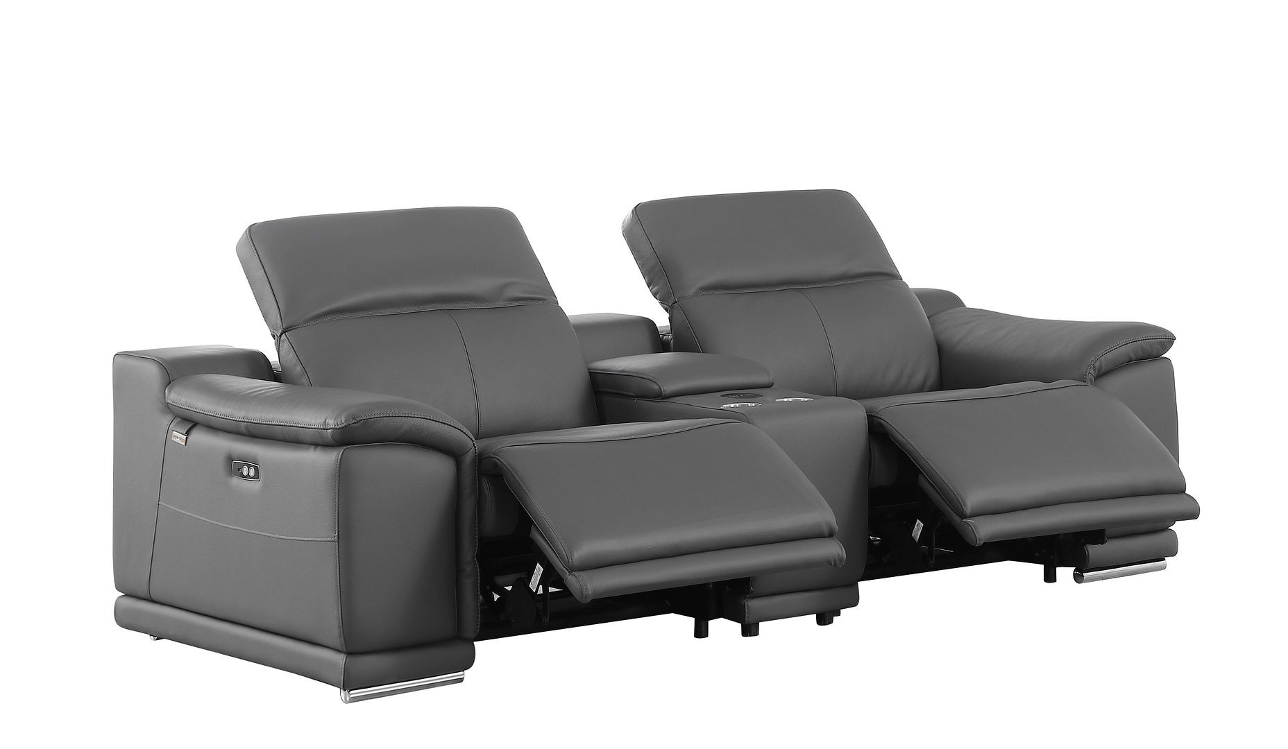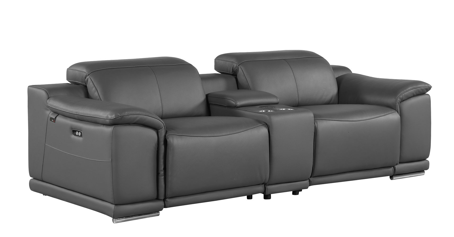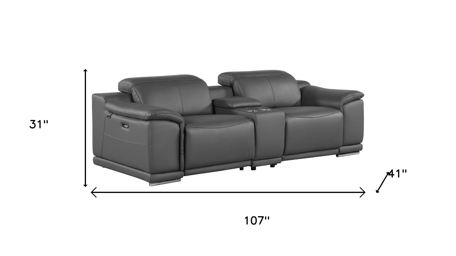 An interior designer's dream, this buttery soft high grade leather 107-inch dark gray and silver italian leather power reclining loveseat with storage will bring just the right touch to your space. The high grade premium leather used makes your lounging luxuriously comfortable and adds an elegant appeal to your space. Rolled arms offer a comfy place to rest and give this piece some interest and shape. Silver metal legs effortlessly elevate the room and add a touch of contemporary design. A great showpiece for your room, this sofa is a must have. 31.00-inch h x 107.00-inch w x 41.00-inch d.