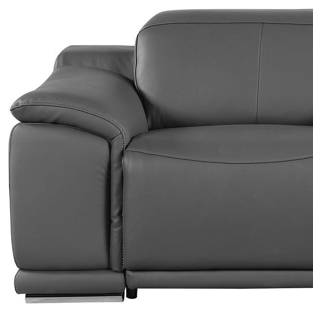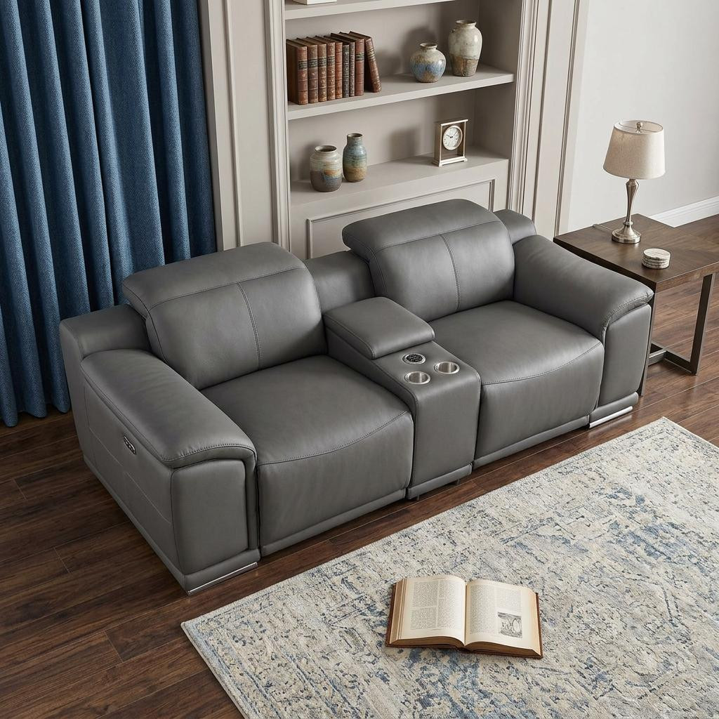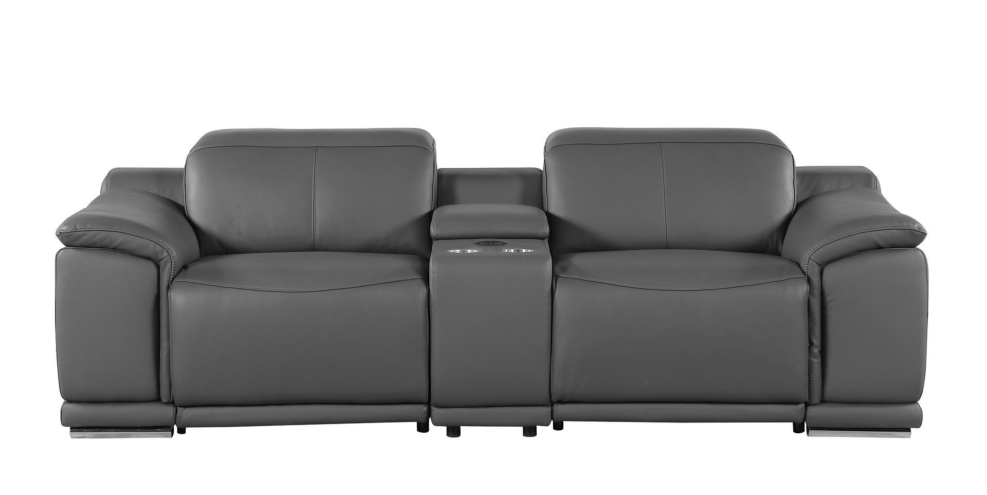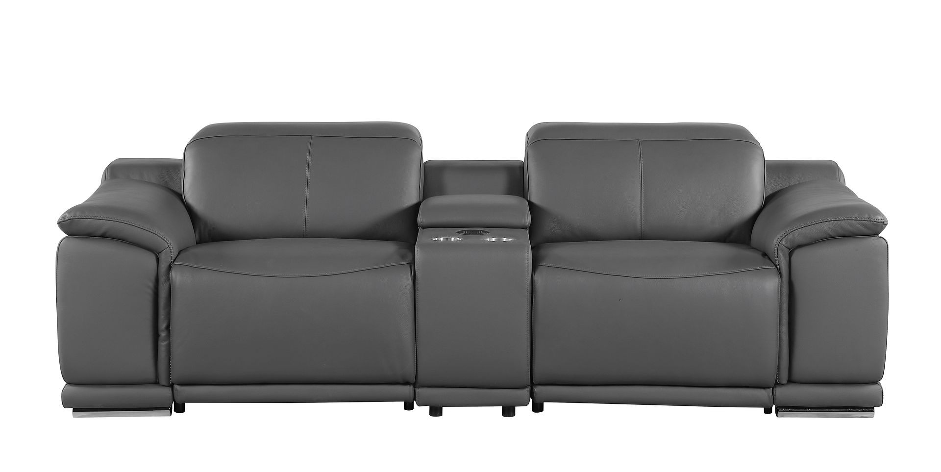 An interior designer's dream, this buttery soft high grade leather 107-inch dark gray and silver italian leather power reclining loveseat with storage will bring just the right touch to your space. The high grade premium leather used makes your lounging luxuriously comfortable and adds an elegant appeal to your space. Rolled arms offer a comfy place to rest and give this piece some interest and shape. Silver metal legs effortlessly elevate the room and add a touch of contemporary design. A great showpiece for your room, this sofa is a must have. 31.00-inch h x 107.00-inch w x 41.00-inch d.
