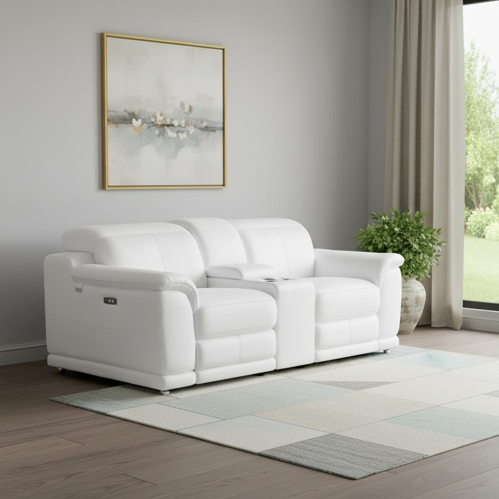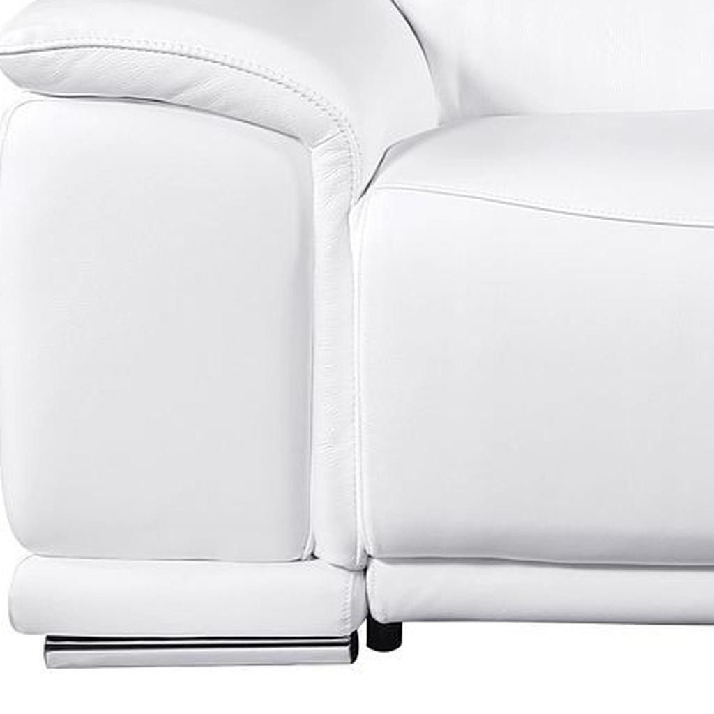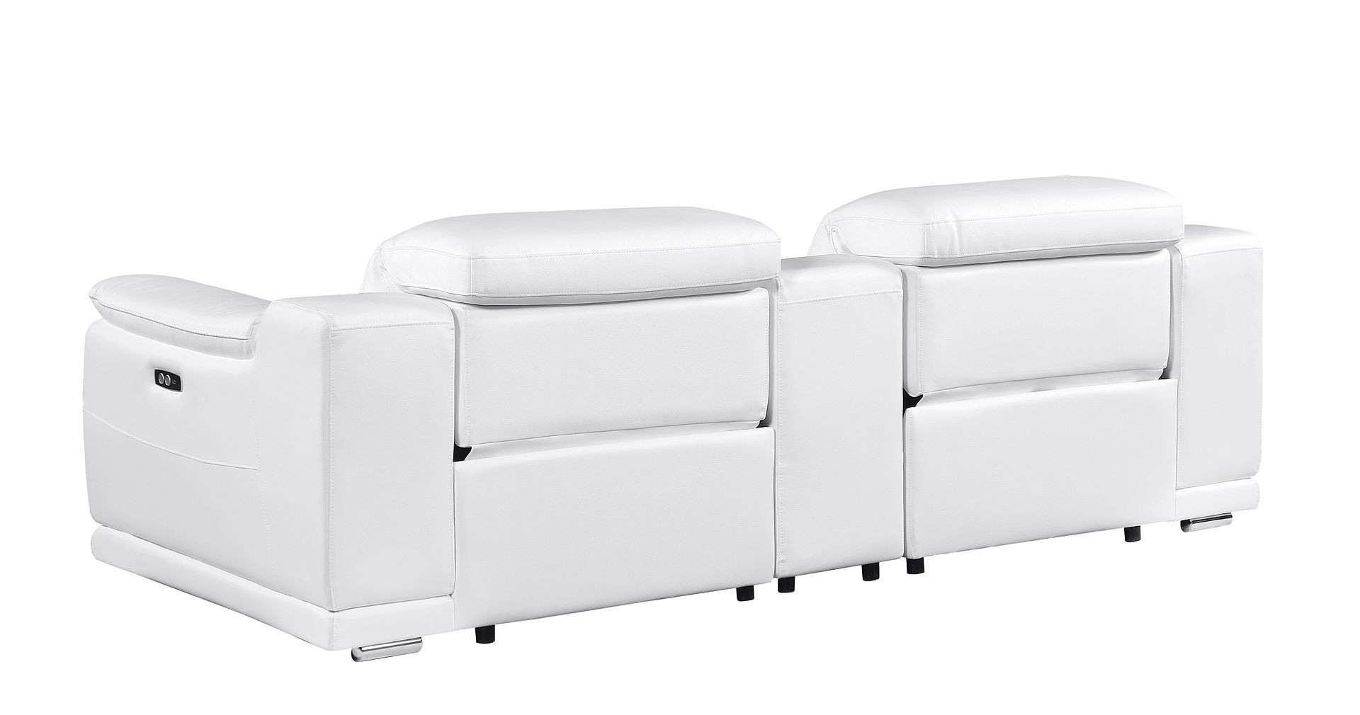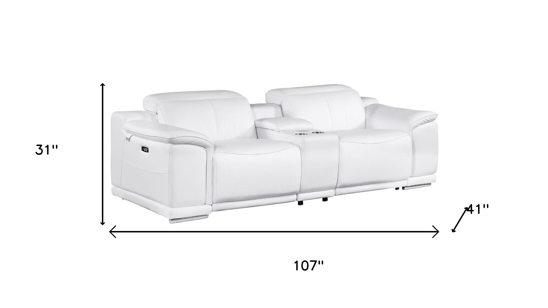 Superior construction from fabulously soft and high grade leather gives this 107-inch white and silver italian leather power reclining loveseat with storage a leg up on the competition. The high grade premium leather used makes your lounging luxuriously comfortable and adds an elegant appeal to your space. Rolled arms offer a comfy place to rest and give this piece some interest and shape. Silver metal legs effortlessly elevate the room and add a touch of contemporary design. A great showpiece for your room, this sofa is a must have. 31.00-inch h x 107.00-inch w x 41.00-inch d.