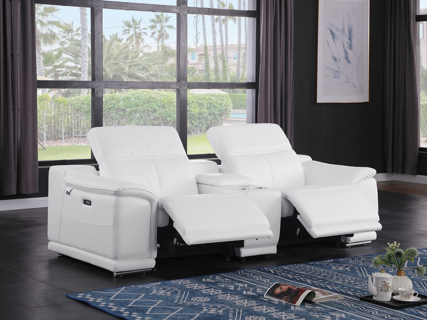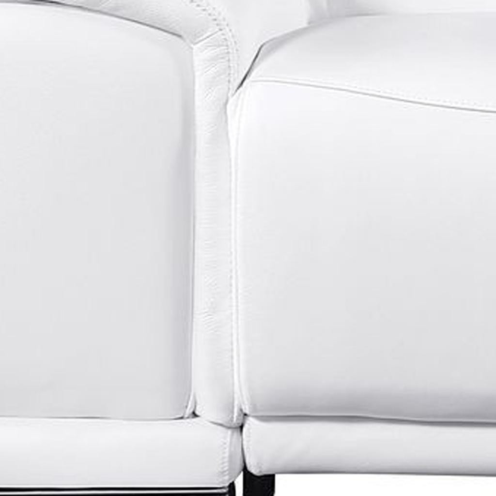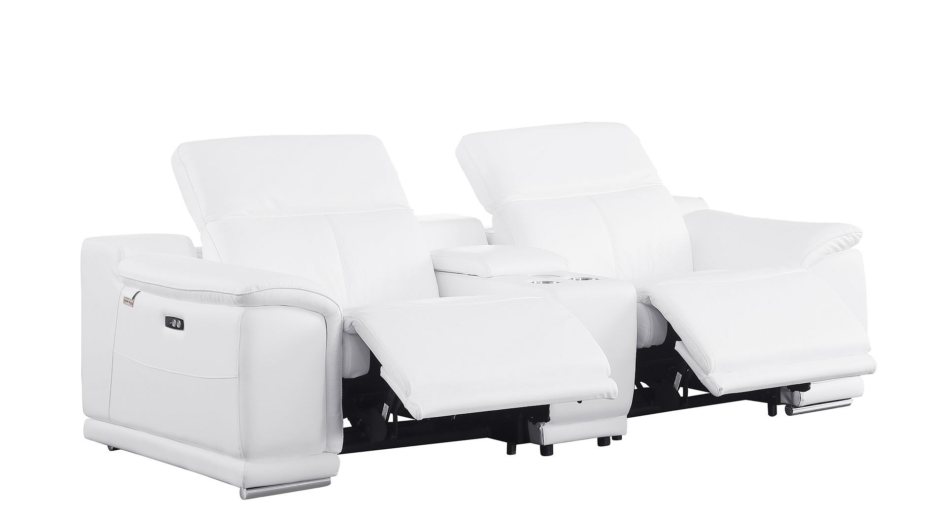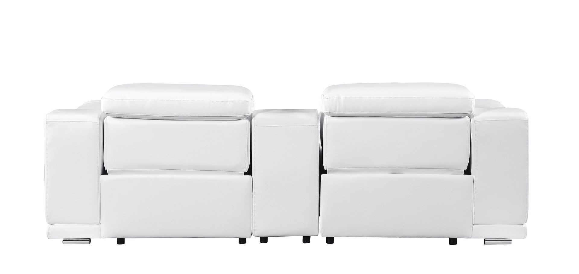 Superior construction from fabulously soft and high grade leather gives this 107-inch white and silver italian leather power reclining loveseat with storage a leg up on the competition. The high grade premium leather used makes your lounging luxuriously comfortable and adds an elegant appeal to your space. Rolled arms offer a comfy place to rest and give this piece some interest and shape. Silver metal legs effortlessly elevate the room and add a touch of contemporary design. A great showpiece for your room, this sofa is a must have. 31.00-inch h x 107.00-inch w x 41.00-inch d.