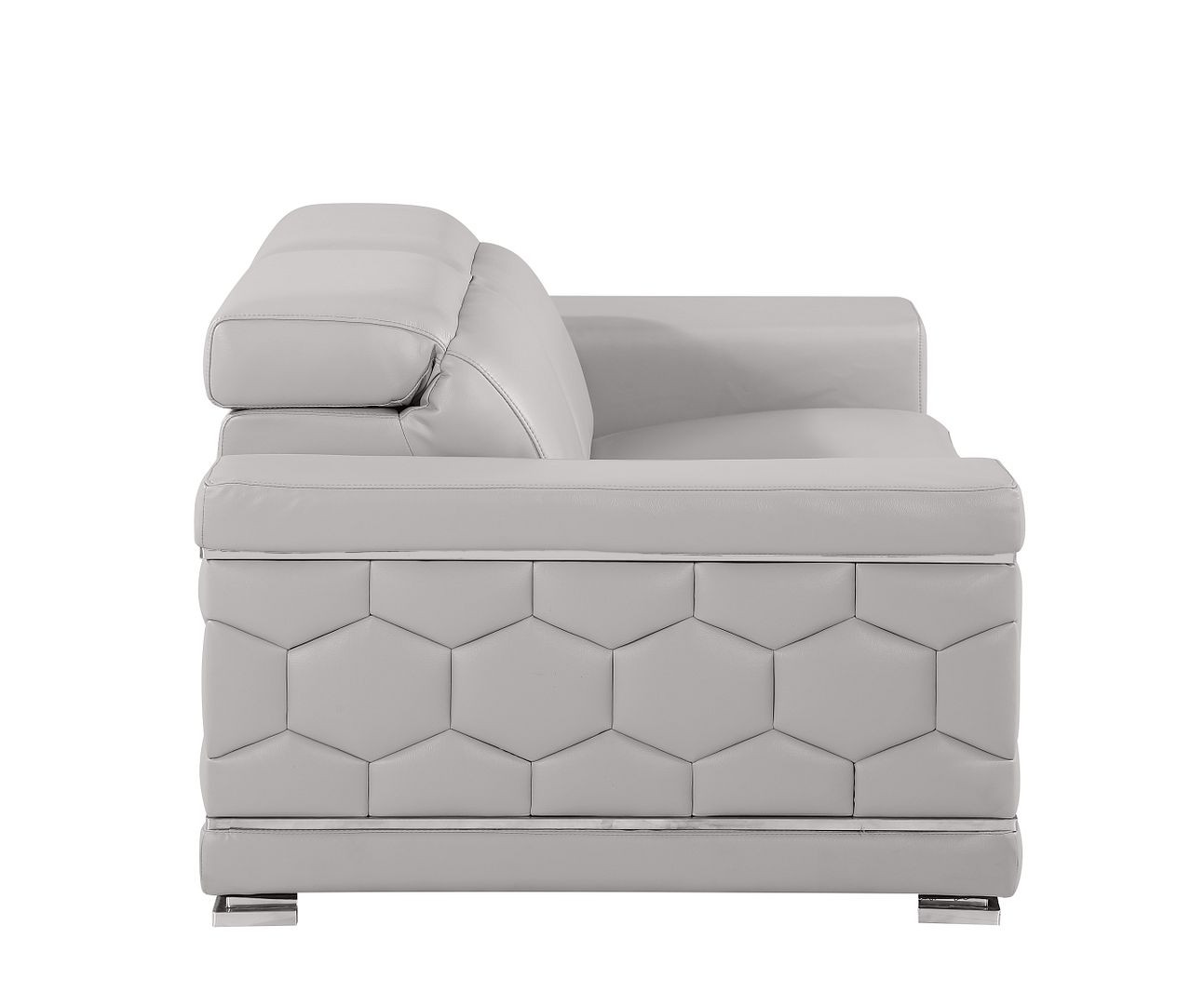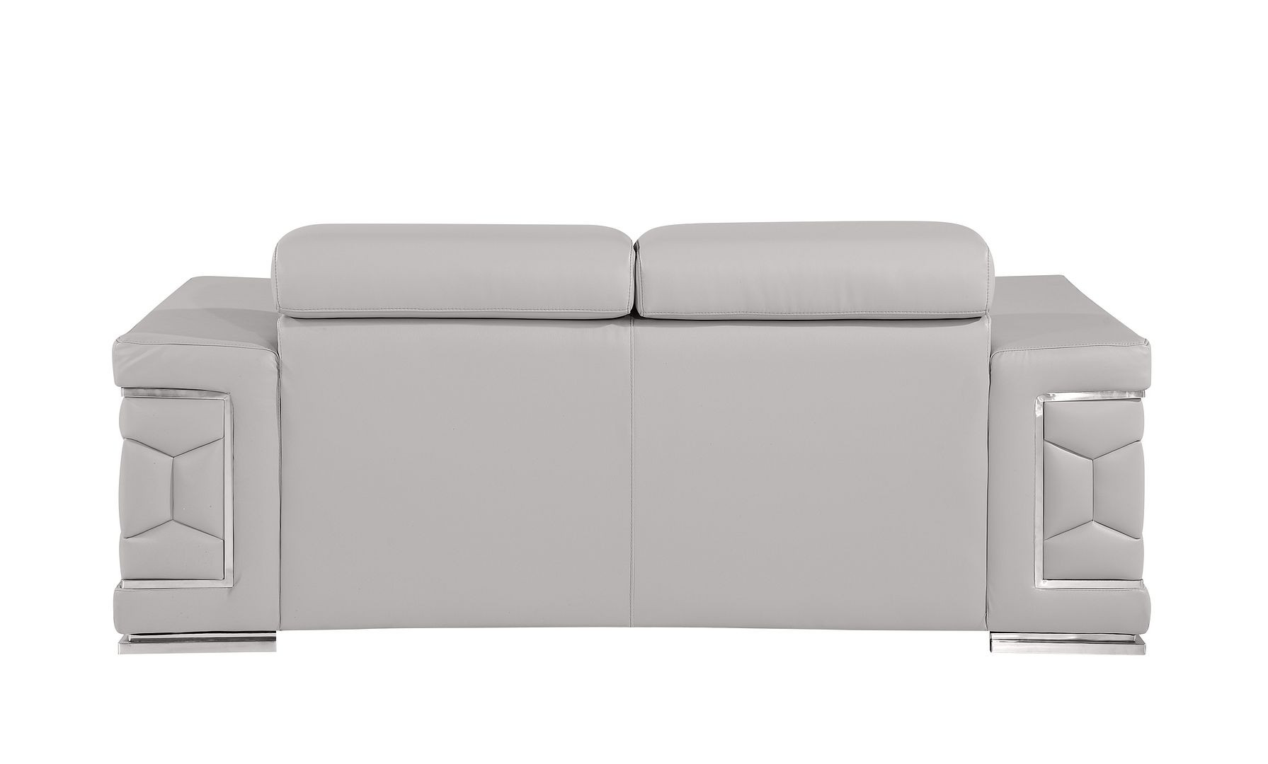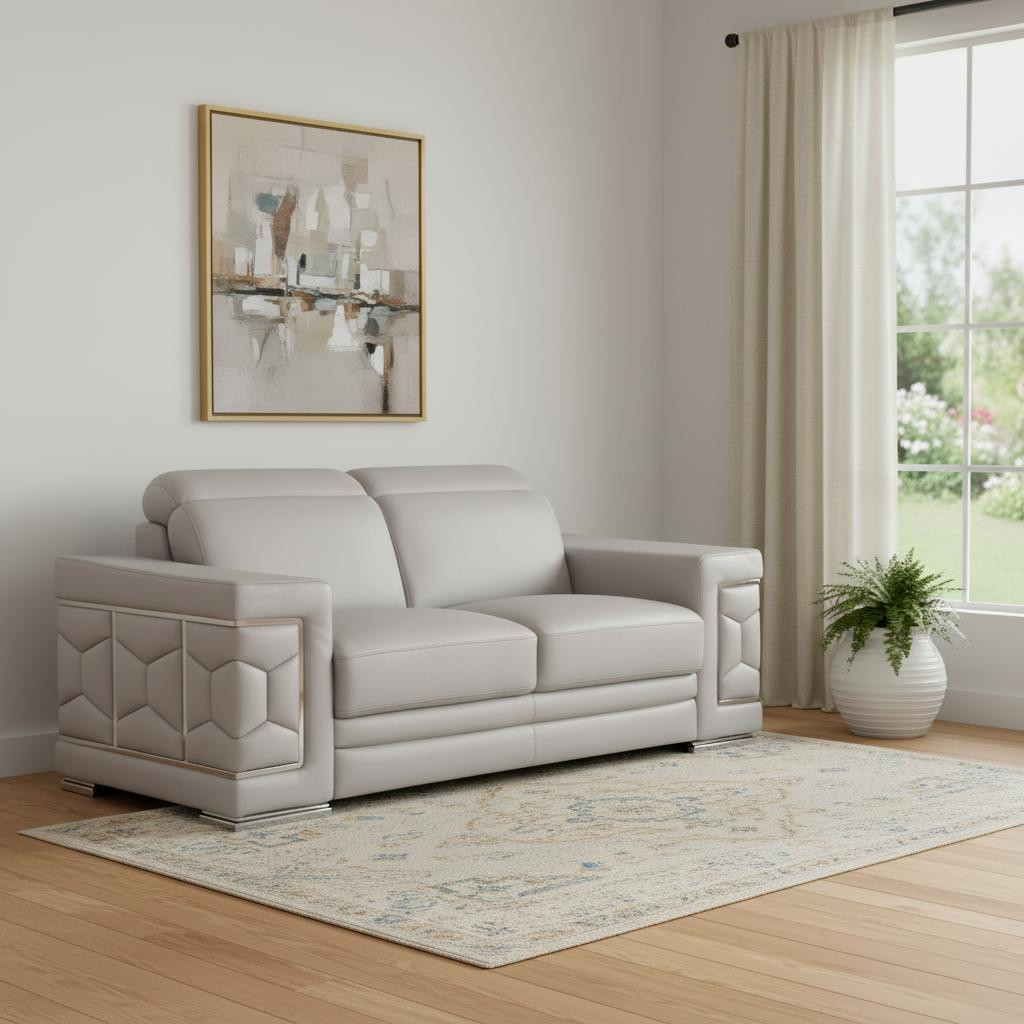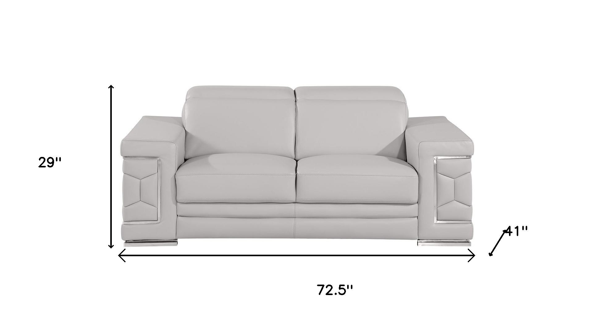 Made of top quality, supple leather, this 73-inch light gray and silver leather reclining loveseat will be the star of your space. The high grade premium leather used makes your lounging luxuriously comfortable and adds an elegant appeal to your space. Square arms offer a comfy place to rest and give this piece some interest and shape. Silver metal legs effortlessly elevate the room and add a touch of contemporary design. A great showpiece for your room, this sofa is a must have. 29.00-inch h x 72.50-inch w x 41.00-inch d.