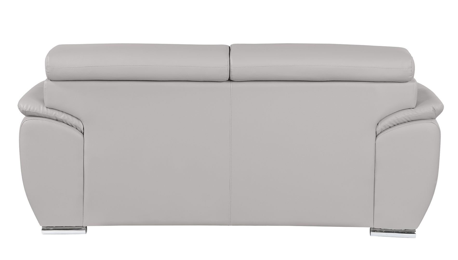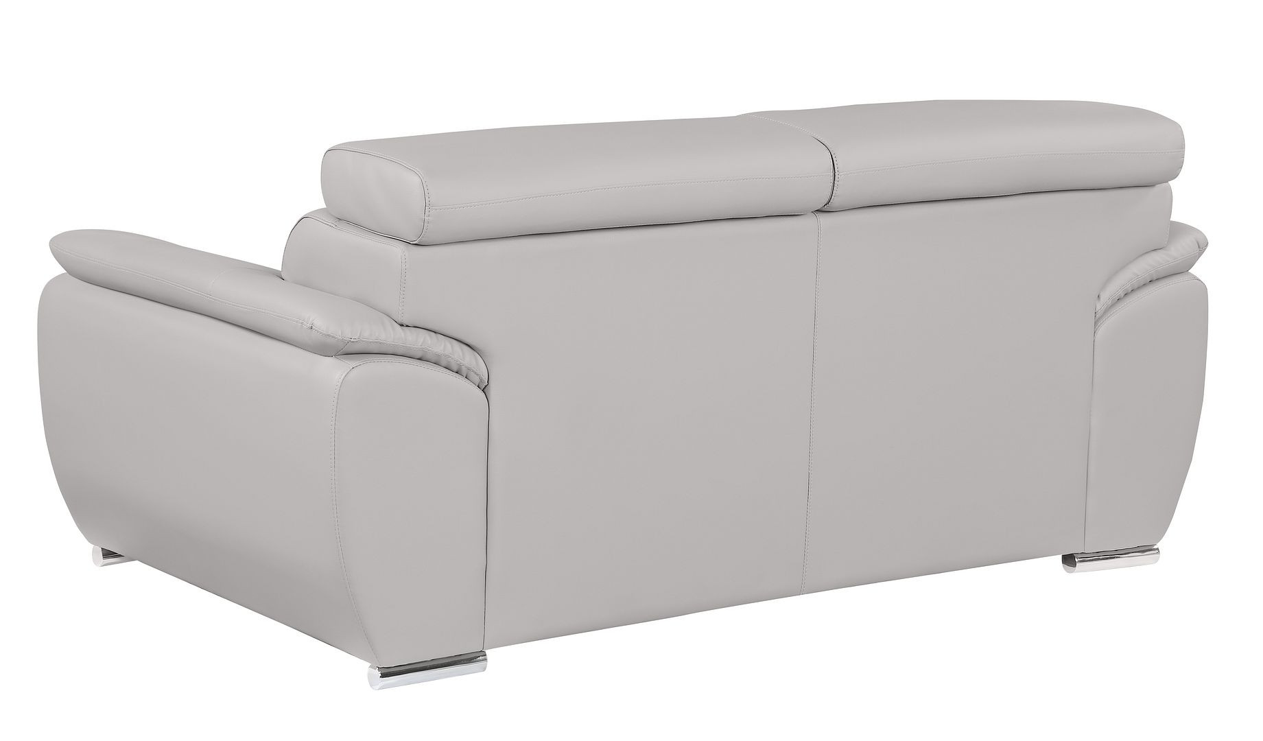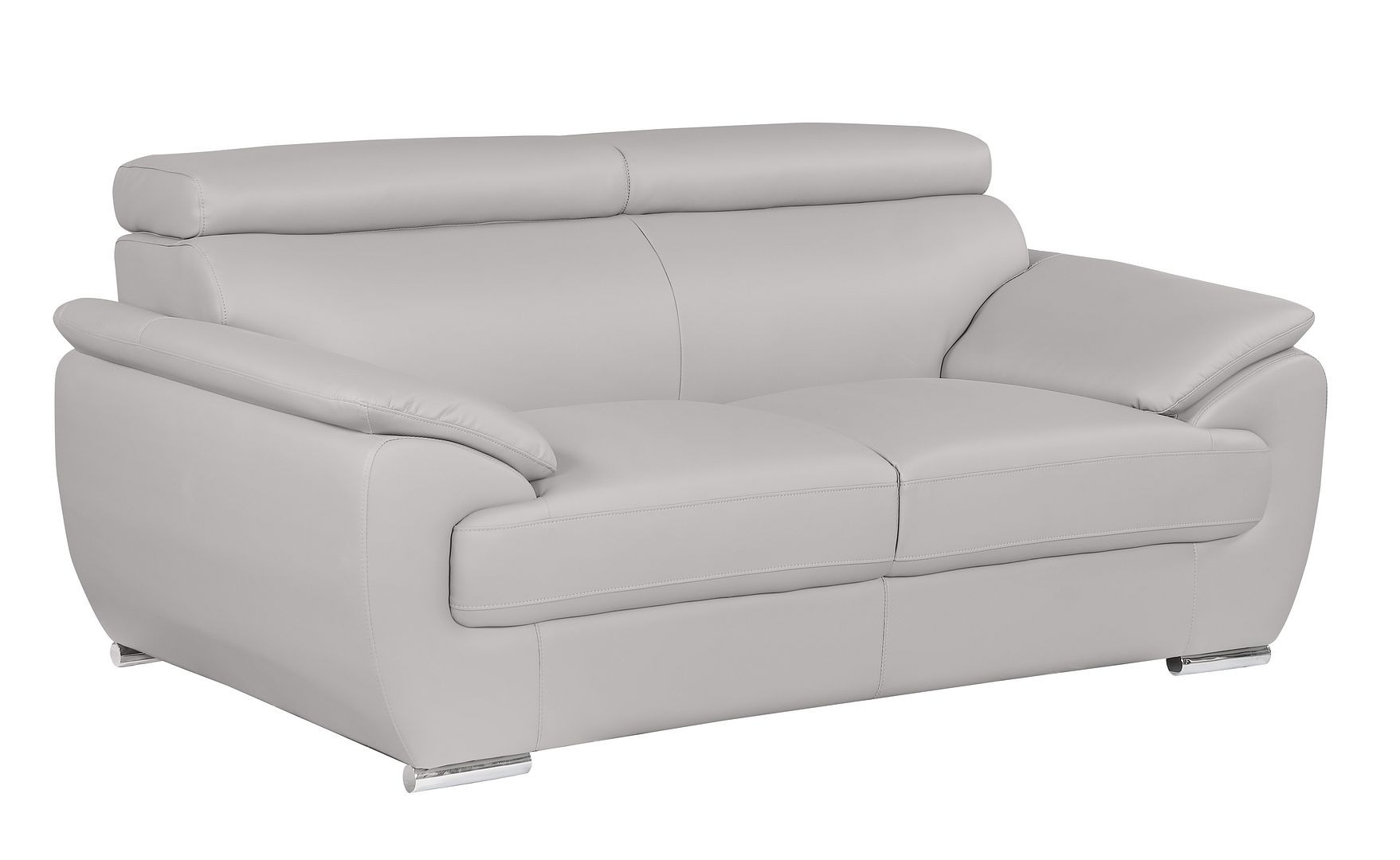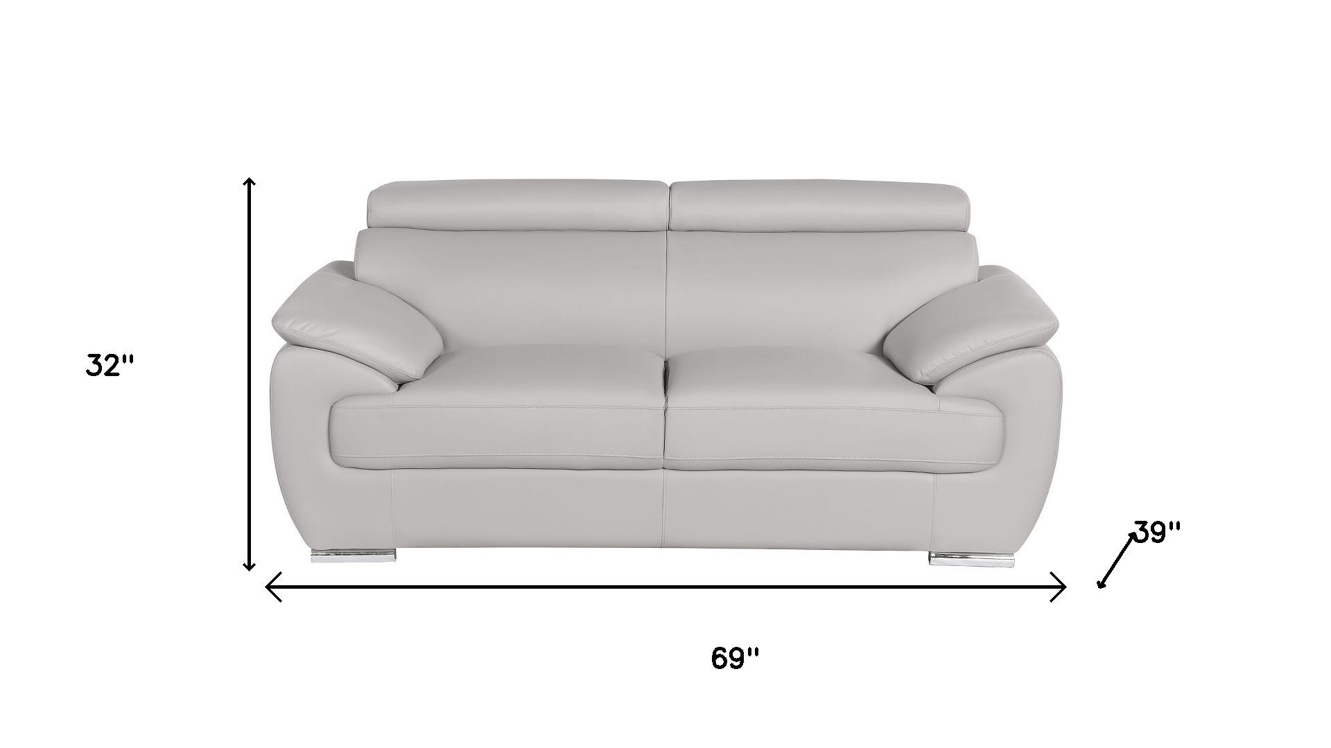 Made of top quality, supple leather, this 69-inch light gray and silver leather loveseat will be the star of your space. The high grade premium leather used makes your lounging luxuriously comfortable and adds an elegant appeal to your space. Round arms offer a comfy place to rest and give this piece some interest and shape. Silver metal legs effortlessly elevate the room and add a touch of contemporary design. A great showpiece for your room, this sofa is a must have. 32.00-inch h x 69.00-inch w x 39.00-inch d.