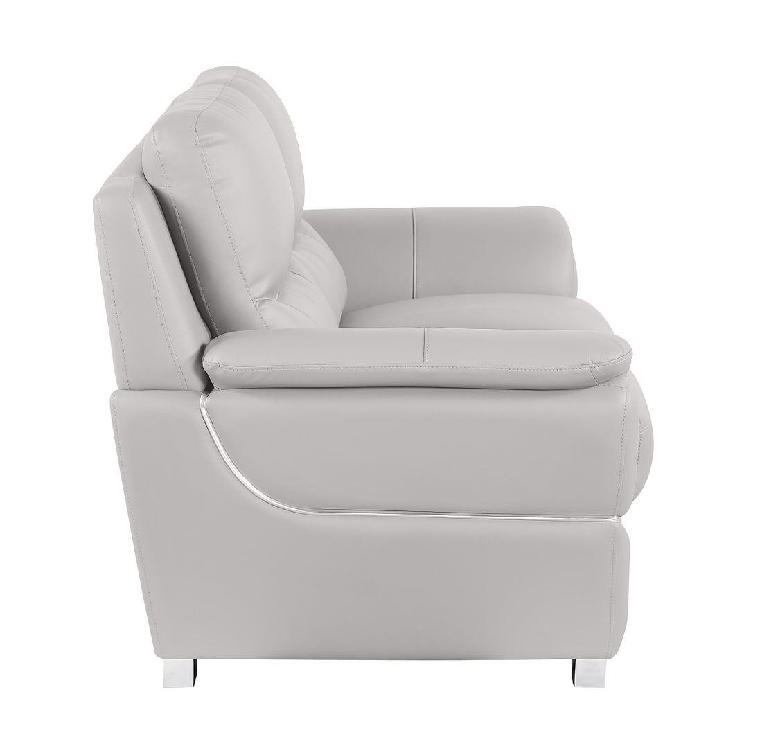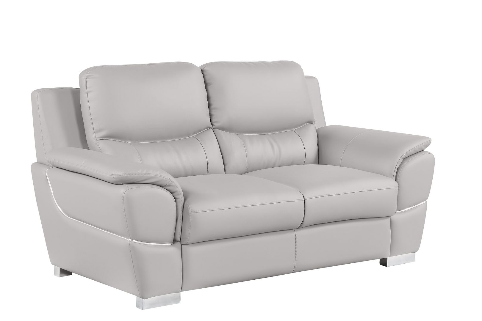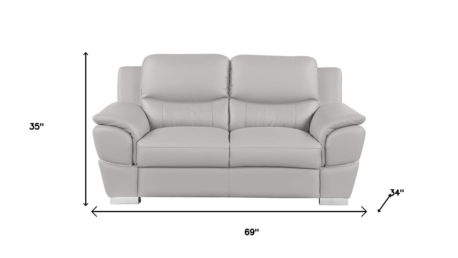 Superior construction from fabulously soft and high grade leather gives this 69-inch light gray and silver leather loveseat a leg up on the competition. The high grade premium leather used makes your lounging luxuriously comfortable and adds an elegant appeal to your space. Round arms offer a comfy place to rest and give this piece some interest and shape. Silver metal legs effortlessly elevate the room and add a touch of contemporary design. A great showpiece for your room, this sofa is a must have. 35.00-inch h x 69.00-inch w x 34.00-inch d.
