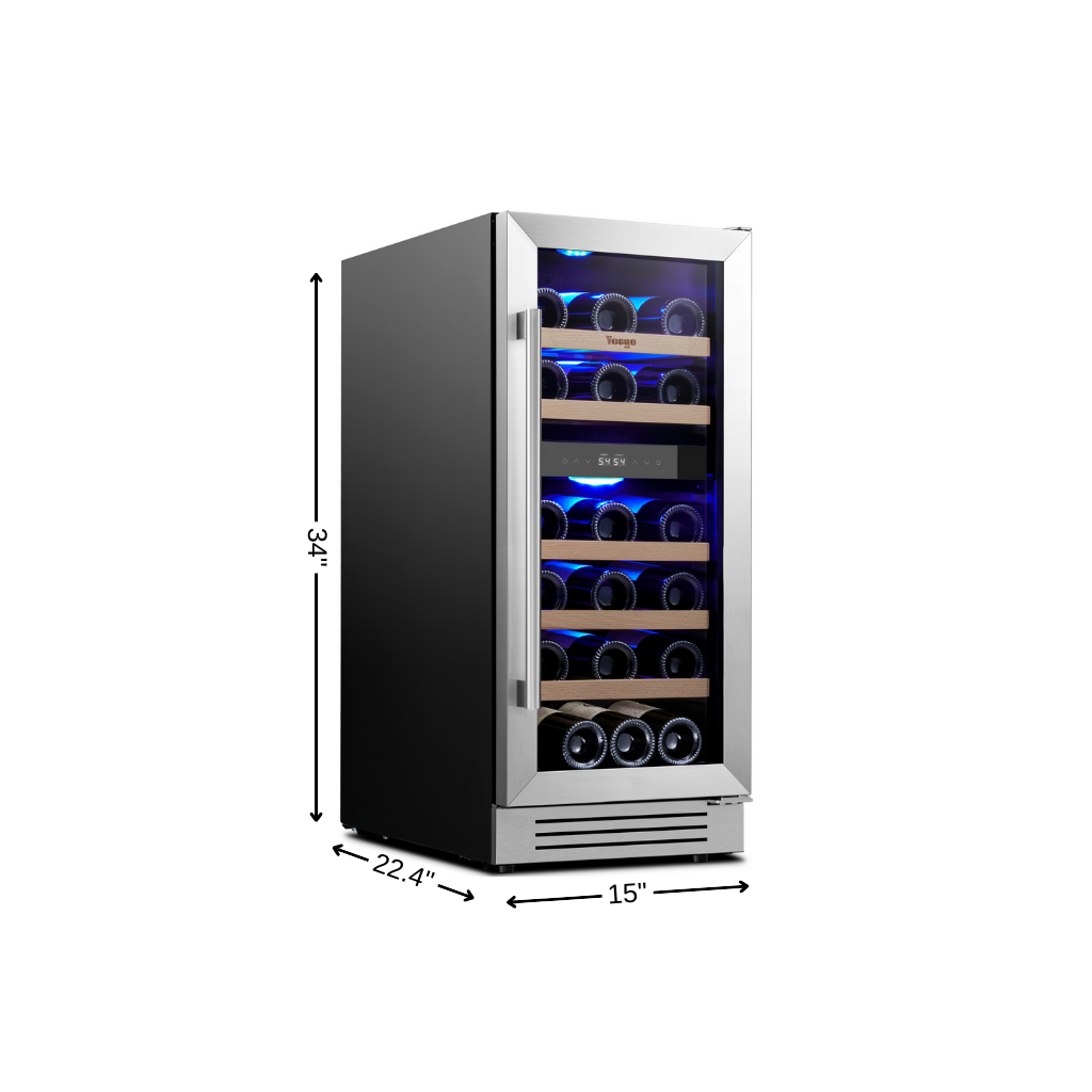 The 34-inch x 15-inch silver stainless steel dual compartment wine refrigerator is the perfect addition to any wine enthusiast's home. Designed for both freestanding and built-in installation, it offers versatility while enhancing your décor. Crafted from durable stainless steel, this wine cooler features a tempered glass door that effectively blocks UV rays, helping to maintain a steady internal temperature that ensures your valuable collection of wines are perfectly preserved. With five removable shelves, you can easily organize up to 28 standard Bordeaux-sized bottles, allowing for optimal storage and accessibility. Elevate your entertaining experience with this stylish and functional wine refrigerator that seamlessly blends form and function. 34.00-inch h x 15.00-inch w x 22.40-inch d.