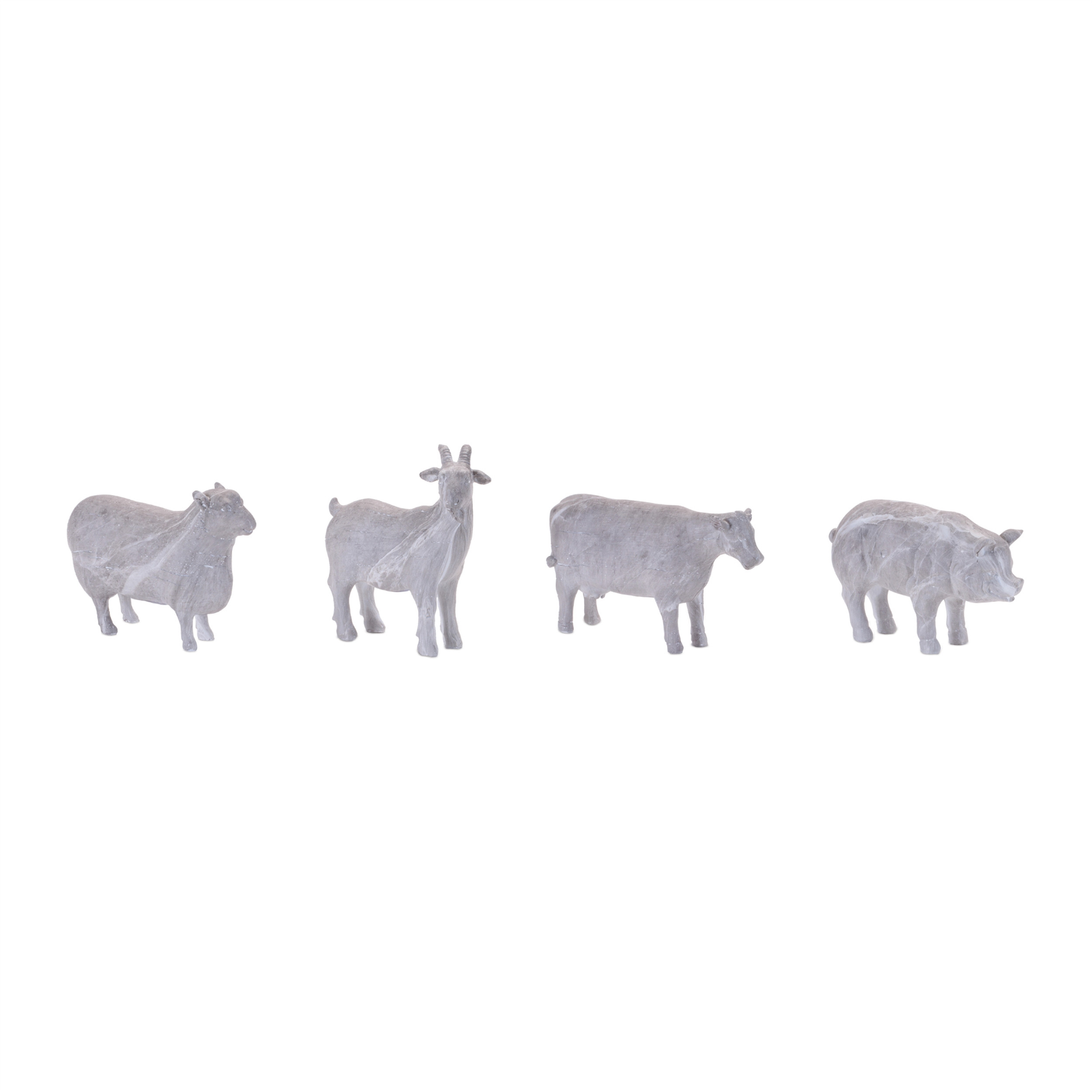 This set of four gray polyresin figurine will add a beautiful decorative accent to your decor. It's a perfect addition for those who love an up-to-the-minute look and feel. Featuring a captivating design inspired by various animals, this collection is ideal for animal lovers seeking unique decor. Each figurine is meticulously machine-made, ensuring consistency in quality and craftsmanship. The purposeful coat and paint distressing provide an artistic touch, enhancing the overall aesthetic appeal. This set serves not only as decorative pieces but also as conversation starters in any room of your home. 5.50-inch h x 5.00-inch w x 2.00-inch d.