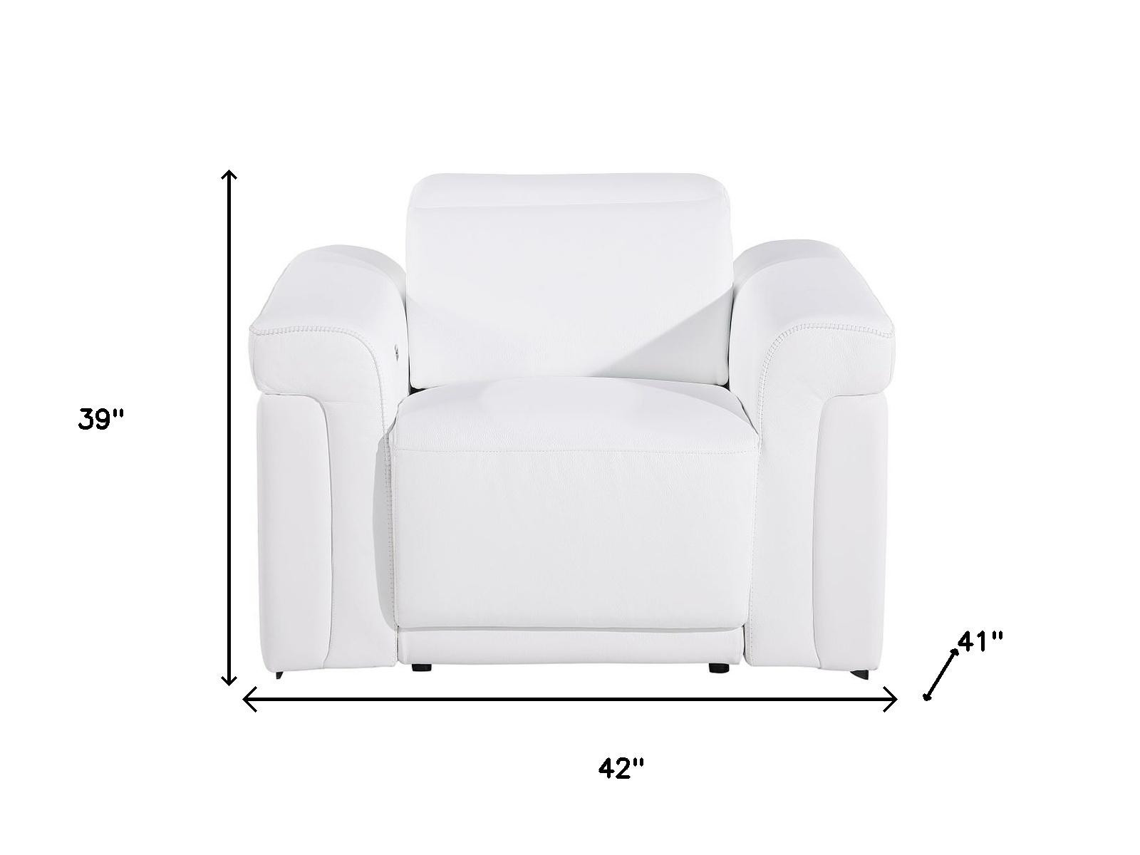 Just what you need, the 42-inch white italian leather power wall hugger recliner with usb is supremely comfortable and great looking. Designer grade italian leather gives this reclining chair a level of class and comfort to make your seating experience exceptional every day. You'll love that this stylish recliner comes in a neutral white that fits nicely with any décor. The power push button mechanism will allow you to smoothly adjust to your most comfortable position. A space-saving option, this wall hugger recliner can be installed in close proximity to the wall because it requires minimal clearance. Whether you are starting your day, ending your day, or sneaking in a cat nap in between, this chair is a welcome addition to your space and self-care routine. Recliners are a comfortable and practical option for living room, family room, den, bedroom, or nursery. 39.00-inch h x 42.00-inch w x 41.00-inch d.