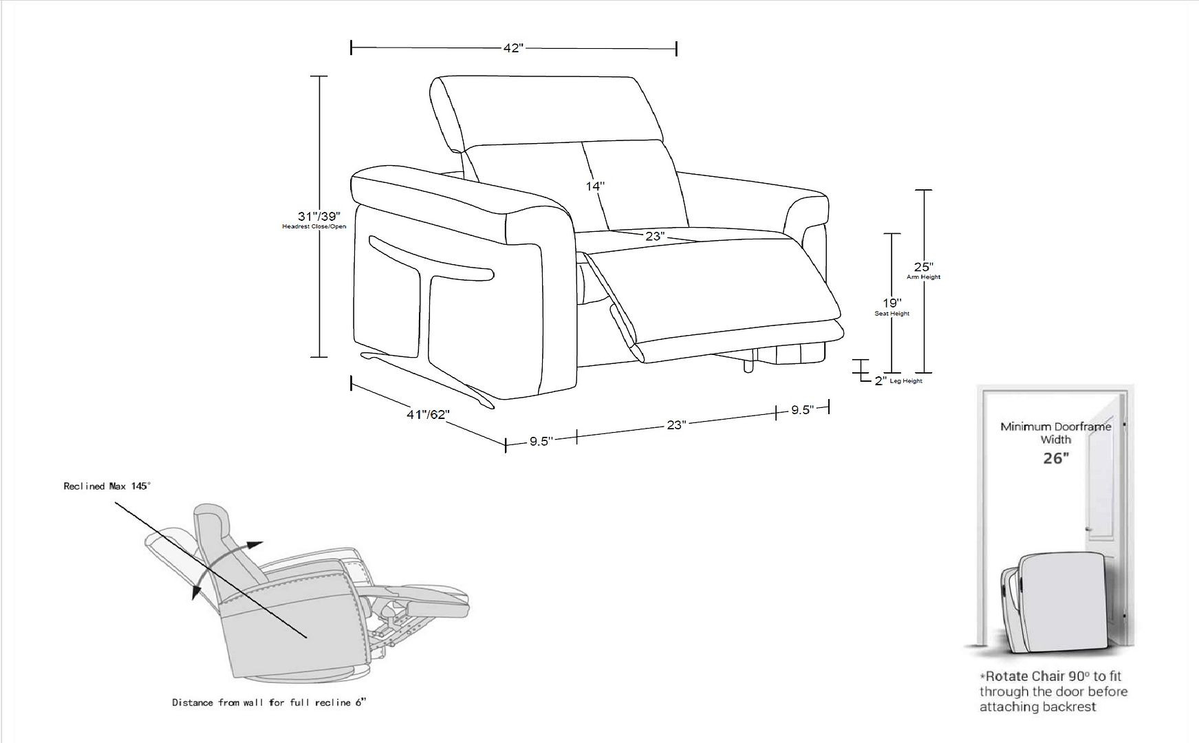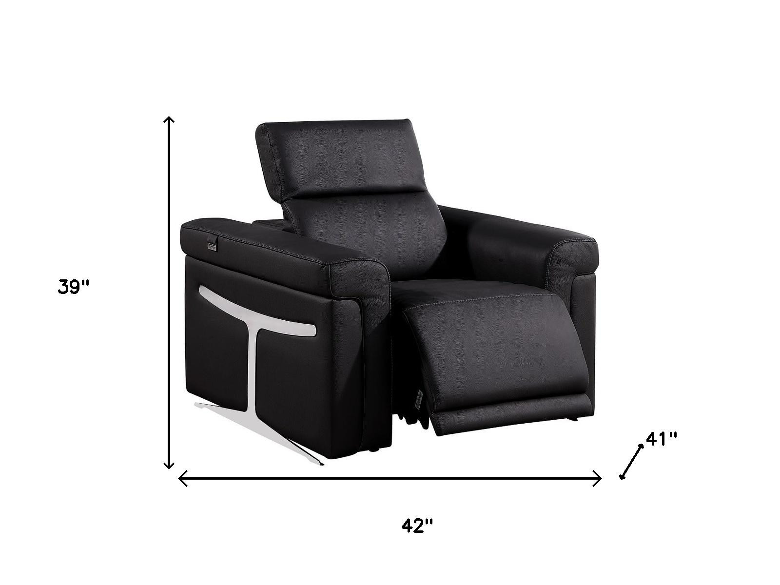 Just what you need, the 42-inch black italian leather power wall hugger recliner with usb is supremely comfortable and great looking. Soft and supple high grade italian leather upholstery makes this chair a great place to rest, nap, or read. Black upholstery gives this chair a chic and modern look. The push-button controls make it easy to adjust the angle of your recline. A space-saving option, this wall hugger recliner can be installed in close proximity to the wall because it requires minimal clearance. From morning coffee to evening tv/movie nights and everything in between, this cozy chair will be a welcome addition to your rest and relaxation routine. Recliners are a comfortable and practical option for living room, family room, den, bedroom, or nursery. 39.00-inch h x 42.00-inch w x 41.00-inch d.
