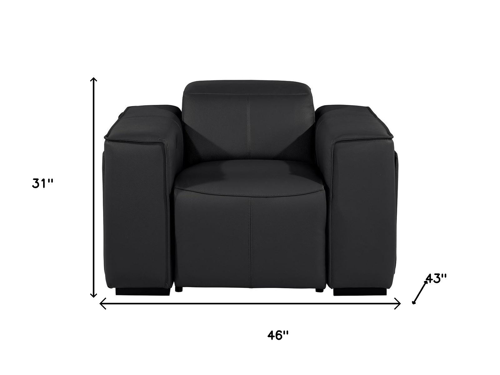 Comfortable and designed with convenience in mind, this 46-inch black italian leather power wall hugger recliner with usb has everything you are looking for. Soft and supple high grade italian leather upholstery makes this chair a great place to rest, nap, or read. Bold black gives this chair a modern chic look and feel. The push-button controls make it easy to adjust the angle of your recline. A space-saving option, this wall hugger recliner can be installed in close proximity to the wall because it requires minimal clearance. From morning coffee to evening tv/movie nights and everything in between, this cozy chair will be a welcome addition to your rest and relaxation routine. Take relaxation to the next level with this comfy reclining chair. 31.00-inch h x 46.00-inch w x 43.00-inch d.