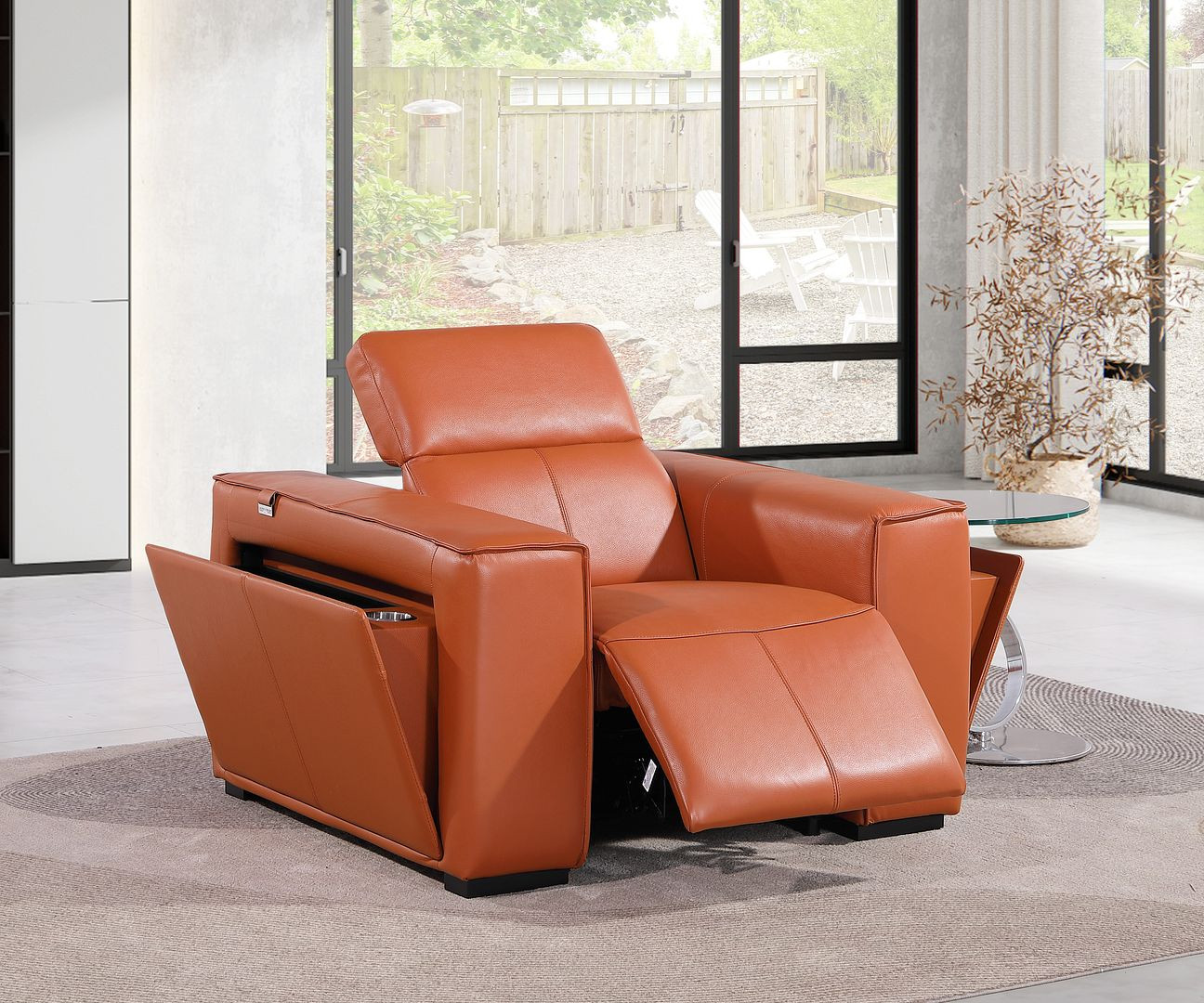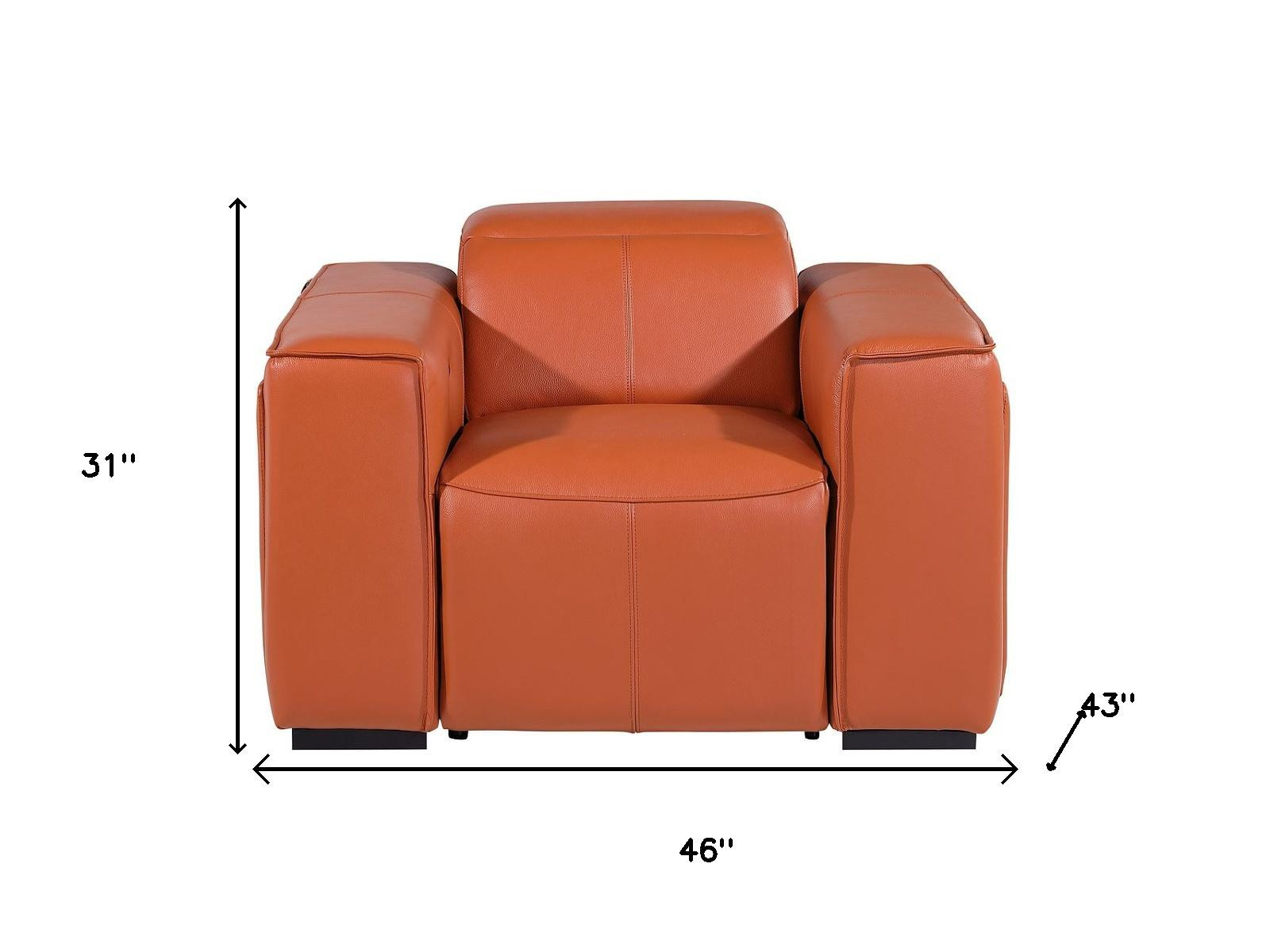 With this 46-inch camel italian leather power wall hugger recliner with usb, you can experience the comfort of cozy with a design that looks every bit of today. Upholstered in high grade, italian leather, this chair will provide a soft and luxurious way for you to relax and rest. Features a warm camel coloration that will easily blend with the colors of your room. The push-button controls make it easy to adjust the angle of your recline. A space-saving option, this wall hugger recliner can be installed in close proximity to the wall because it requires minimal clearance. Whether you are starting your day, ending your day, or sneaking in a cat nap in between, this chair is a welcome addition to your space and self-care routine. Take relaxation to the next level with this comfy reclining chair. 31.00-inch h x 46.00-inch w x 43.00-inch d.