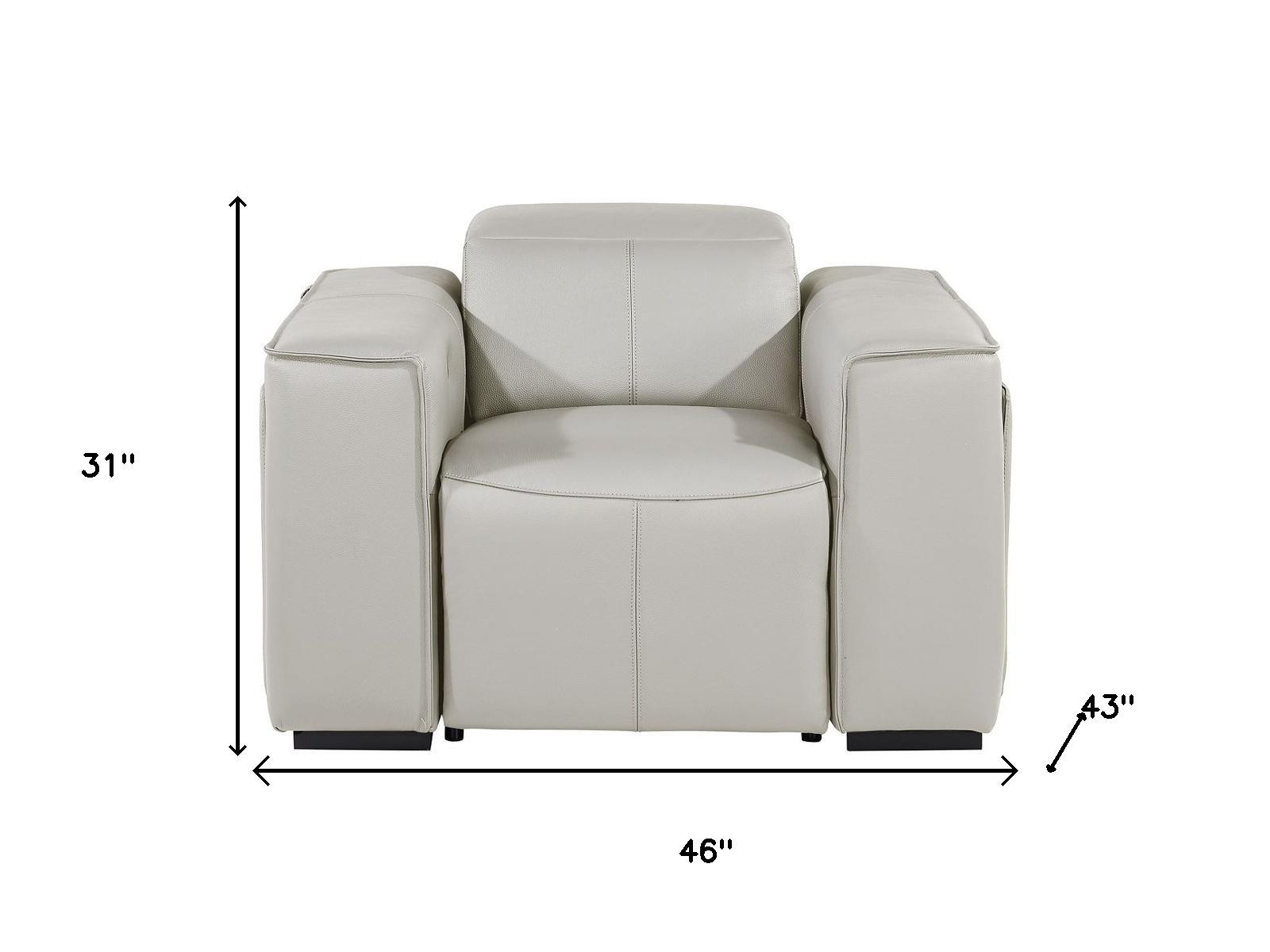 Achieve maximum comfort and relaxation with the 46-inch ash gray italian leather power wall hugger recliner with usb. Designer grade italian leather gives this reclining chair a level of class and comfort to make your seating experience exceptional every day. The push-button controls make it easy to adjust the angle of your recline. A space-saving option, this wall hugger recliner can be installed in close proximity to the wall because it requires minimal clearance. From morning coffee to evening tv/movie nights and everything in between, this cozy chair will be a welcome addition to your rest and relaxation routine. Recliners are a comfortable and practical option for living room, family room, den, bedroom, or nursery. 31.00-inch h x 46.00-inch w x 43.00-inch d.