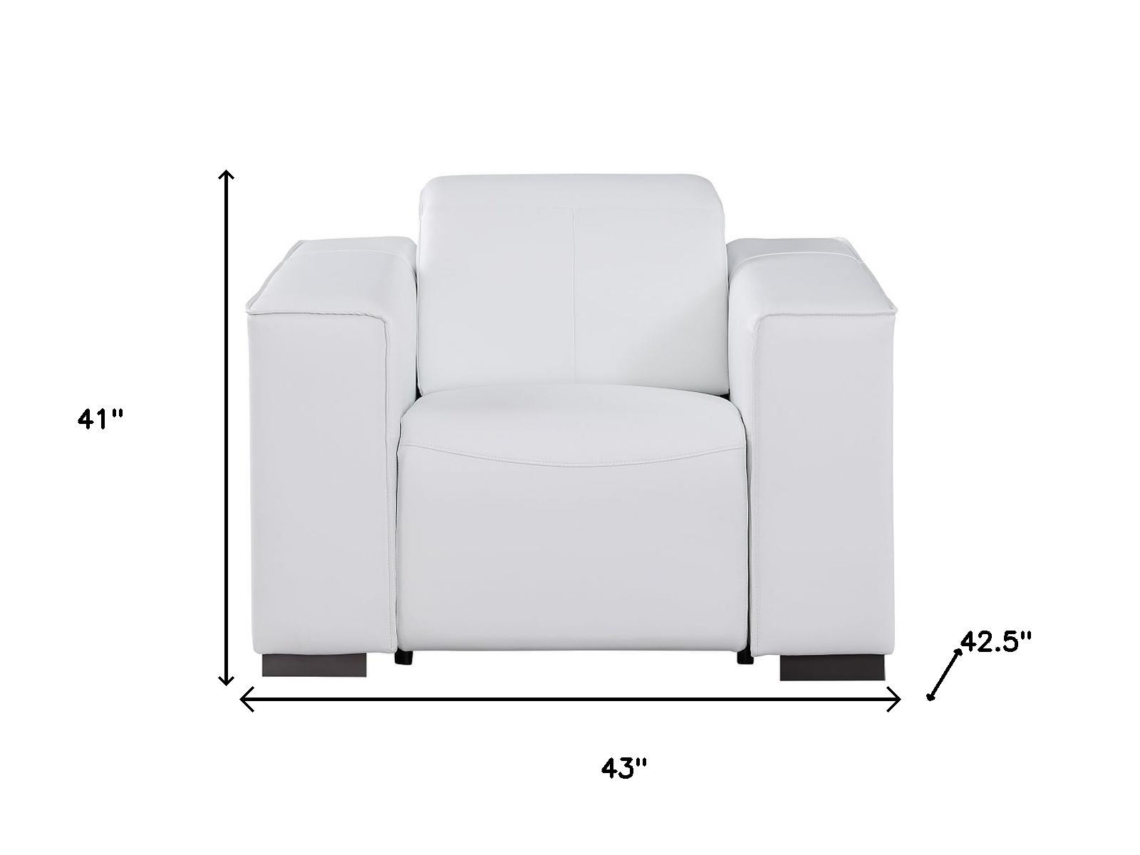 Just what you need, the 43-inch white genuine leather power wall hugger recliner with usb is supremely comfortable and great looking. Designer grade genuine leather gives this reclining chair a level of class and comfort to make your seating experience exceptional every day. The white of this chair is neutral to will blend with most any décor aesthetic. The push-button controls make it easy to adjust the angle of your recline. A space-saving option, this wall hugger recliner can be installed in close proximity to the wall because it requires minimal clearance. From morning coffee to evening tv/movie nights and everything in between, this cozy chair will be a welcome addition to your rest and relaxation routine. Recliners are a comfortable and practical option for living room, family room, den, bedroom, or nursery. 41.00-inch h x 43.00-inch w x 42.50-inch d.