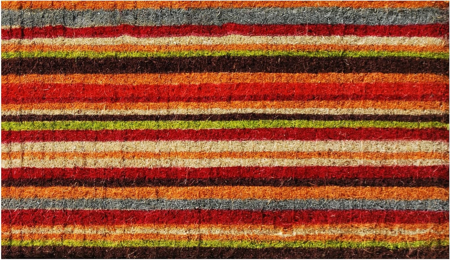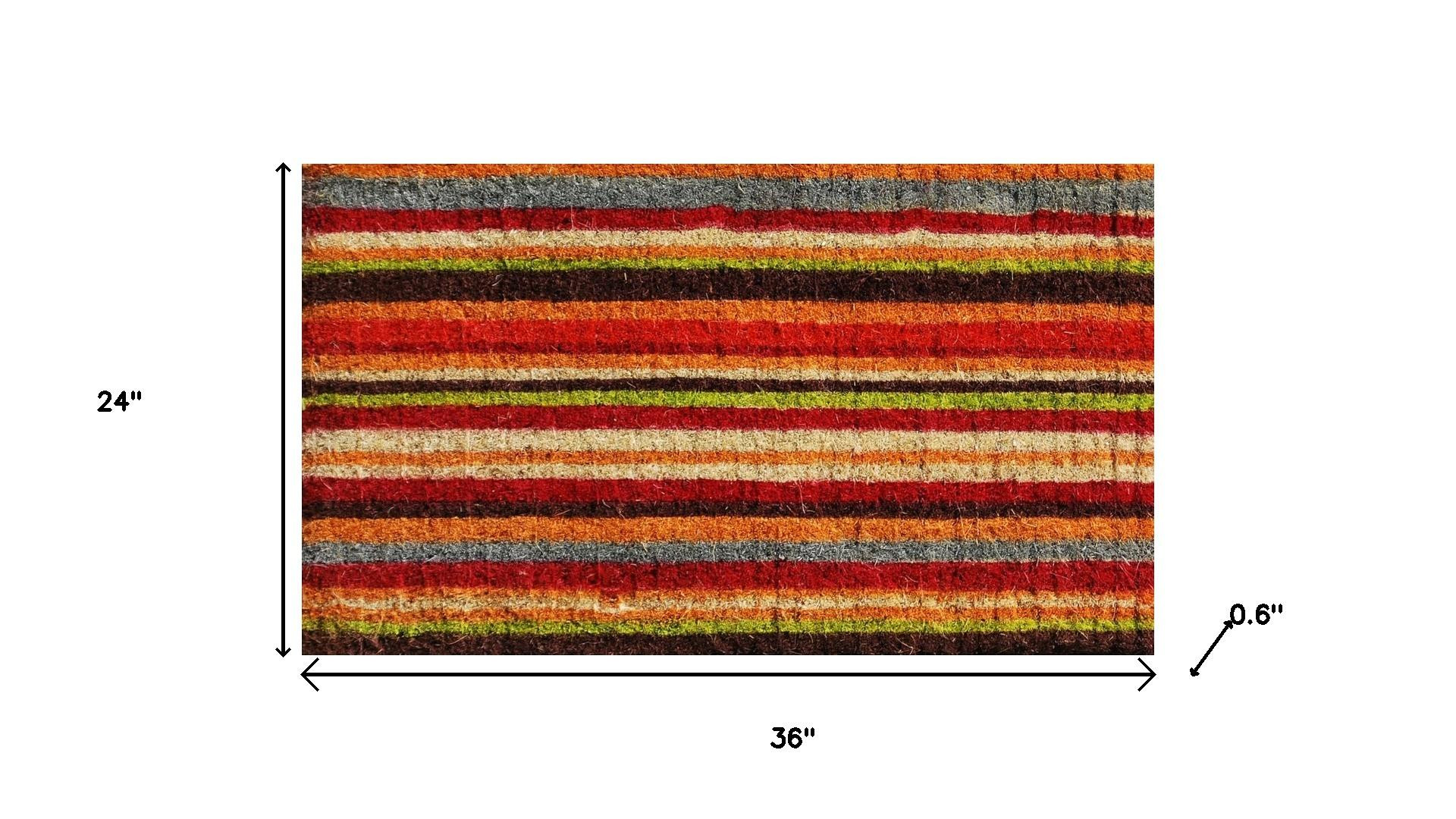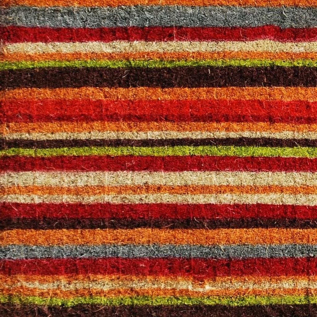 Known for it's extreme durability and ability to withstand heavy foot traffic, this 24-inch x 36-inch red orange and green variegated stripe outdoor coir door mat is an ideal option for the front door or entrance way of your home or business. Crafted from coconut husks, this mat is not only functional but is an an eco-friendly and visually appealing accessory. The naturally bristled texture of coir is an efficient way to clean dirt and mud from shoes and is easy to clean and maintain. 24.00-inch h x 36.00-inch w x 0.60-inch d.