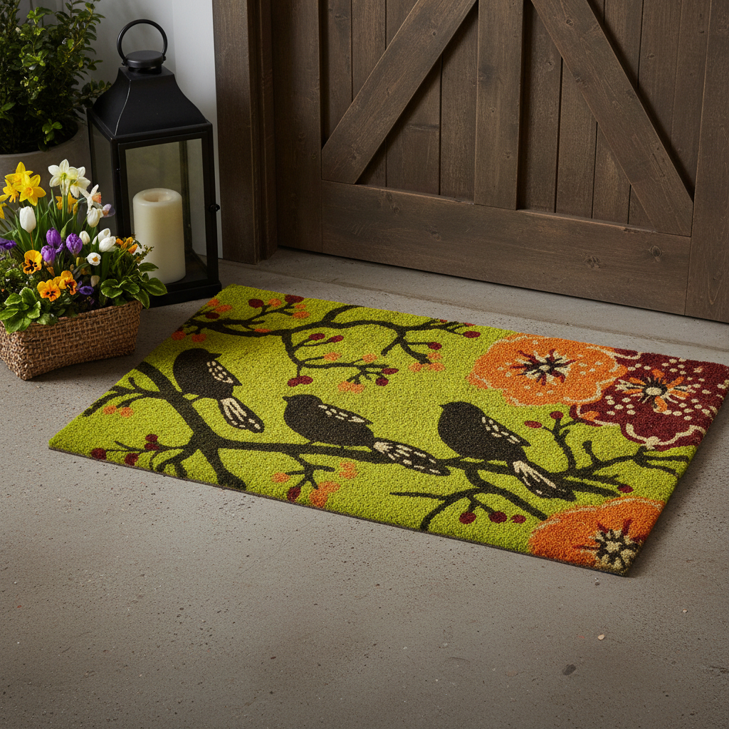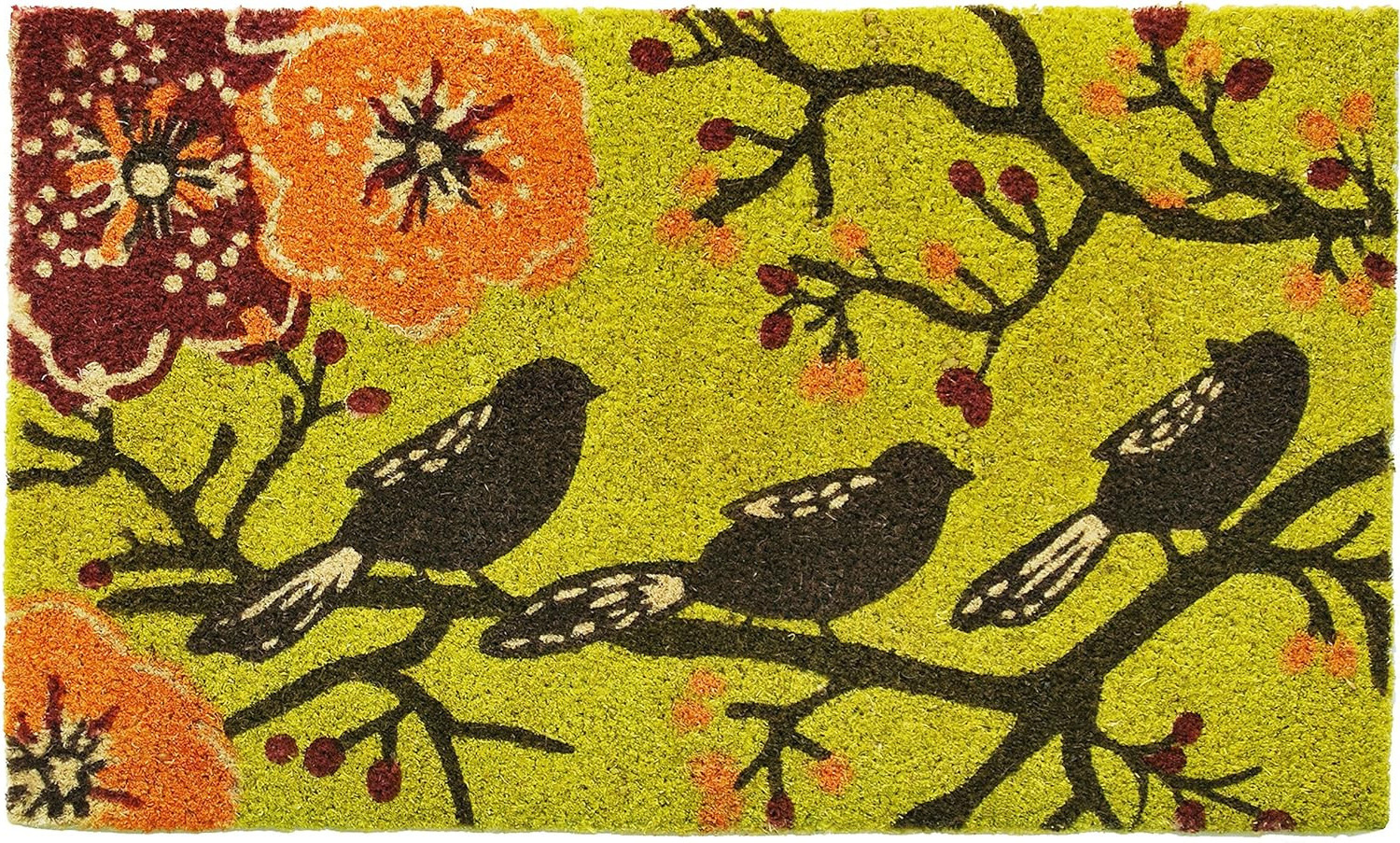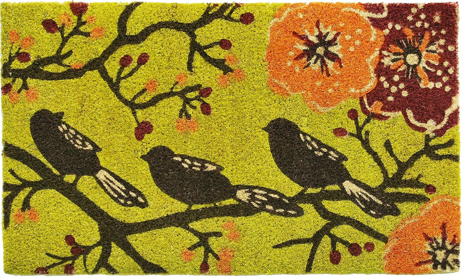 Known for it's extreme durability and ability to withstand heavy foot traffic, this 17-inch x 29-inch green black and orange floral birds outdoor coir door mat is an ideal option for the front door or entrance way of your home or business. Crafted from coconut husks, this mat is not only functional but is an an eco-friendly and visually appealing accessory. The naturally bristled texture of coir is an efficient way to clean dirt and mud from shoes and is easy to clean and maintain. 17.00-inch h x 29.00-inch w x 0.60-inch d.
