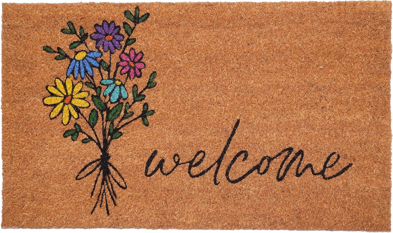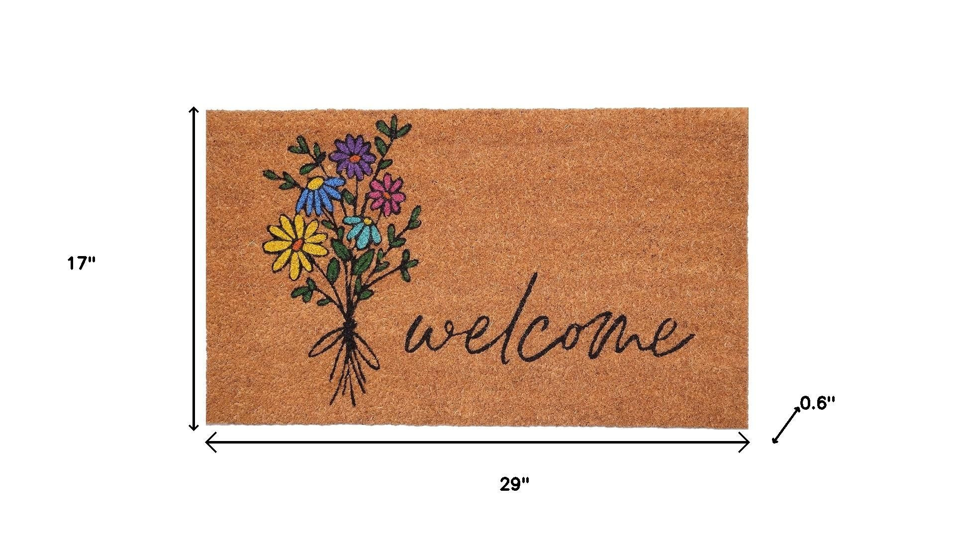 Known for it's extreme durability and ability to withstand heavy foot traffic, this 17-inch x 29-inch brown black and green floral bouquet welcome outdoor coir door mat is an ideal option for the front door or entrance way of your home or business. Crafted from coconut husks, this mat is not only functional but is an an eco-friendly and visually appealing accessory. The naturally bristled texture of coir is an efficient way to clean dirt and mud from shoes and is easy to clean and maintain. 17.00-inch h x 29.00-inch w x 0.60-inch d.
