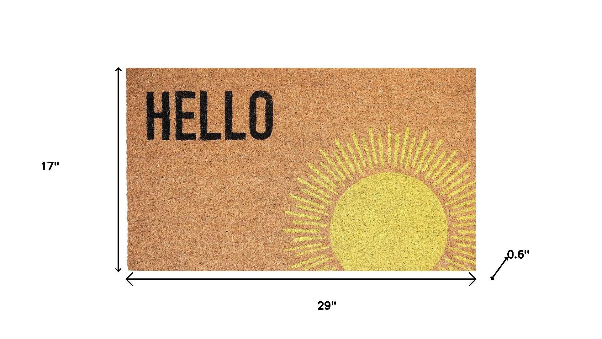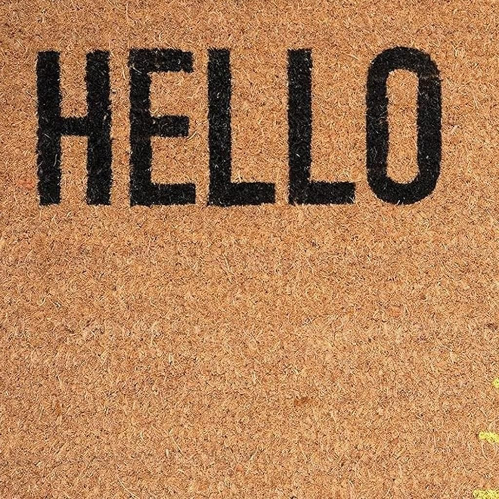 Known for it's extreme durability and ability to withstand heavy foot traffic, this 17-inch x 29-inch brown yellow and black sunny hello outdoor coir door mat is an ideal option for the front door or entrance way of your home or business. Crafted from coconut husks, this mat is not only functional but is an an eco-friendly and visually appealing accessory. The naturally bristled texture of coir is an efficient way to clean dirt and mud from shoes and is easy to clean and maintain. 17.00-inch h x 29.00-inch w x 0.60-inch d.