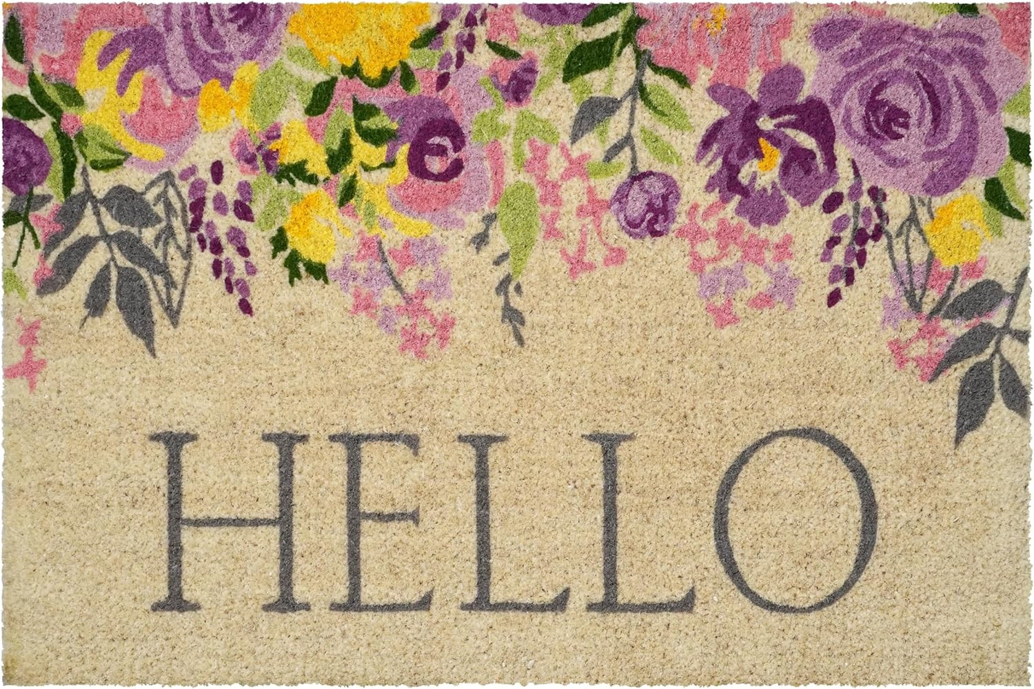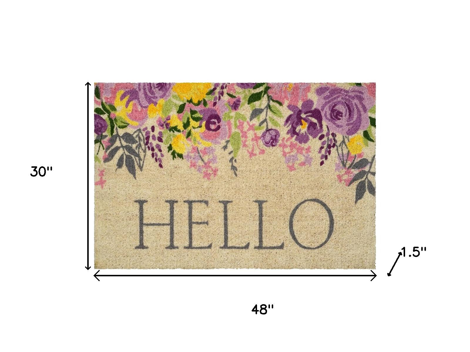 Known for it's extreme durability and ability to withstand heavy foot traffic, this 30-inch x 48-inch brown gray and purple floral hello outdoor coir door mat is an ideal option for the front door or entrance way of your home or business. Crafted from coconut husks, this mat is not only functional but is an an eco-friendly and visually appealing accessory. The naturally bristled texture of coir is an efficient way to clean dirt and mud from shoes and is easy to clean and maintain. 30.00-inch h x 48.00-inch w x 1.50-inch d.