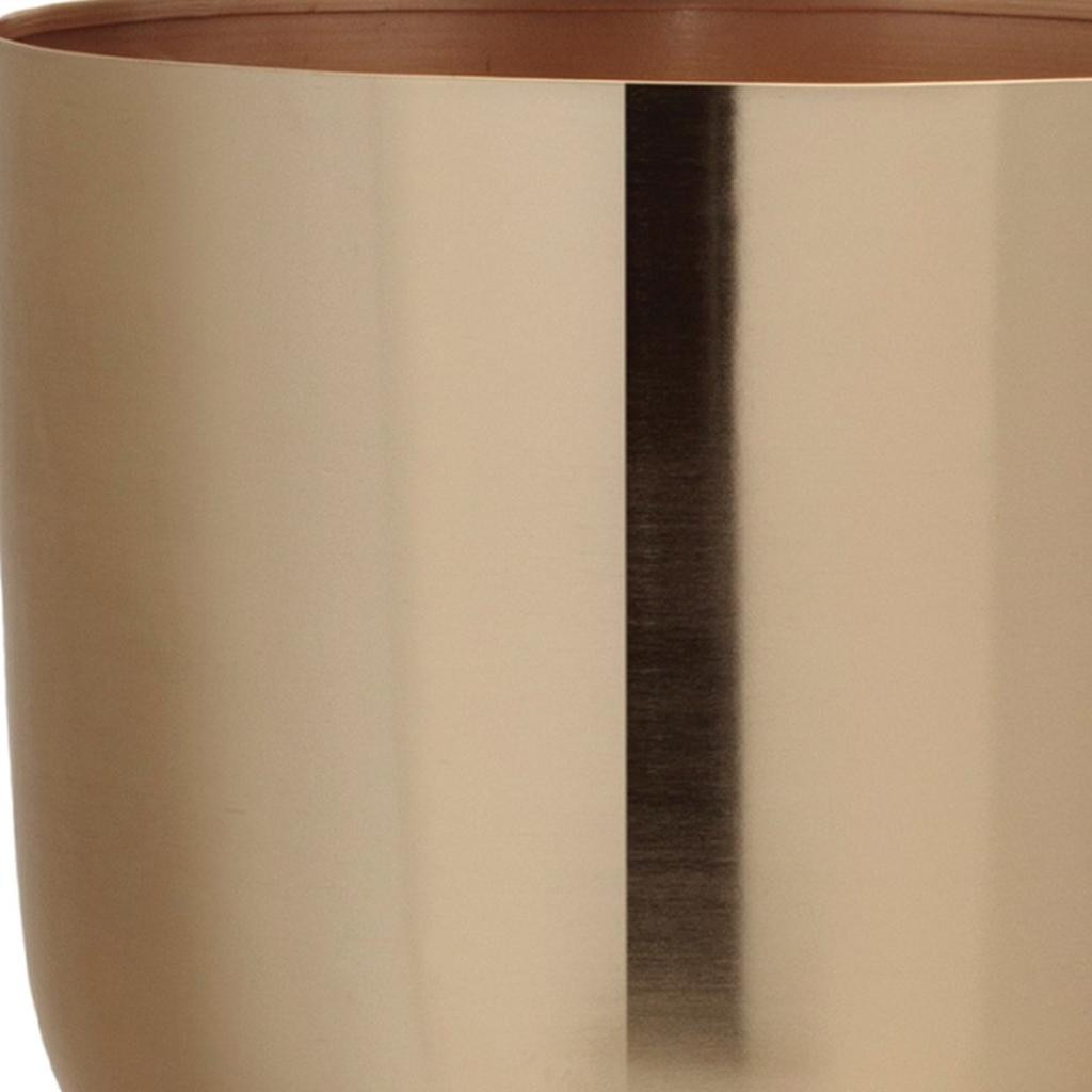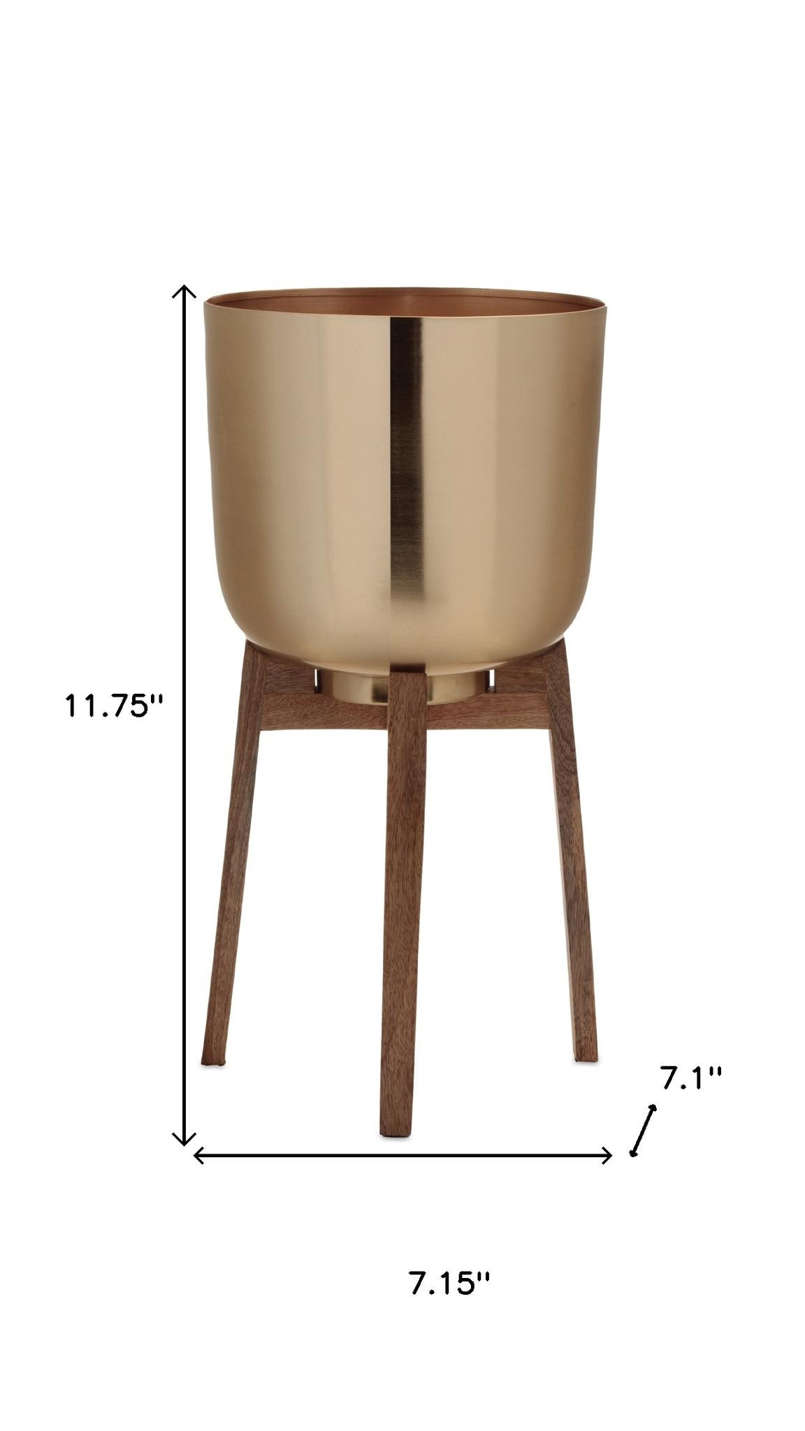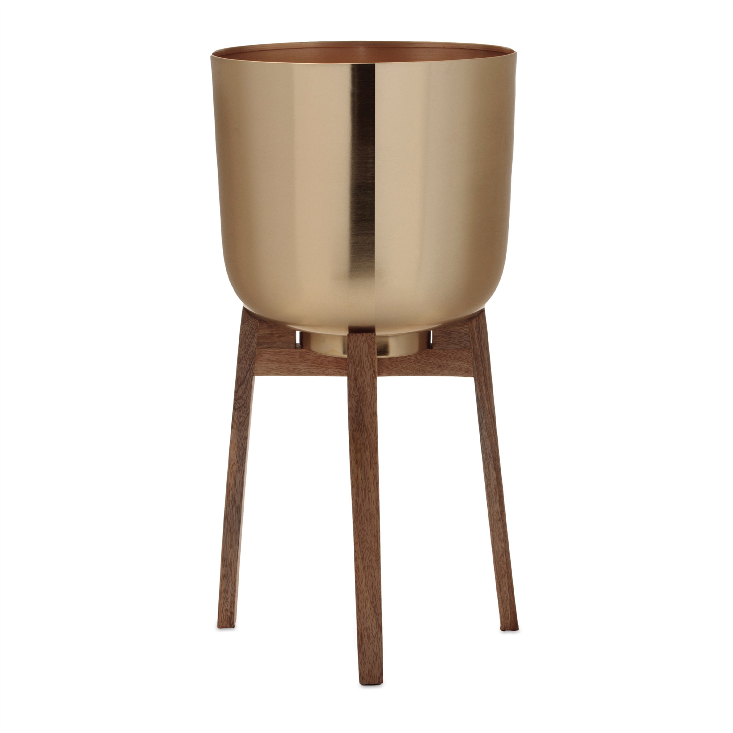 Set of two gold and natural metal and wood 65 ounce round elevated planters brings a touch of elegance to your indoor space. Crafted from high-quality cedar wood and metal, these planters are designed to showcase your favorite plants beautifully. The round shape adds a classic look that complements various decor styles seamlessly. Each planter in this set holds up to 65 ounces, providing ample space for your beloved greenery. With an elevated design, they help create visual interest while ensuring your plants receive optimal light. Perfect for adding a modern flair, this duo will enhance any room while promoting a healthy indoor environment. Display them together or separately for a versatile decor solution that elevates your plant game. 11.75-inch h x 7.15-inch w x 7.10-inch d.