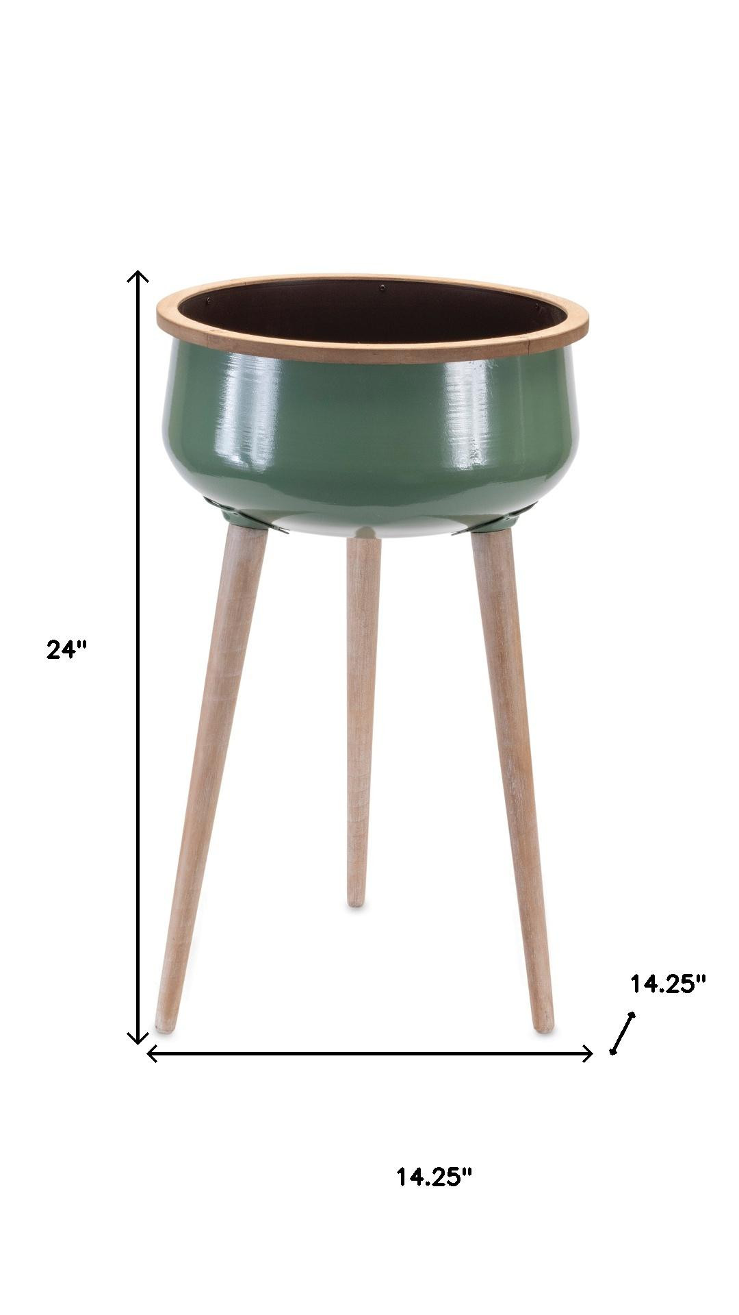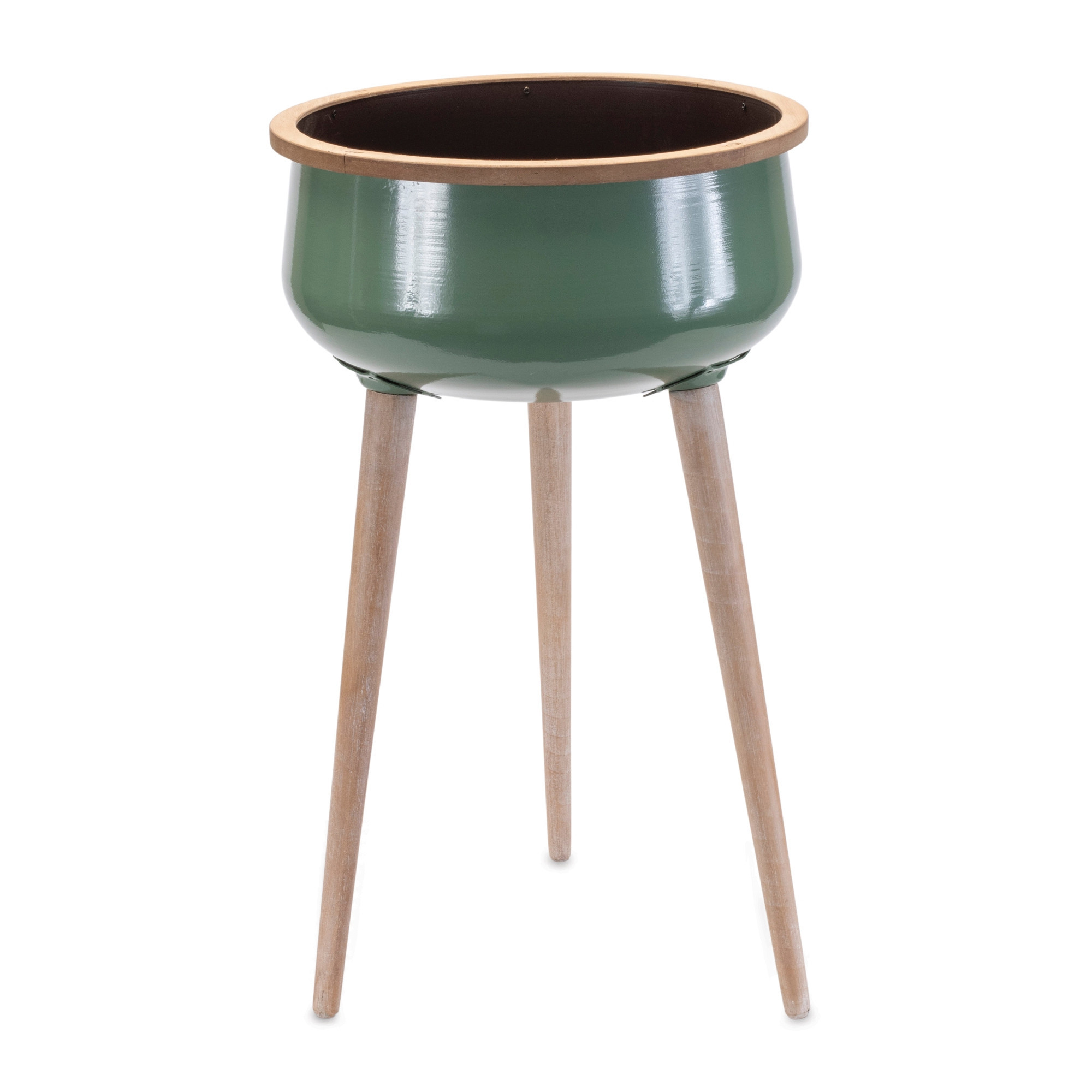 Green and natural metal and wood 130 ounce round elevated planter is designed to bring a touch of nature indoors. This elevated planter elevates your plants for a stylish display while optimizing space. Crafted from durable metal and wood, it offers a harmonious blend of materials that enhance any decor. The round shape adds a soft, inviting element, making it perfect for both modern and traditional interiors. Its generous 130-ounce capacity accommodates a variety of plants, allowing you to create a vibrant indoor garden effortlessly. Ideal for showcasing your favorite greenery, this planter not only enhances your living space but also promotes healthy plant growth by providing excellent drainage and air circulation. Transform your indoor area with this exquisite piece. 24.00-inch h x 14.25-inch w x 14.25-inch d.