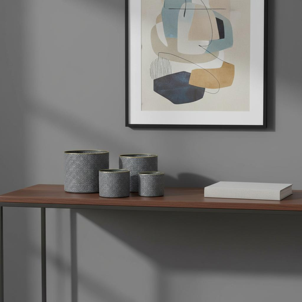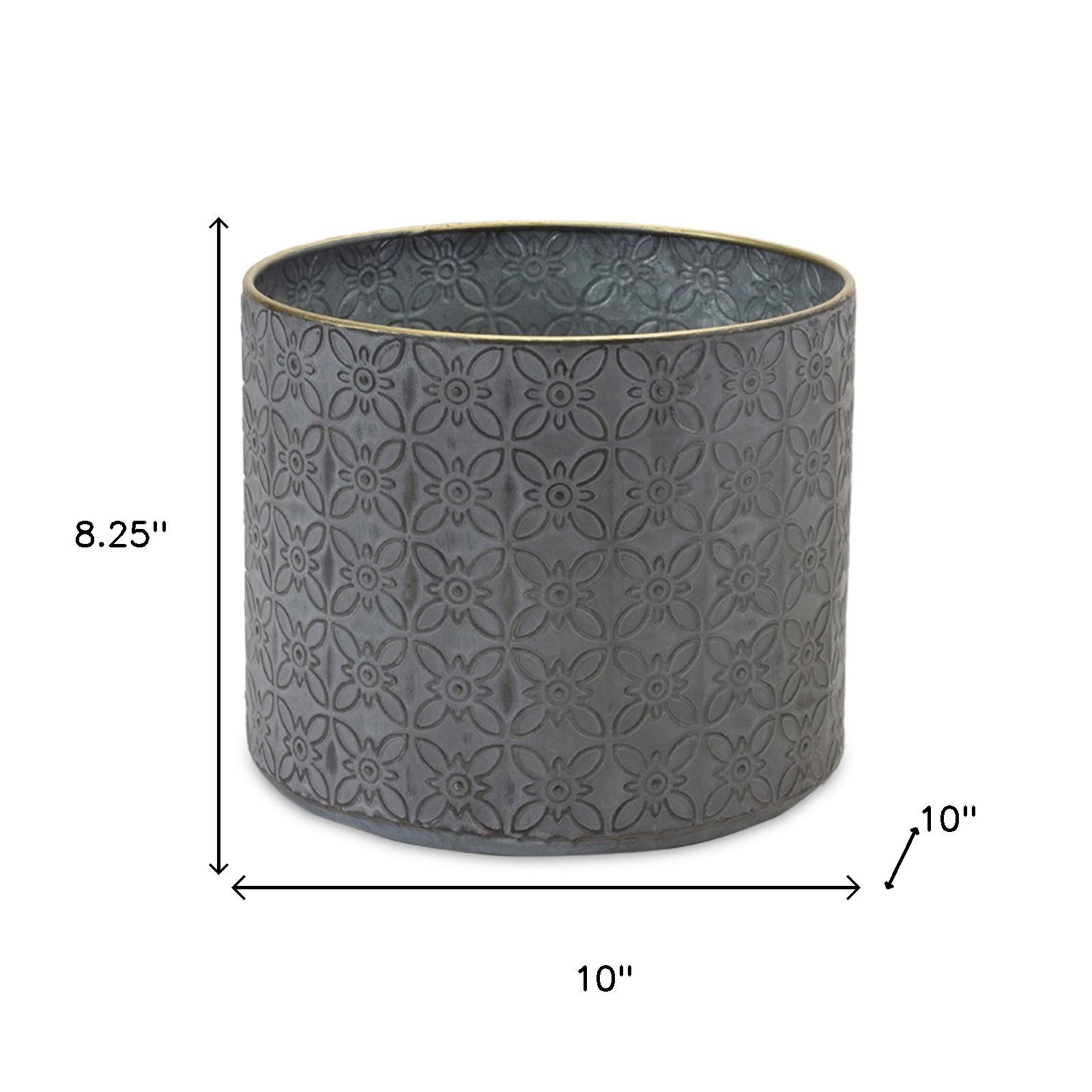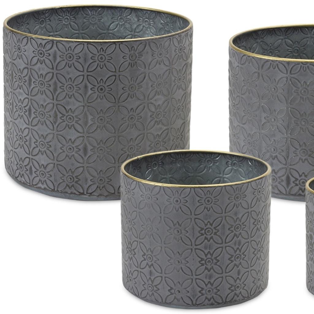 Set of four gray metal 22 ounce geometric round distressed pot planters brings a touch of modern minimalism to your indoor space. These round pot planters are crafted from durable metal, ensuring longevity and style. Featuring purposeful coat/paint distressing, each planter adds a unique character that enhances your decor. Designed for versatility, they are perfect for showcasing your favorite plants or herbs. This set includes four planters, making it easy to create a cohesive look in any room. Ideal for brightening up corners or adding greenery to shelves, these geometric planters are a fabulous choice for both contemporary and traditional interiors. Elevate your home with this stylish addition to your plant collection. 8.25-inch h x 10.00-inch w x 10.00-inch d.