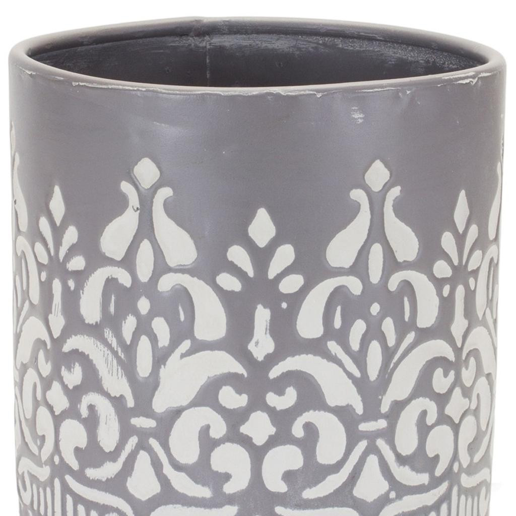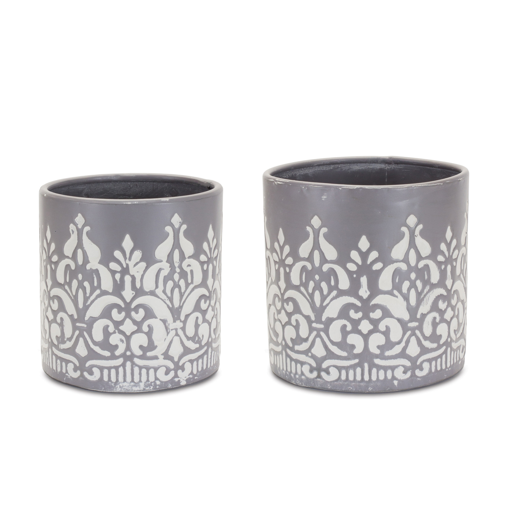 Set of two gray and white metal 11 ounce abstract round distressed pot planters brings a touch of modern elegance to your indoor space. These round pot planters are perfect for showcasing your favorite plants while adding a stylish accent to your decor. Made from durable metal, they ensure longevity and support your greenery beautifully. The purposeful coat and paint distressing adds a unique character to each piece, making them stand out in any room. With two planters included in the set, you can create an inviting arrangement in your home or office. Elevate your indoor gardening experience with these chic and functional planters that blend seamlessly with various interior styles. 7.50-inch h x 7.50-inch w x 7.50-inch d.