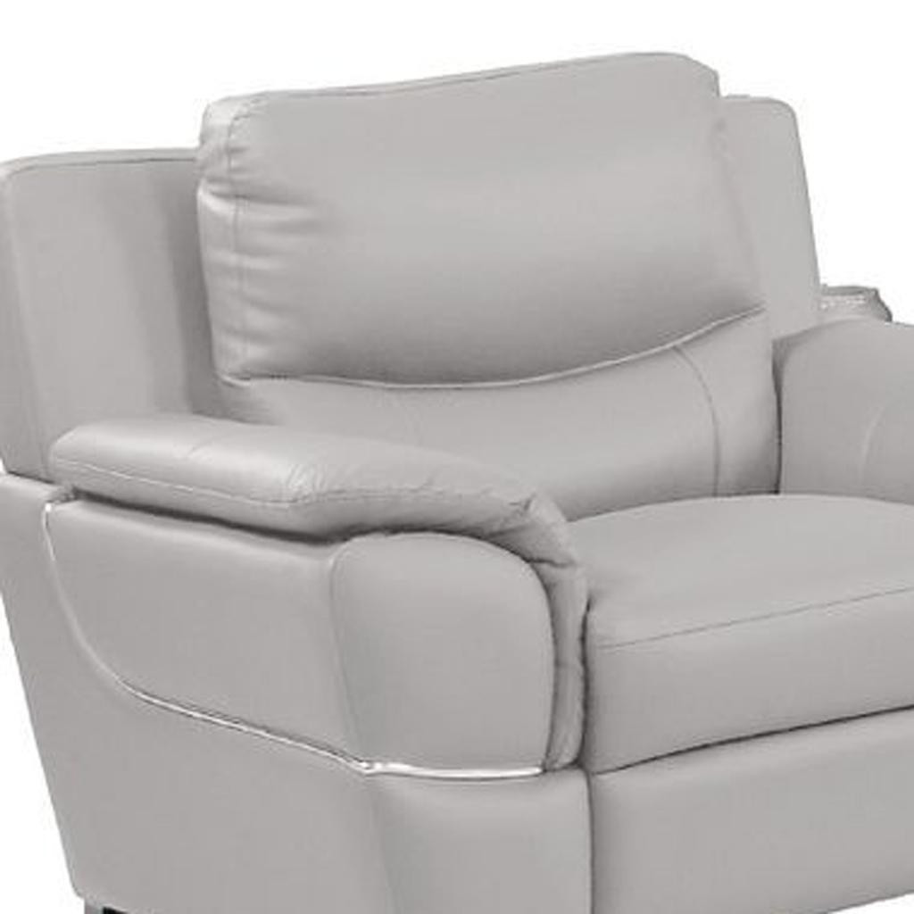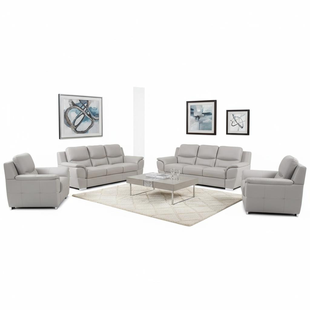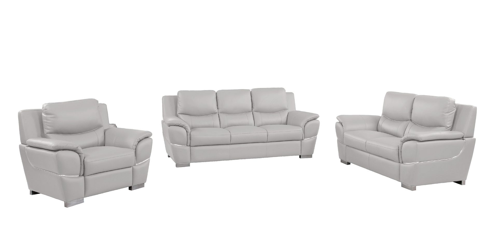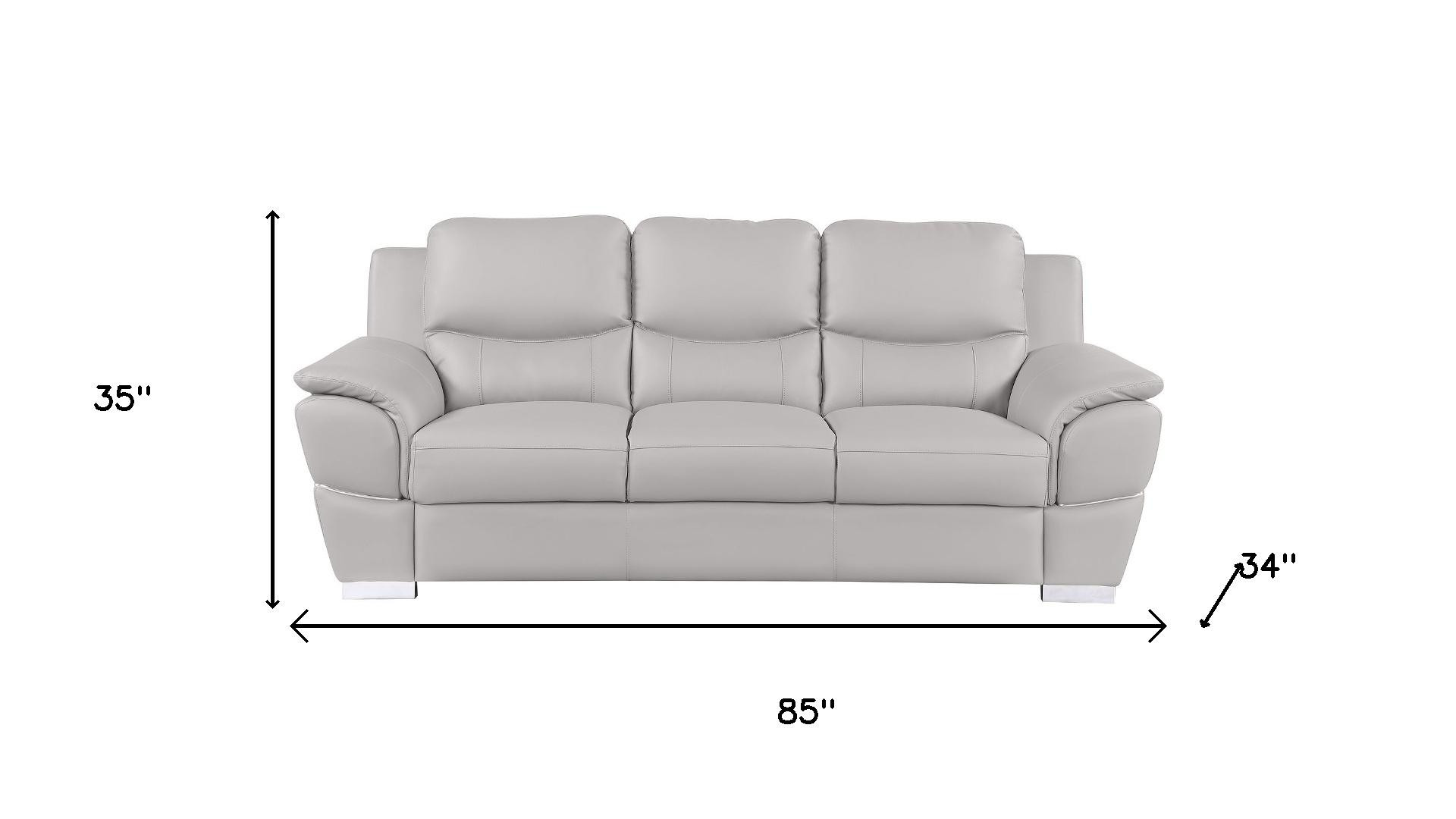 Prepare to amaze even the most discerning critics with our three piece light gray leather six person seating set. Upholstered in supple and luxurious leather, this set has a rich and warm appeal. Solid or two-tone colorations allow you to blend easily with most any decor. The presence of sinuous springs seat construction helps distribute weight evenly, reducing pressure points. The inclusion of a loveseat into your mix allows a fashionable seating option in a compact design. 35.00-inch h x 85.00-inch w x 34.00-inch d.