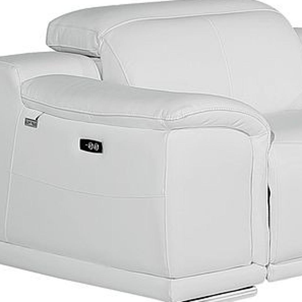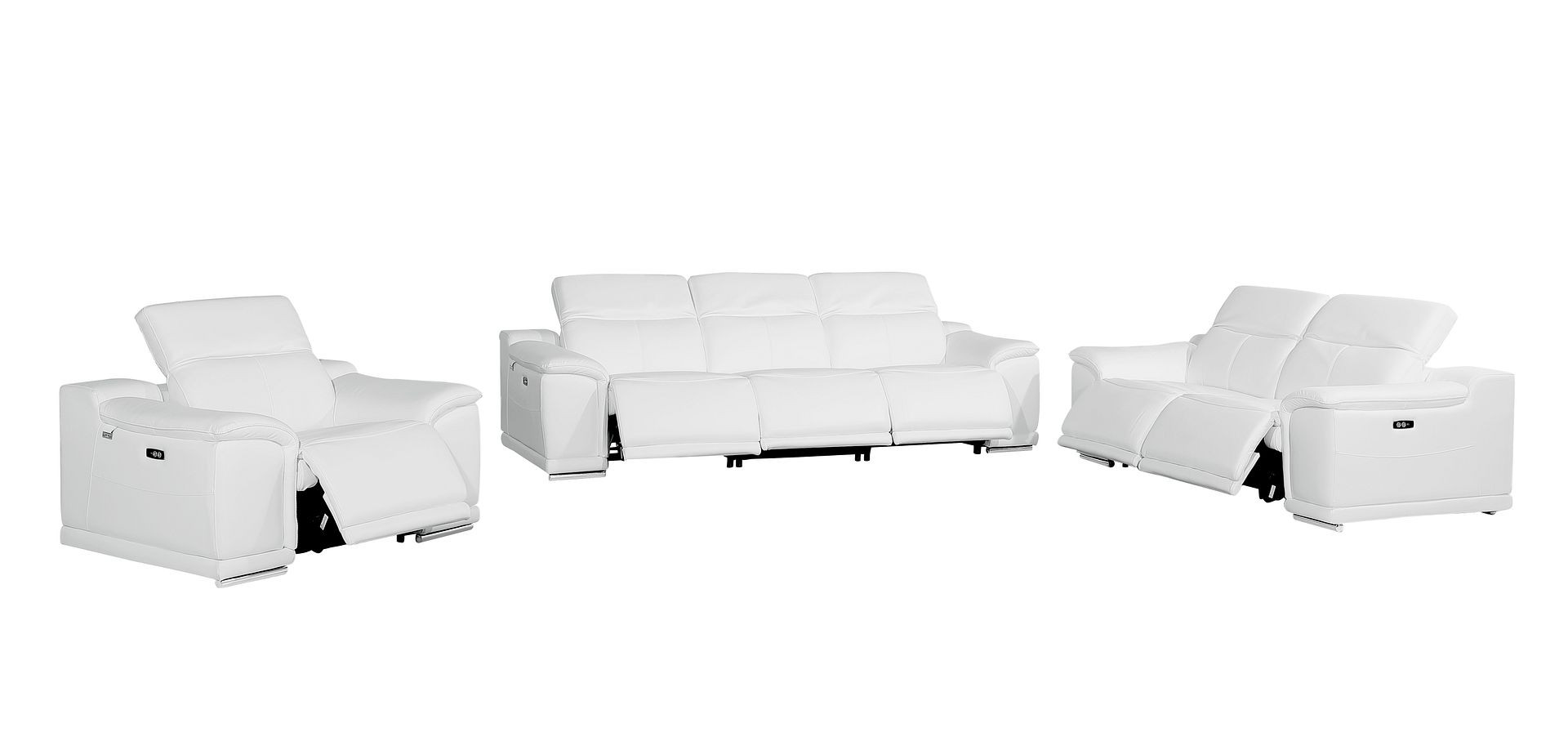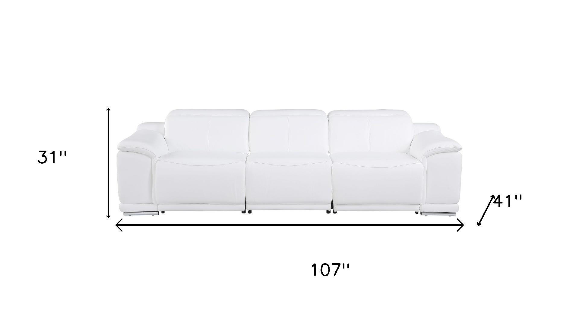 Prepare to amaze even the most discerning critics with our three piece white genuine leather six person seating set. Prepare to enter the realm of ultimate relaxation with this reclining sofa that offers unparalleled comfort and luxurious lounging. Upholstered in supple and luxurious genuine leather, this set has a rich and warm appeal. Solid or two-tone colorations allow you to blend easily with most any decor. Sinuous springs seat construction provides excellent comfort by offering a responsive and supportive seating experience. The inclusion of a loveseat into your mix allows a fashionable seating option in a compact design. 31.00-inch h x 107.00-inch w x 41.00-inch d.