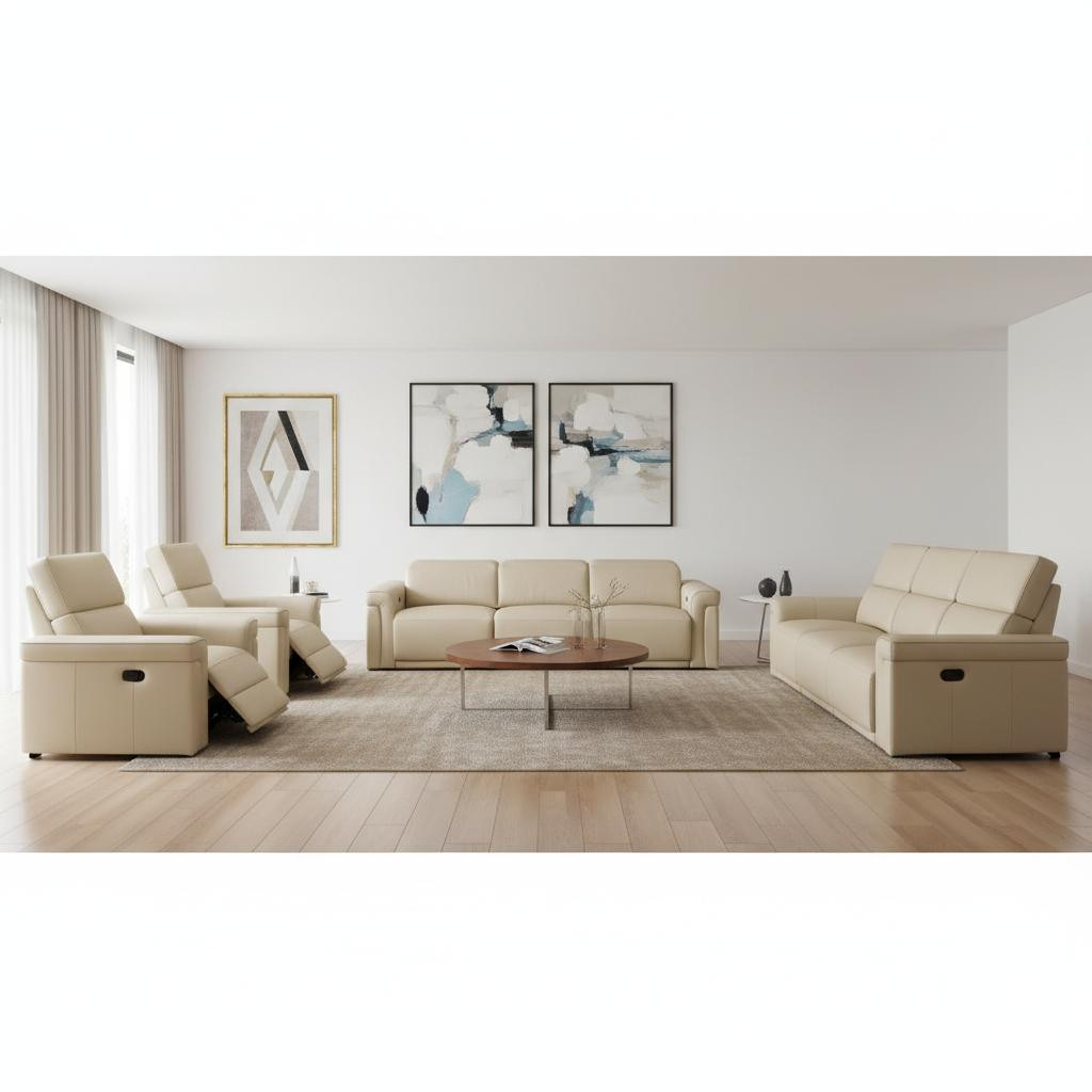 Step into a world of unparalleled seating comfort with our remarkable three piece beige italian leather six person seating set. Prepare to enter the realm of ultimate relaxation with this reclining sofa that offers unparalleled comfort and luxurious lounging. Upholstered in supple and luxurious italian leather, this set has a rich and warm appeal. Solid or two-tone colorations allow you to blend easily with most any decor. The presence of sinuous springs seat construction helps distribute weight evenly, reducing pressure points. The inclusion of a loveseat into your mix allows a fashionable seating option in a compact design. 39.00-inch h x 100.00-inch w x 41.00-inch d.