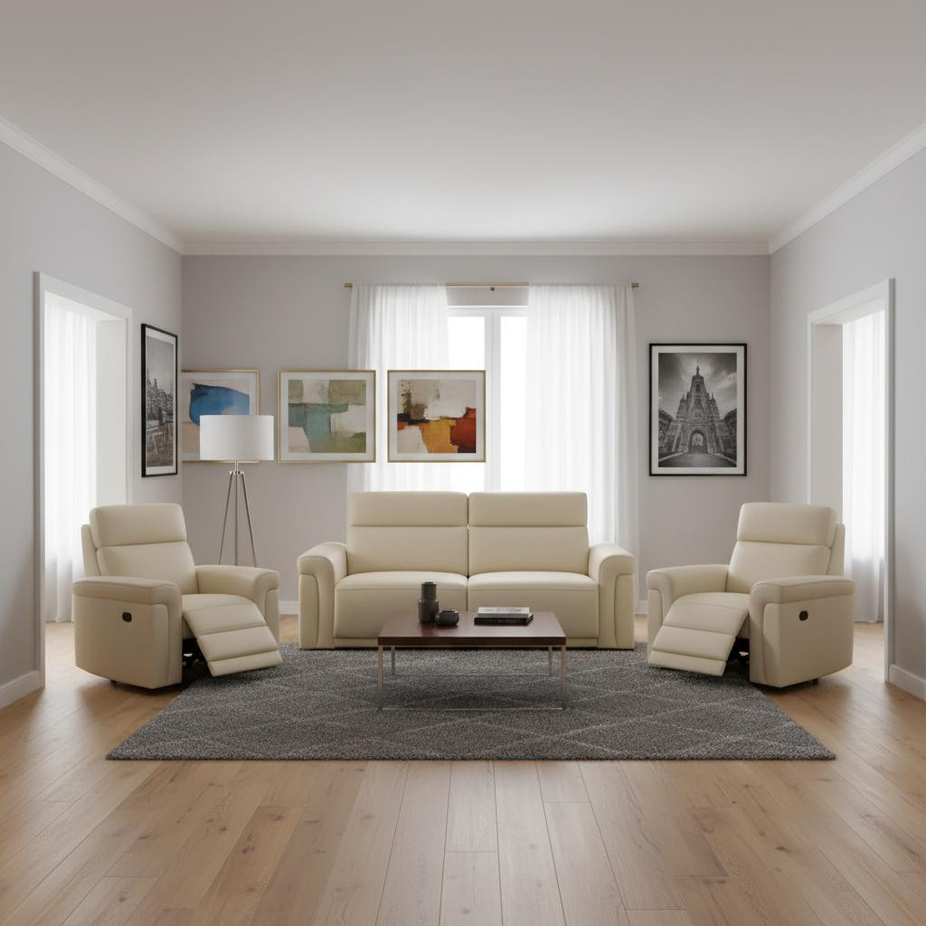 When it comes to indoor seating, this three piece beige italian leather six person seating set has everything you need to get set and ready to relax. The reclining sofa will transform your space into a cozy haven for leisurely activities, movie nights, or even quick power naps. Upholstered in supple and luxurious italian leather, this set has a rich and warm appeal. Solid or two-tone colorations allow you to blend easily with most any decor. Sinuous springs seat construction provides excellent comfort by offering a responsive and supportive seating experience. The inclusion of a loveseat into your mix allows a fashionable seating option in a compact design. 39.00-inch h x 80.00-inch w x 41.00-inch d.