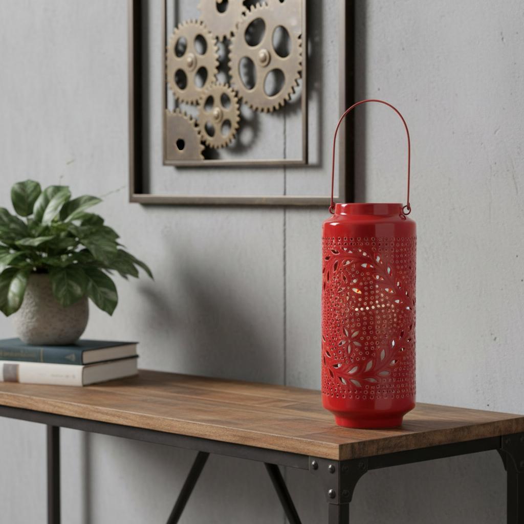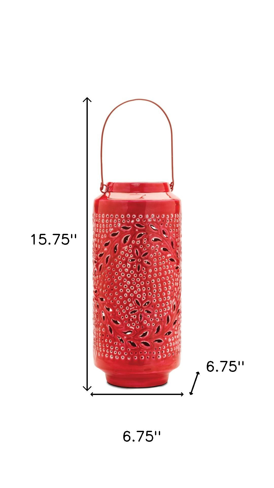 Stylize your tabletop, light up your back patio or add the perfect touch of low light to your living room with this 16-inch red abstract iron tabletop lantern candle holder. Add an extra pop of personality to every corner of your home with this gorgeous candleholder. Designed to accommodate a 4-inch wide pillar candle, this machine-made iron piece features an eye-catching abstract decoration pattern that enhances any setting. Perfect for cozy nights or festive occasions, it effortlessly combines function and style for a stunning visual impact. 15.75-inch h x 6.75-inch w x 6.75-inch d.