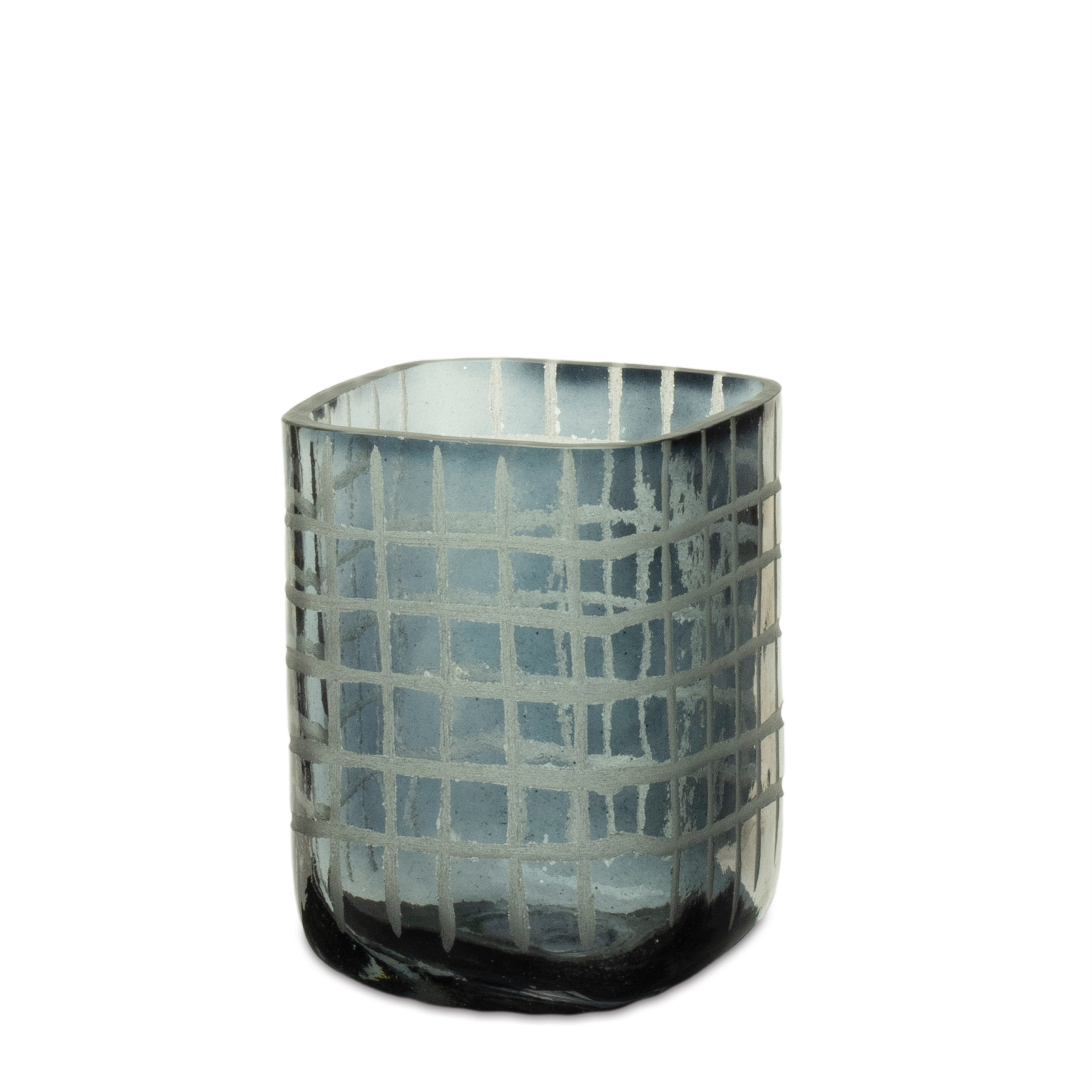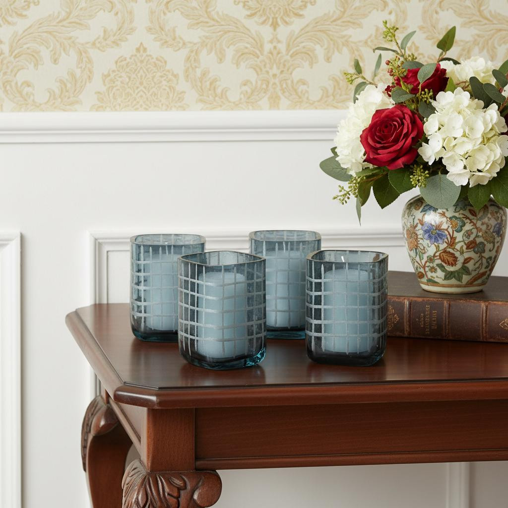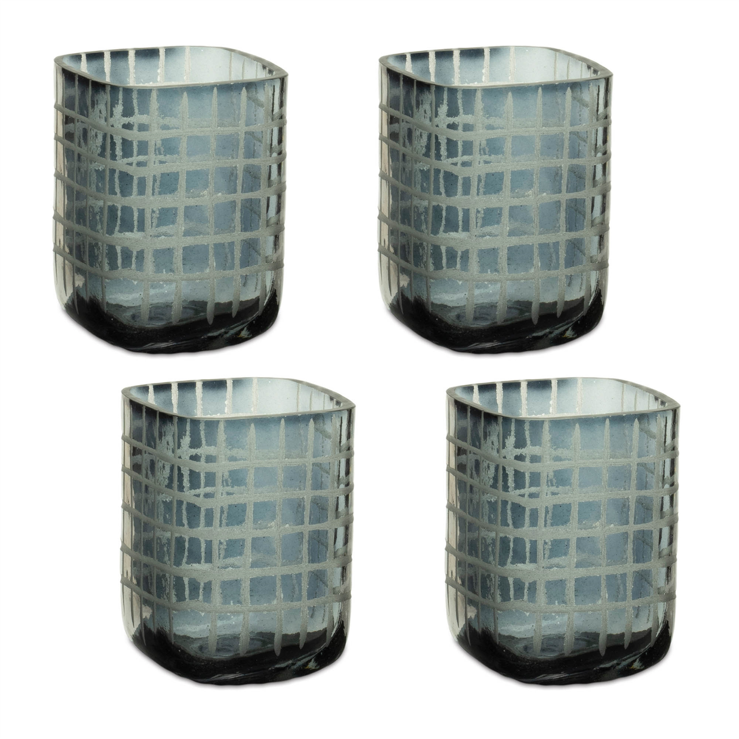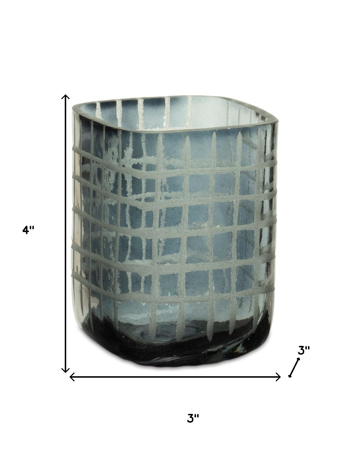 Create a warm and inviting environment in any space with this set of four blue abstract glass tabletop hurricane candle holders. Sold as a set of 4, this candleholder gives your space radiant illumination. Add an extra pop of personality to every corner of your home with this gorgeous candleholder candleholders are an attractive way to turn a simple candle into a piece of décor. 4.00-inch h x 3.00-inch w x 3.00-inch d.