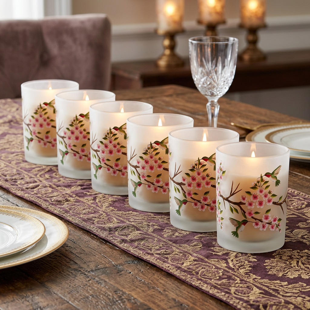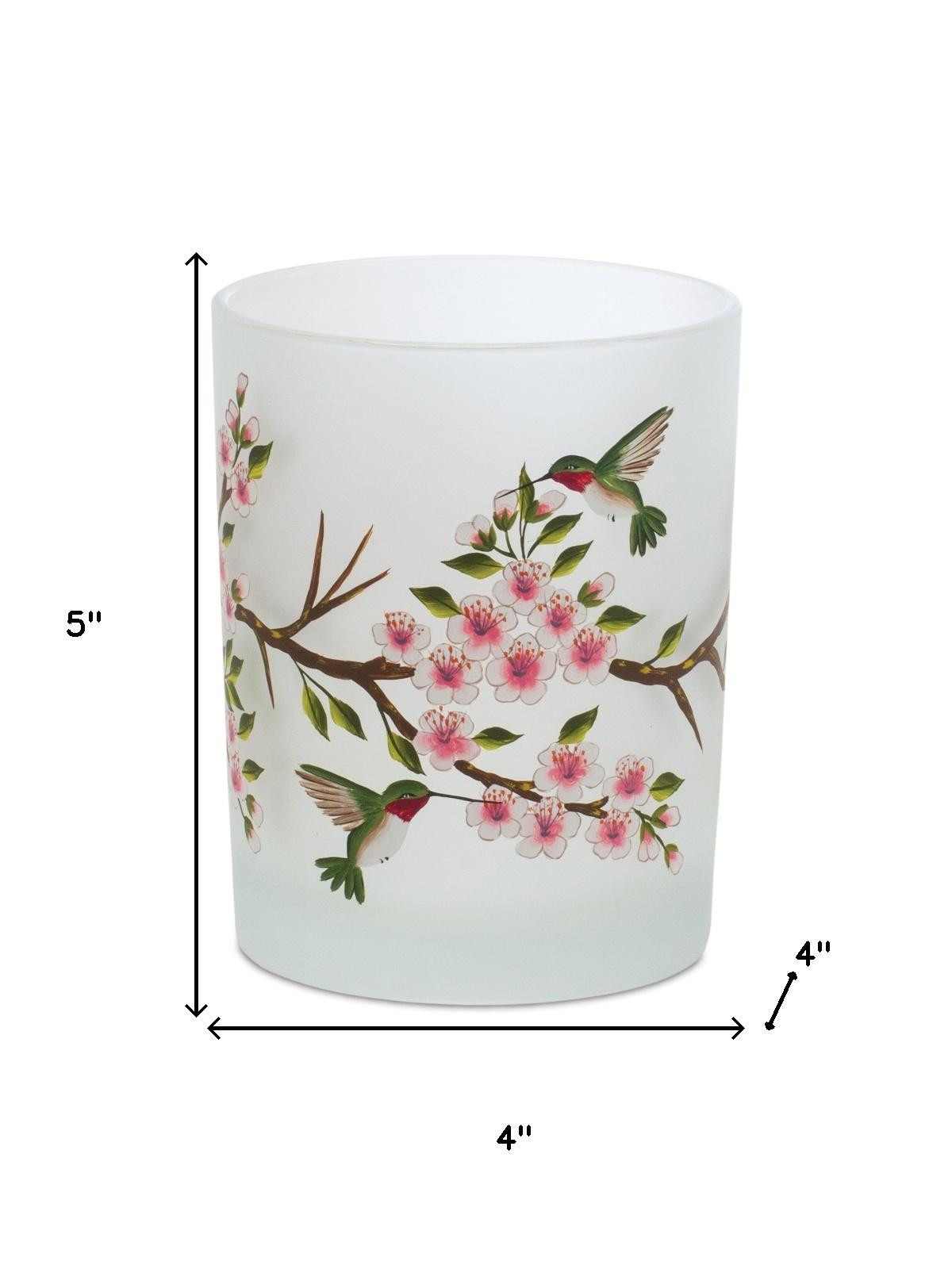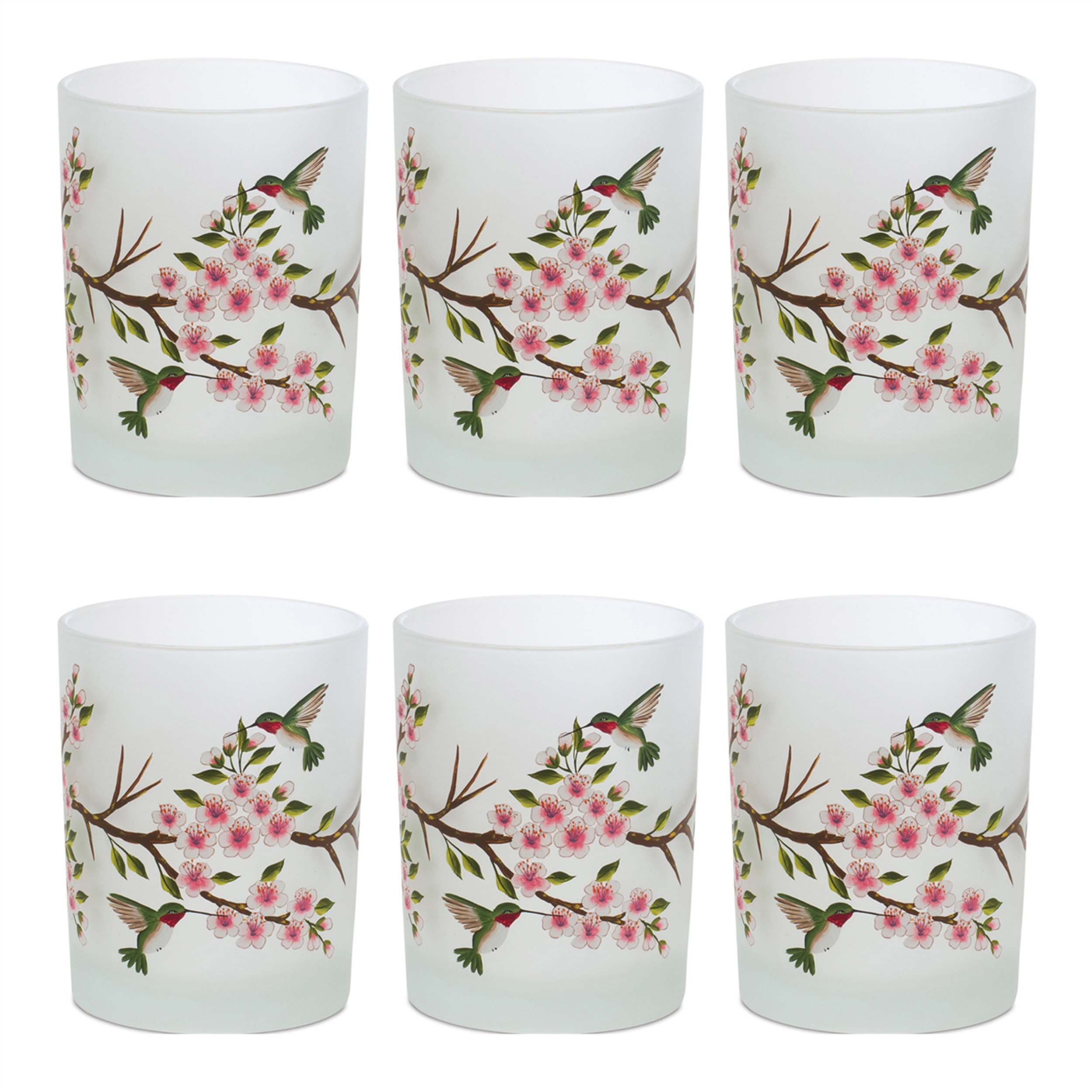 Decorate an end table, nightstand or desktop with this set of six white green and pink hummingbird floral glass votive candle holders. Sold as a set of 6, these candleholders make both the perfect gift and functional, decorative accents. Add an extra pop of personality to every corner of your home with these pretty frosted glass floral candleholders that add some attractive nature inspired decor to your space - with or without candles. 5.00-inch h x 4.00-inch w x 4.00-inch d.
