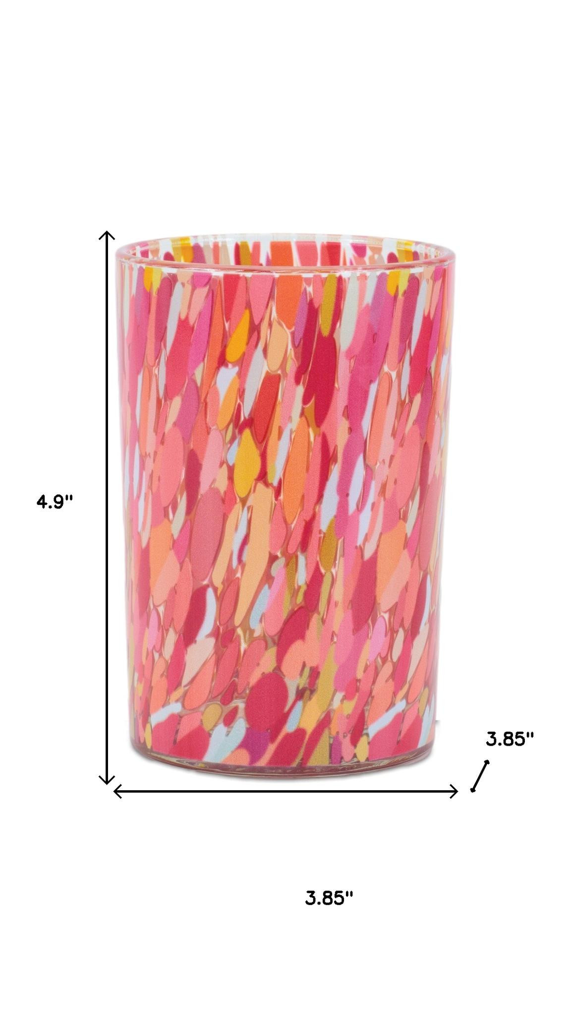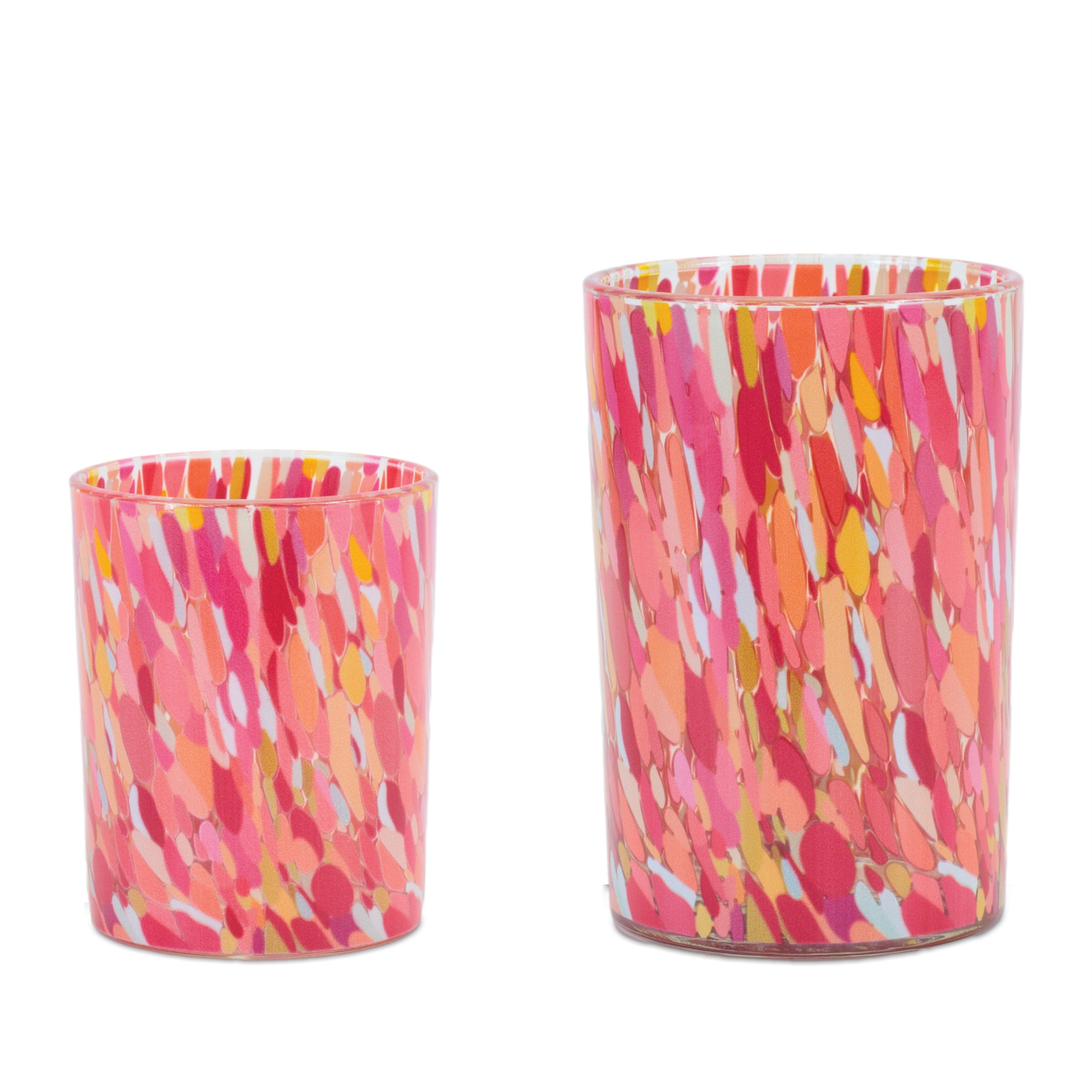 Bring the romantic glow of candlelight to your tabletop with this set of two pink distressed abstract glass tabletop hurricane candle holders sold as a set of 2, this candleholder makes both the perfect gift and functional, decorative accent. Dress up your home to impress every season with this fabulous candleholder. Candleholders are an attractive way to turn a simple candle into a piece of décor. 4.90-inch h x 3.85-inch w x 3.85-inch d.