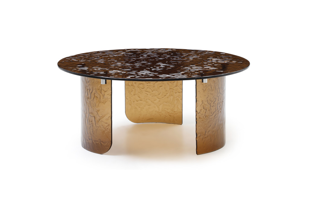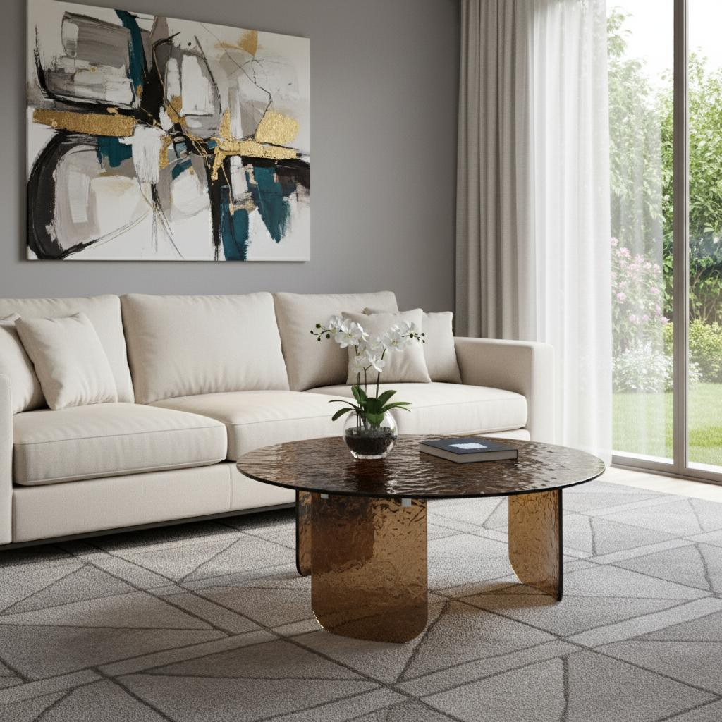 Make your living room or family room really stand out with this 35-inch bronze glass round coffee table. This modern table is made from textured colored glass in a bronze color throughout the base and top. It has an attractive dimpled design that will definitely breathe some fresh air into your interior. 14.00-inch h x 35.00-inch w x 35.00-inch d.