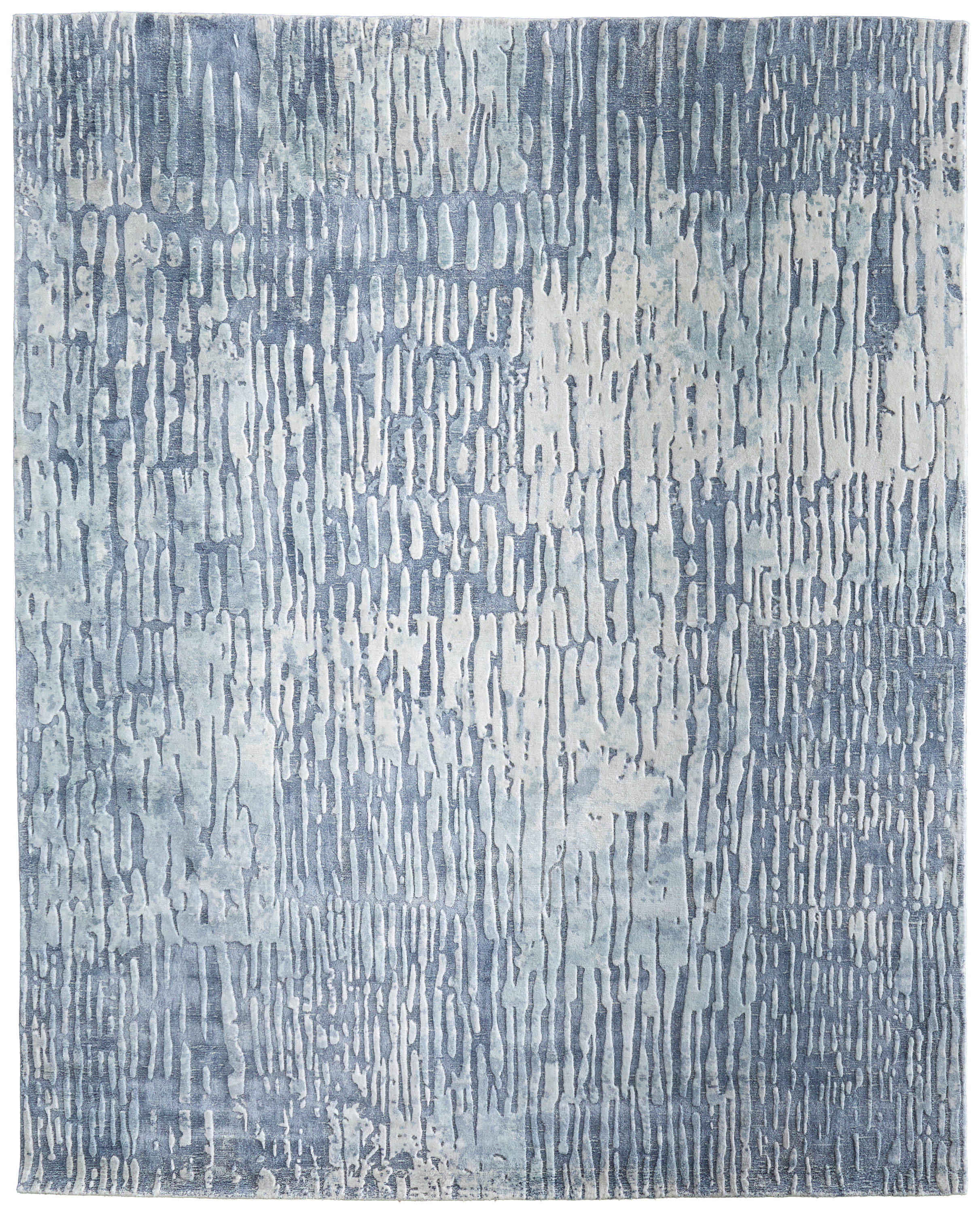 This 8-foot x 10-foot blue and ivory abstract hand woven area rug, is a great way to add warmth to a room. Ideal for spaces with kids and pets, this rug is stain resistant to help repel dirt and spilled liquids. Crafted by skilled artisans, this hand woven rug is genuine and unique. No two will be exactly alike. Crafted from wool blend fibers that give this piece premium texture, refinement, and appeal. This larger sized, industrial styled rug is ready to create a focal point or statement piece in your room. 95.00-inch h x 120.00-inch w x 0.39-inch d.